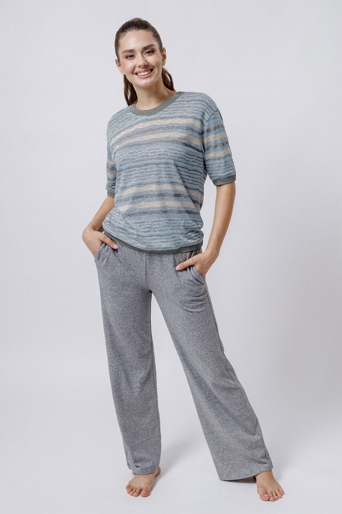 Футболка свободного кроя, втачной рукав. Длина рукава до локтя, О-вырез. Горловина, низ рукавов, низ изделия обработан подвязом. Прямые брюки, карман в боковом шве.
