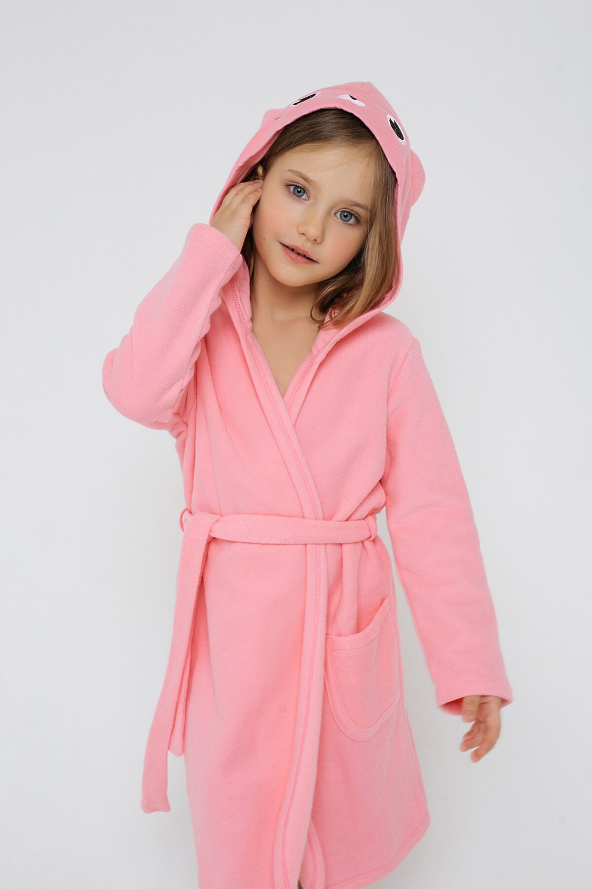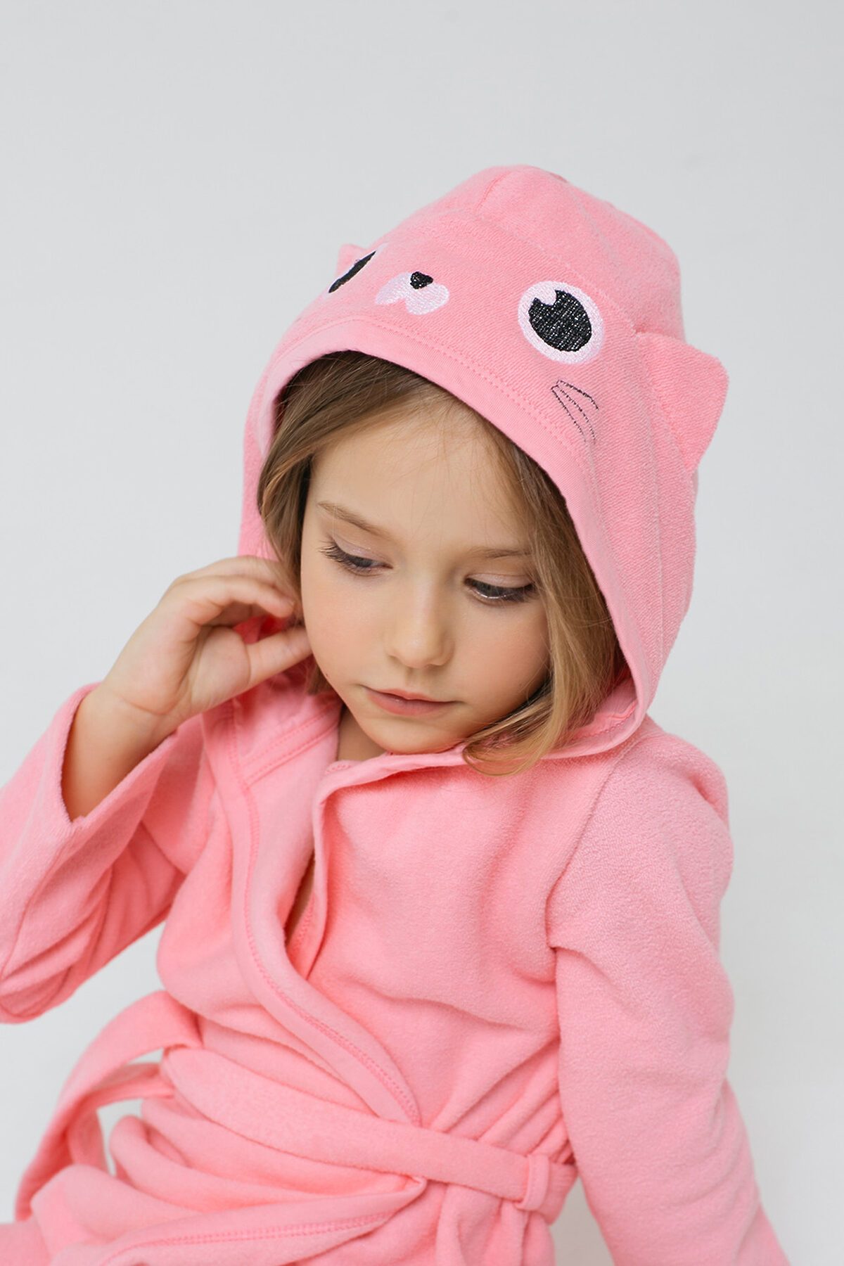 Однотонный махровый халат с поясом. Подкладка капюшона из гладкого хлопка. Длинные рукава. Накладной карман уходящий в шов. Пояс продет в шлевки. На капюшоне вышивка и вшитые декоративные ушки.
