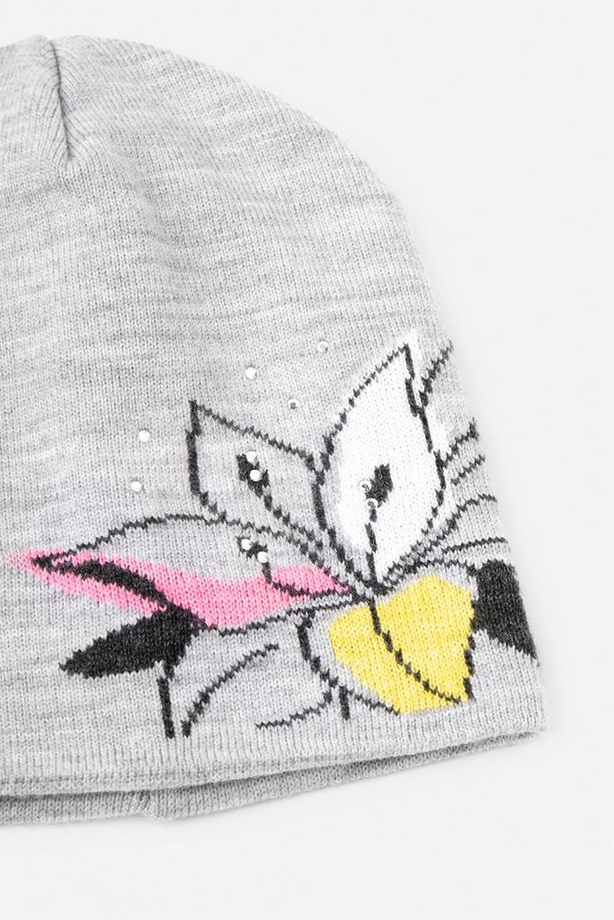 Двойная шапка из полушерсти. Украшена вывязанным рисунком с изображением цветов и блестящими стразами.
