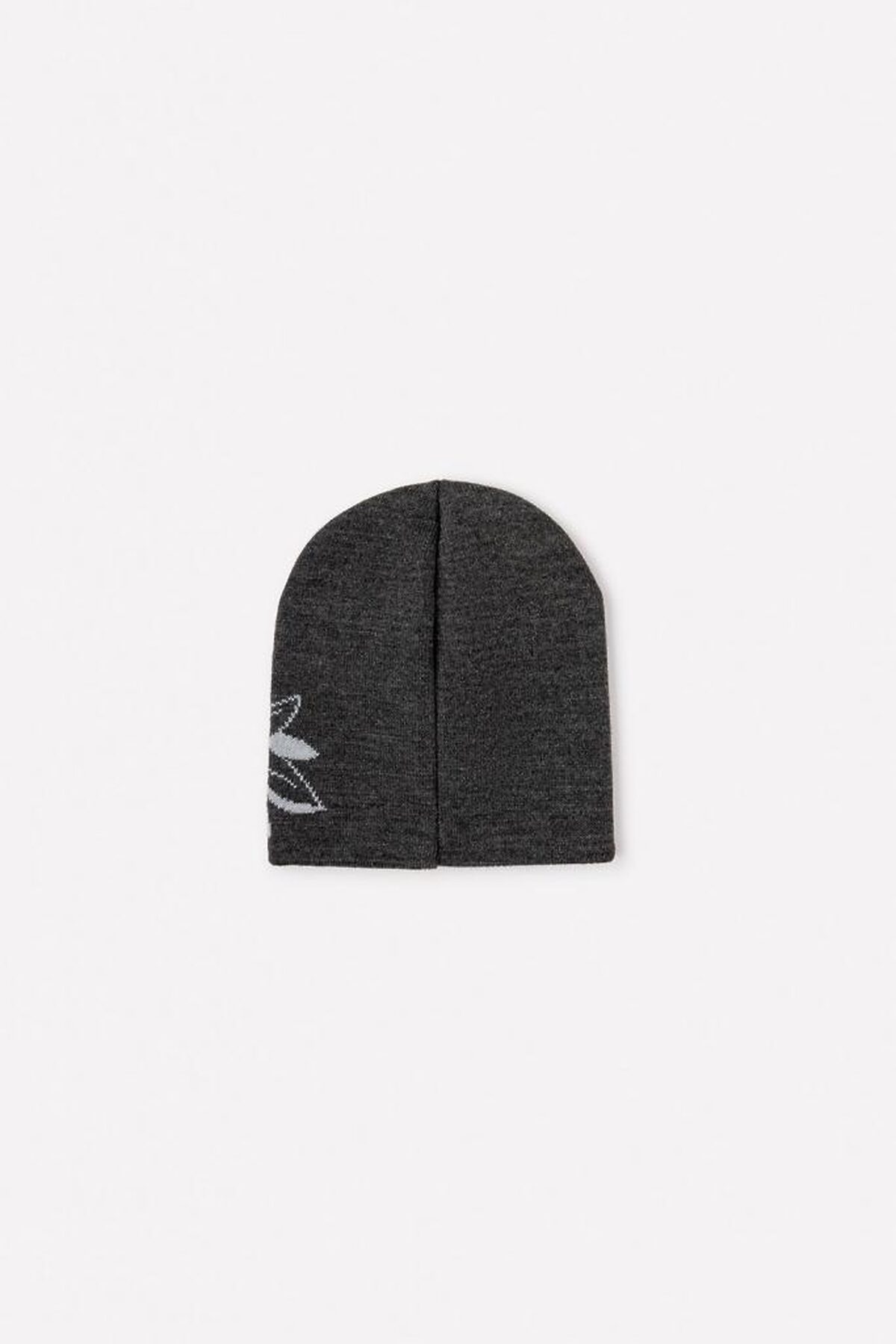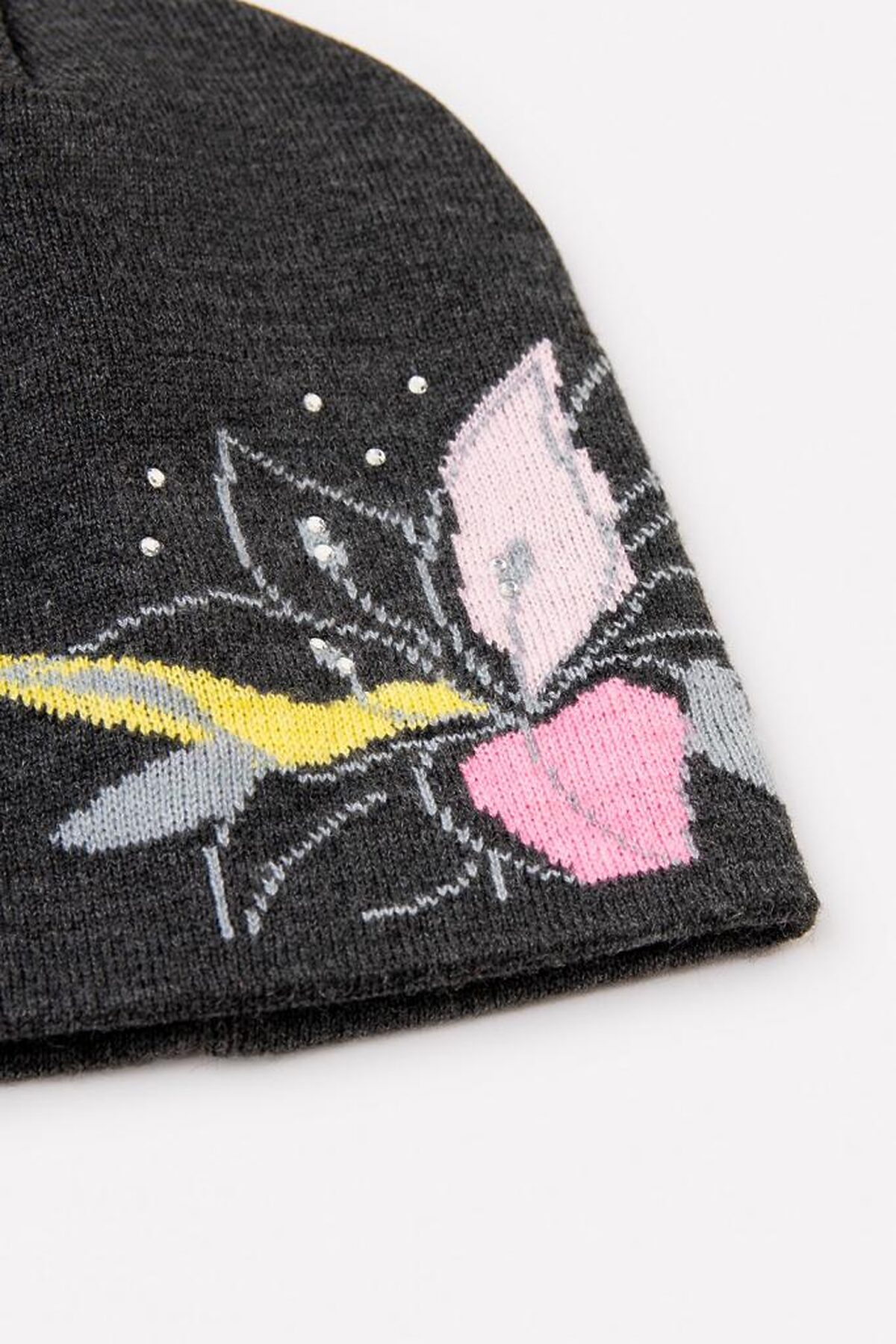 Двойная шапка из полушерсти. Украшена вывязанным рисунком с изображением цветов и блестящими стразами.