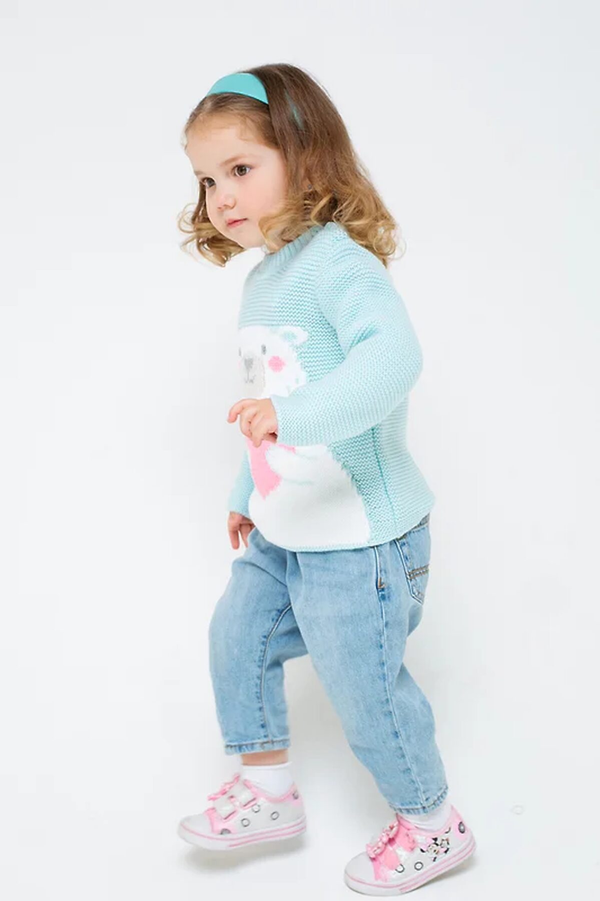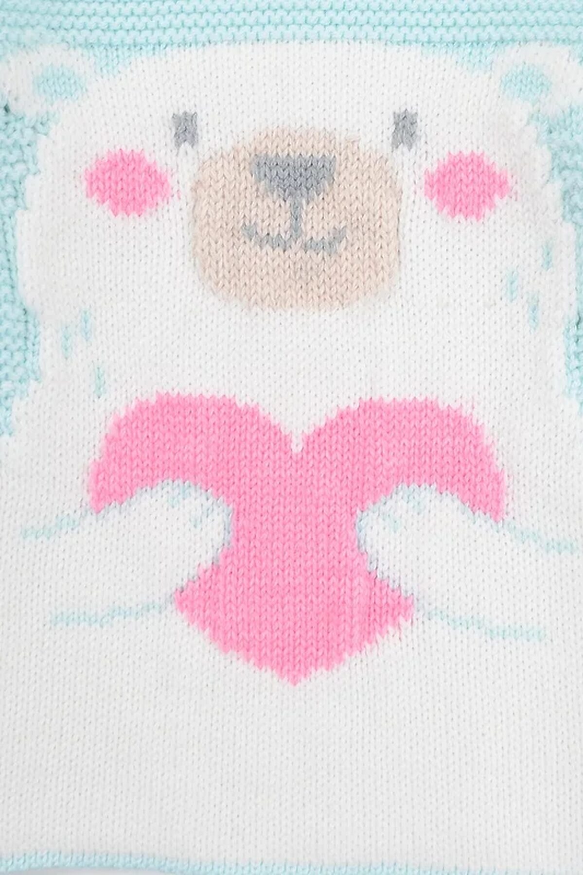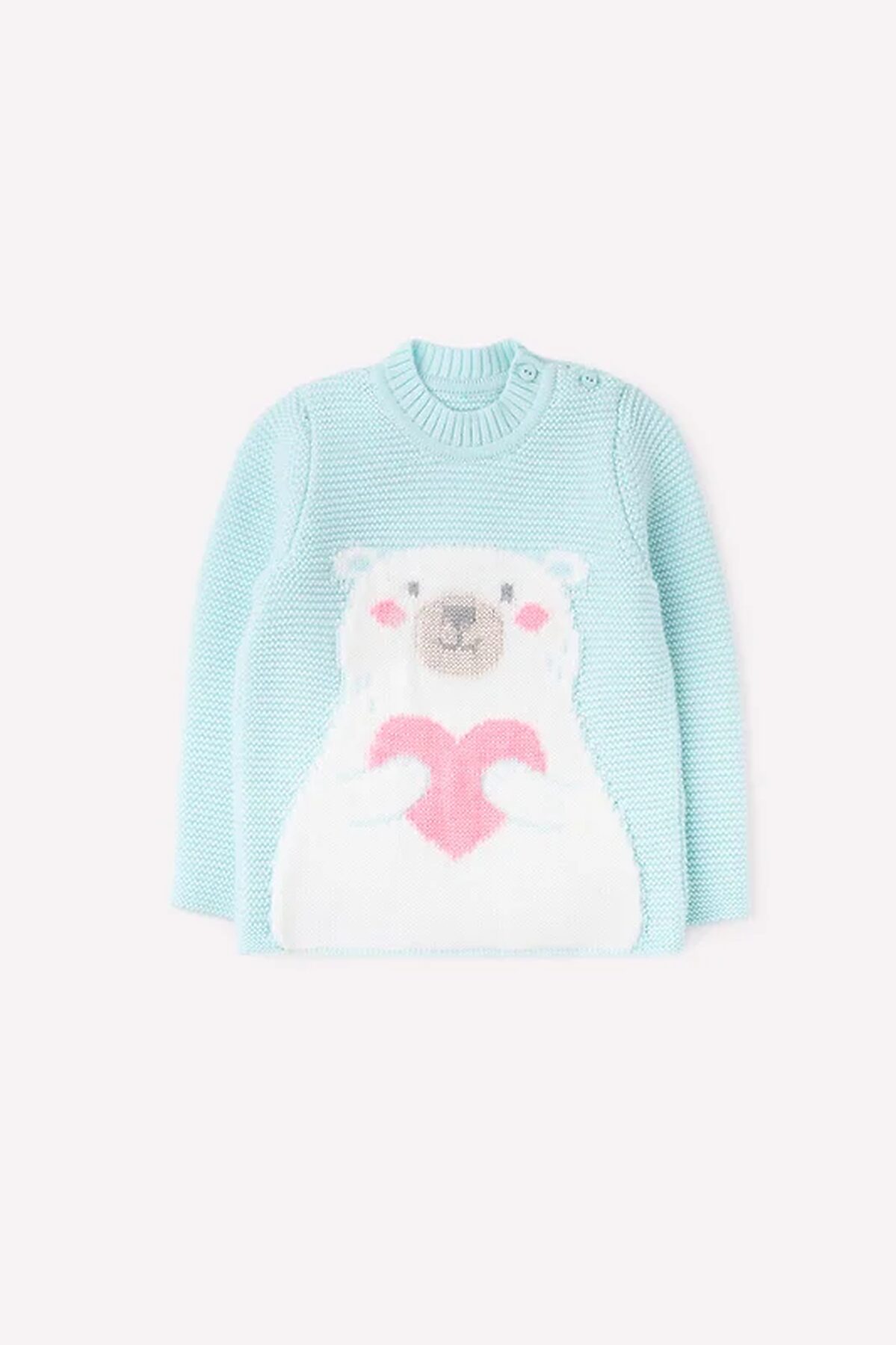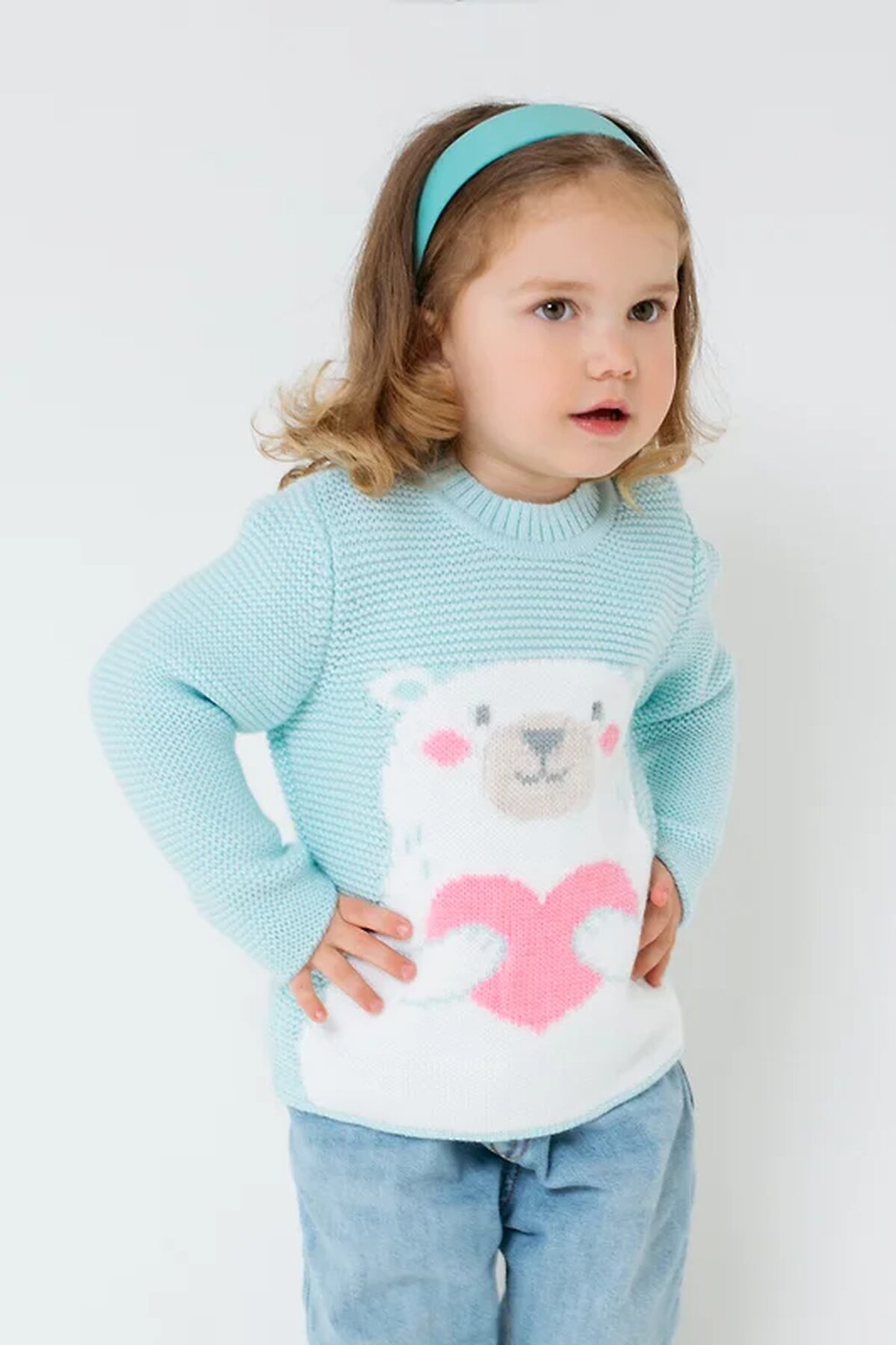 Светло-бирюзовый джемпер с круглой горловиной. На груди - вывязанный рисунок с изображением мишки. Выполнен двухизнаночной вязкой. Застёгивается на 2 пуговицы на плече.