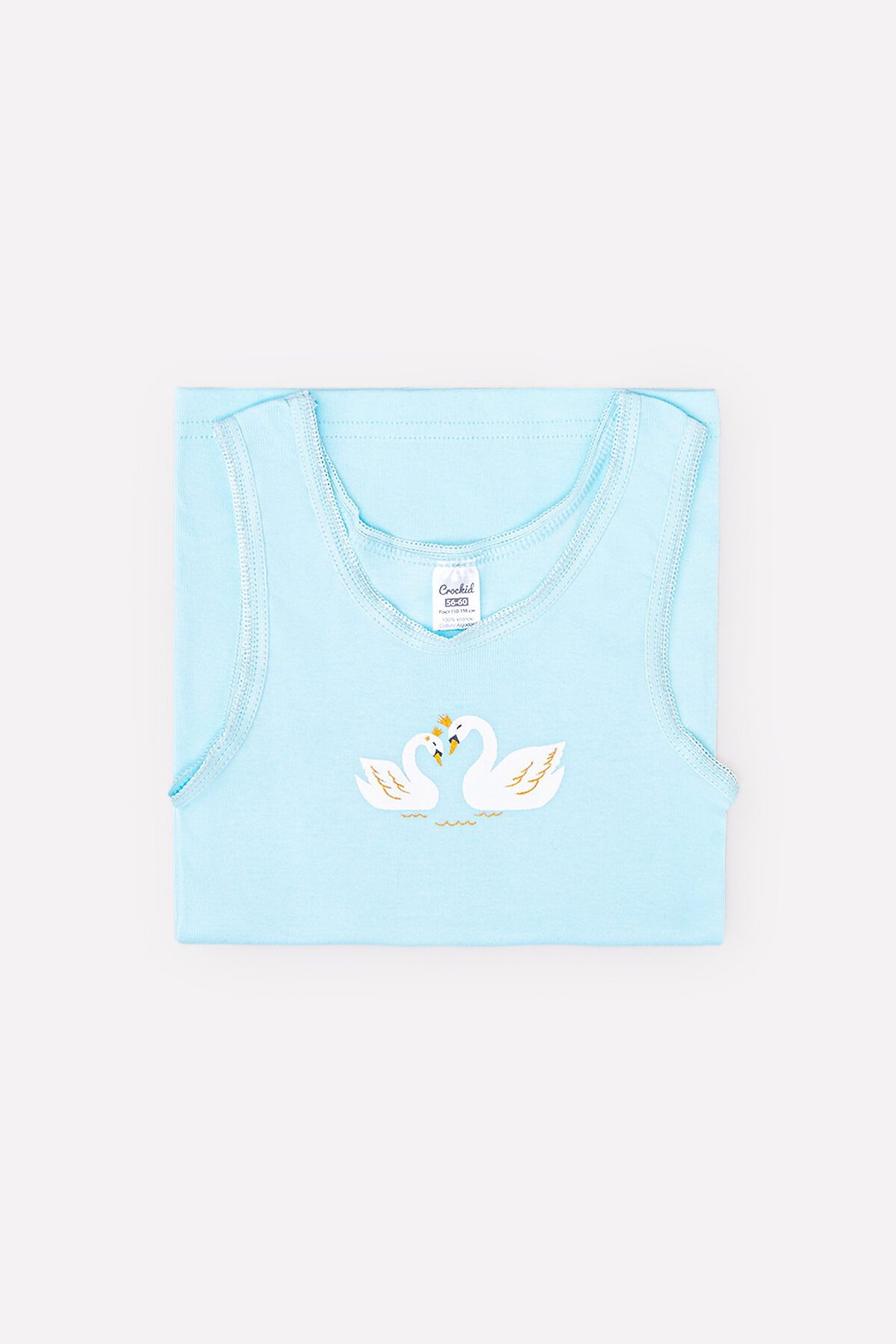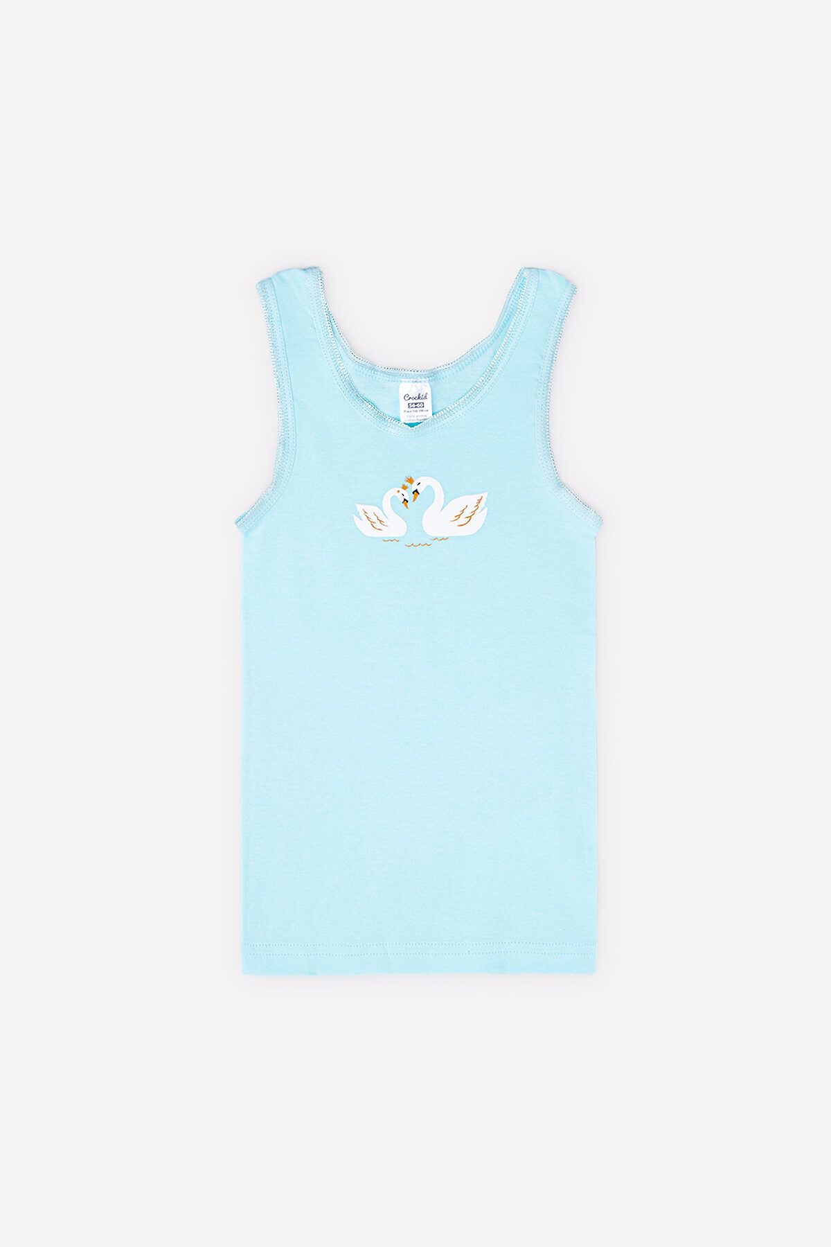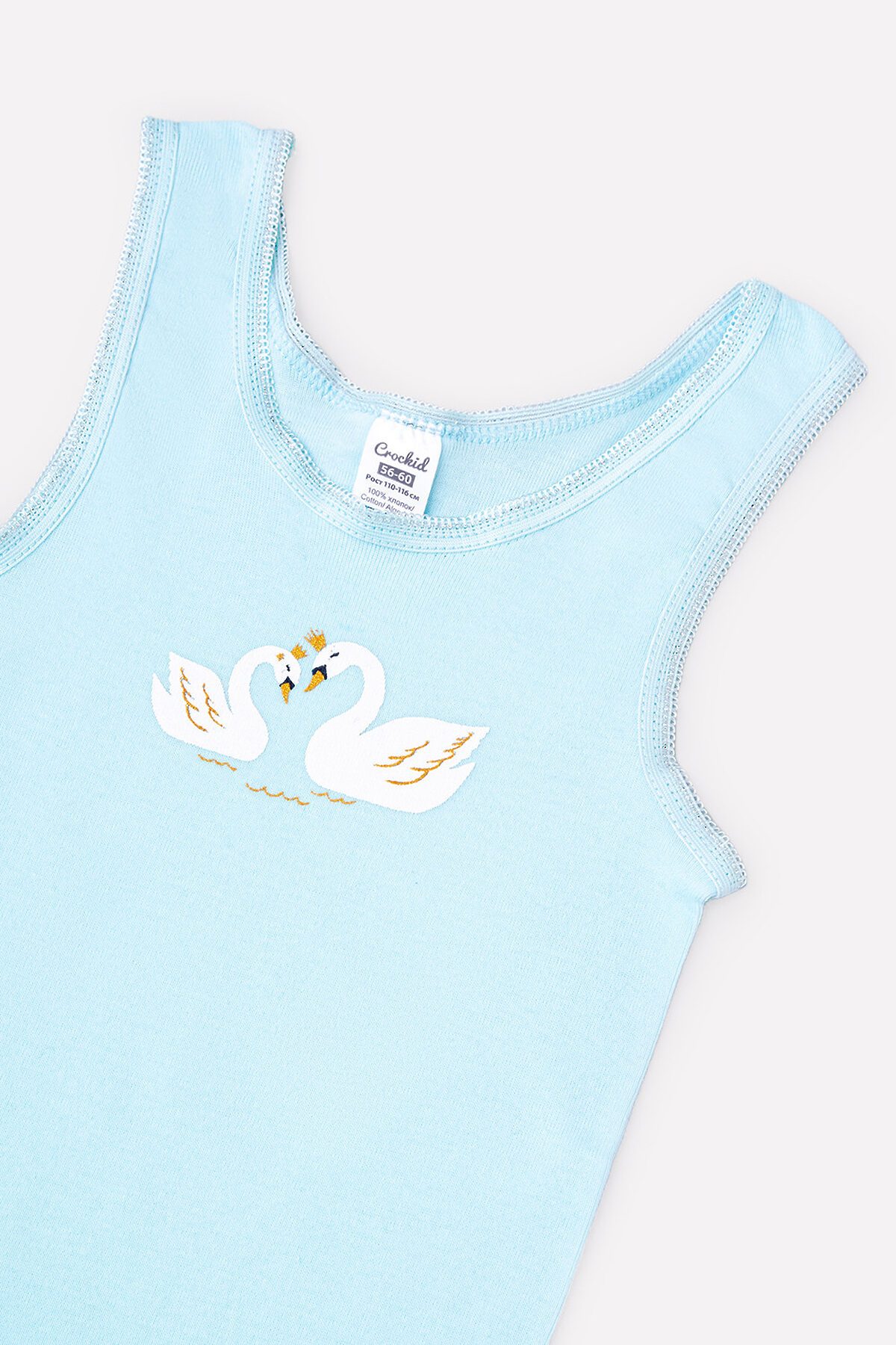 Хлопковая голубая майка для девочки на широких лямках. Украшена изображением двух лебедей в коронах из золотого глиттера. Горловина и проймы обработаны голубой резинкой.