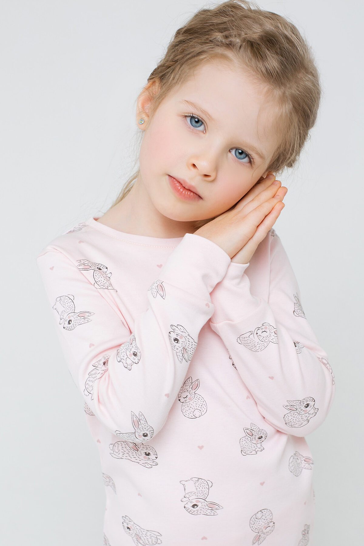 Пижама для девочки из мягкого трикотажа интерлок пенье - джемпер с длинными рукавами и брюки. Украшена набивным рисунком. На рукавах - широкие манжеты, низ обработан плоскими швами. В брюках эластичный пояс на резинке и мягкие манжеты.
