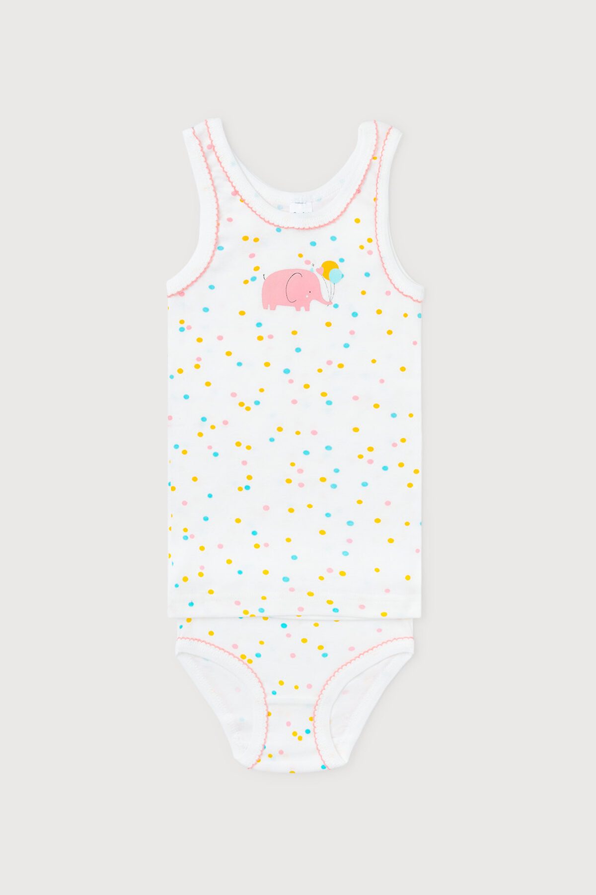 Комплект для девочки - майка на лямках и трусы из натурального хлопка. Сшит из эластичного материала рибана пенье. Набивной рисунок на майке, принт в области груди. Горловина и проймы обработаны бейкой. Бантик на трусиках.