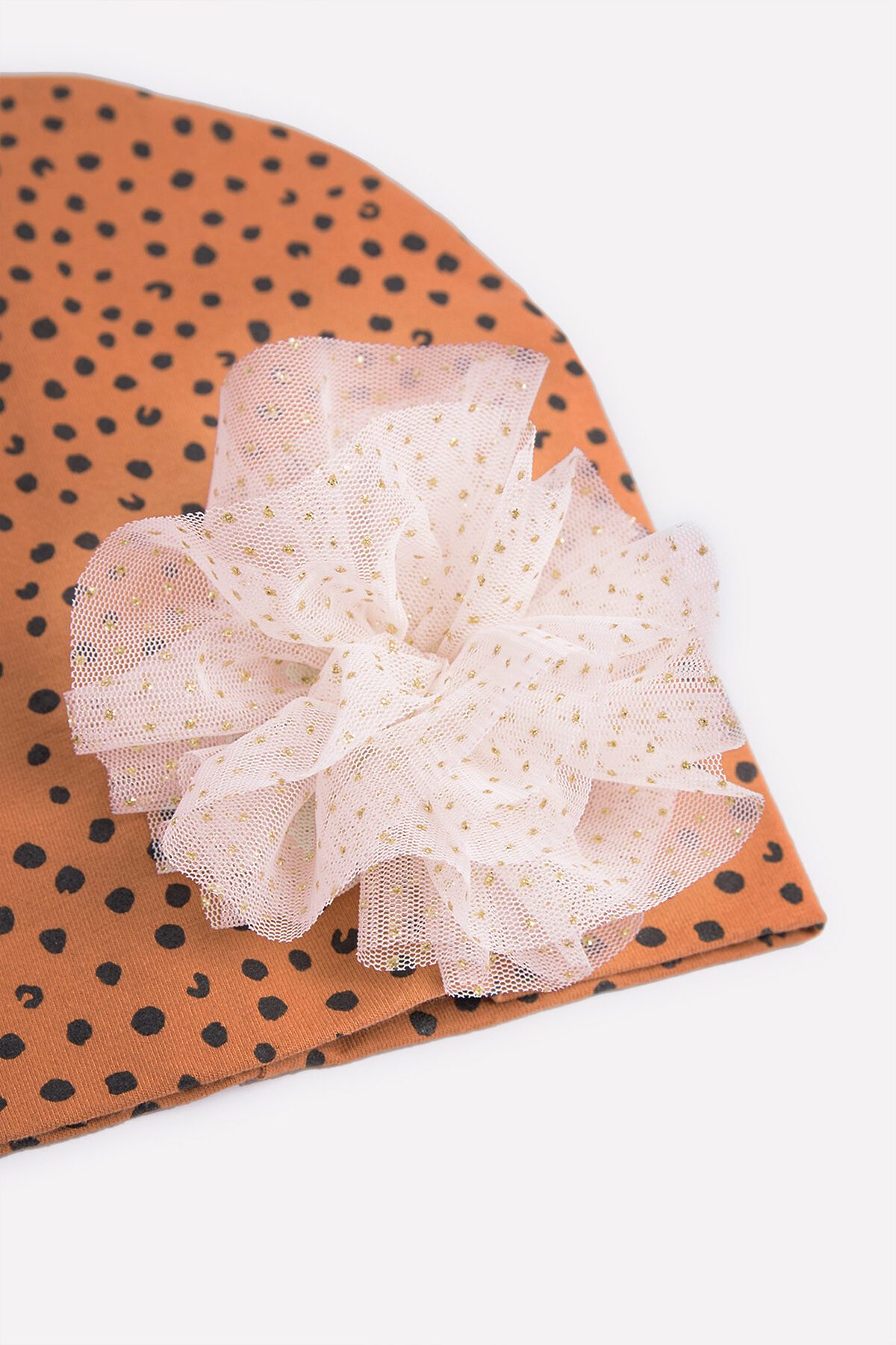 Шапка для девочки миндального оттенка с набивными пятнышками. Выполнена из трикотажа супрем с эластаном. Украшена цветком из сетки.
