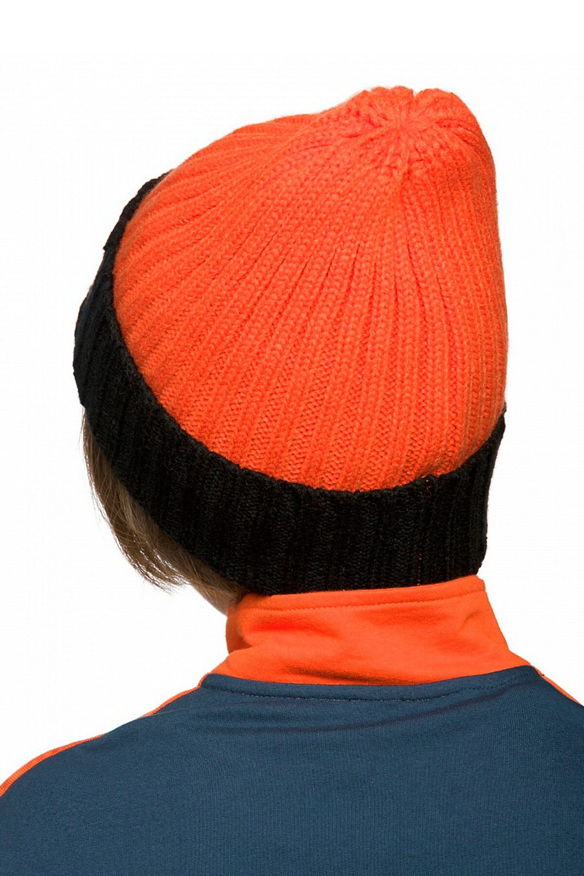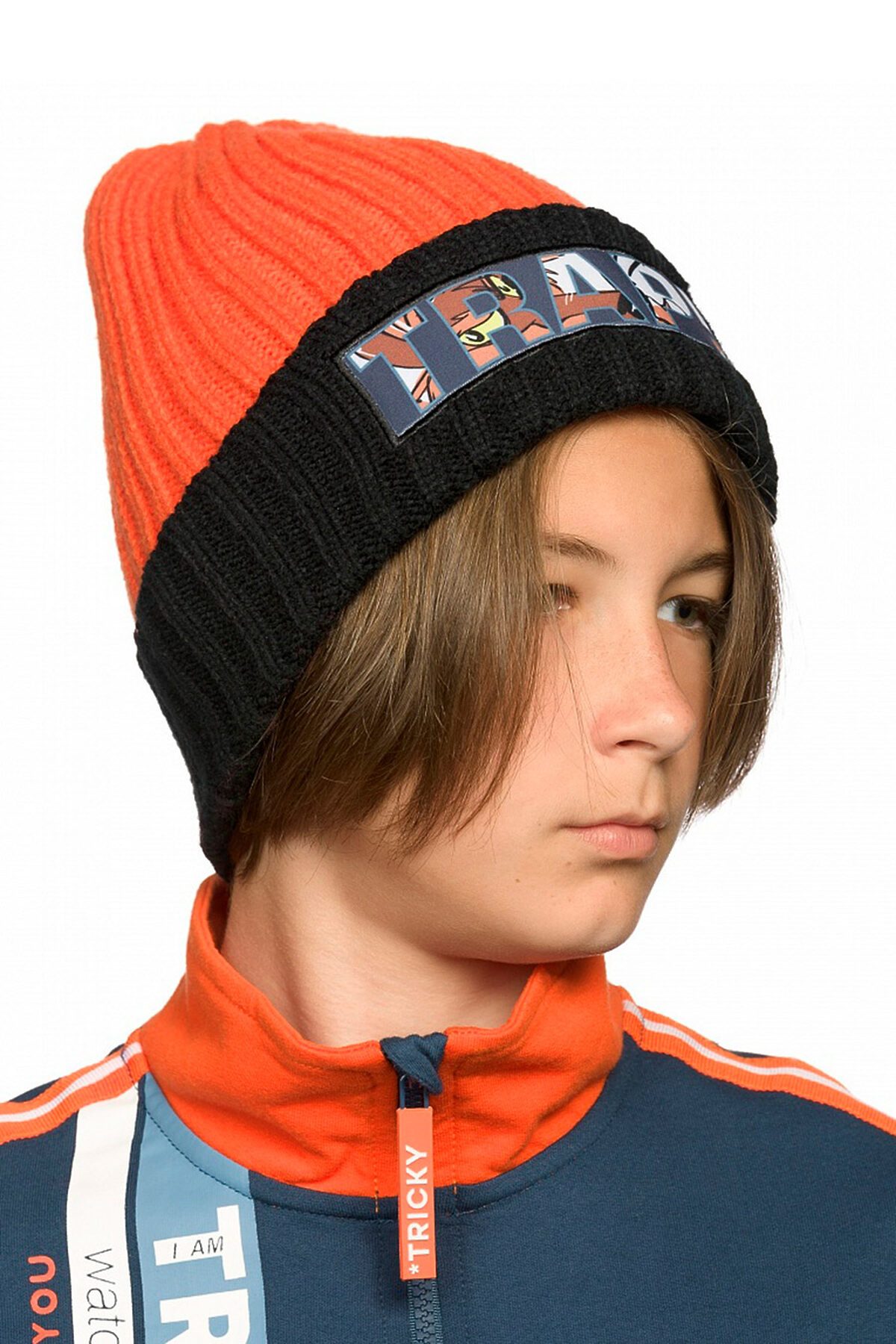 Шапка для мальчиков вытянутой формы с отворотом и подкладом из флиса. Вязка 2*2. На отвороте принтованная нашивка Ловушка.