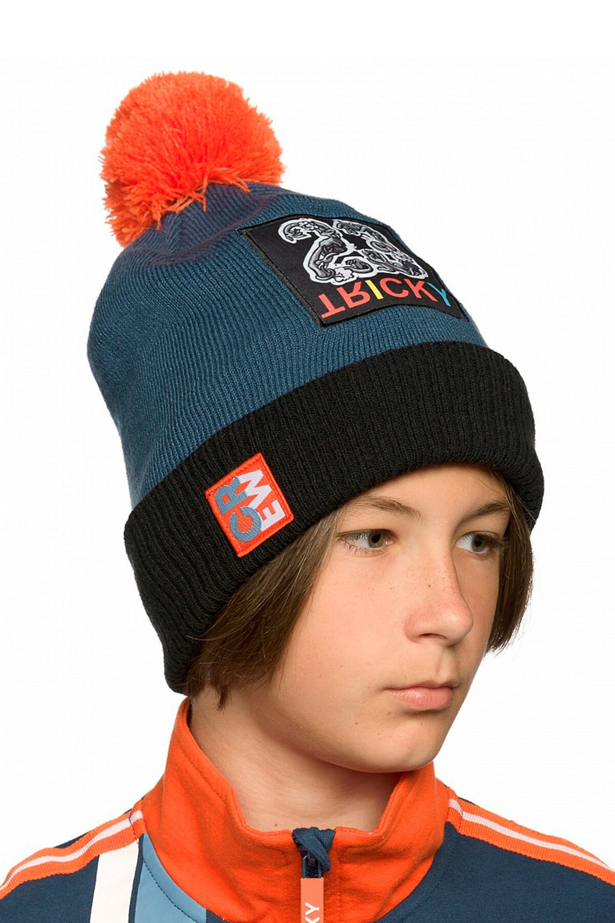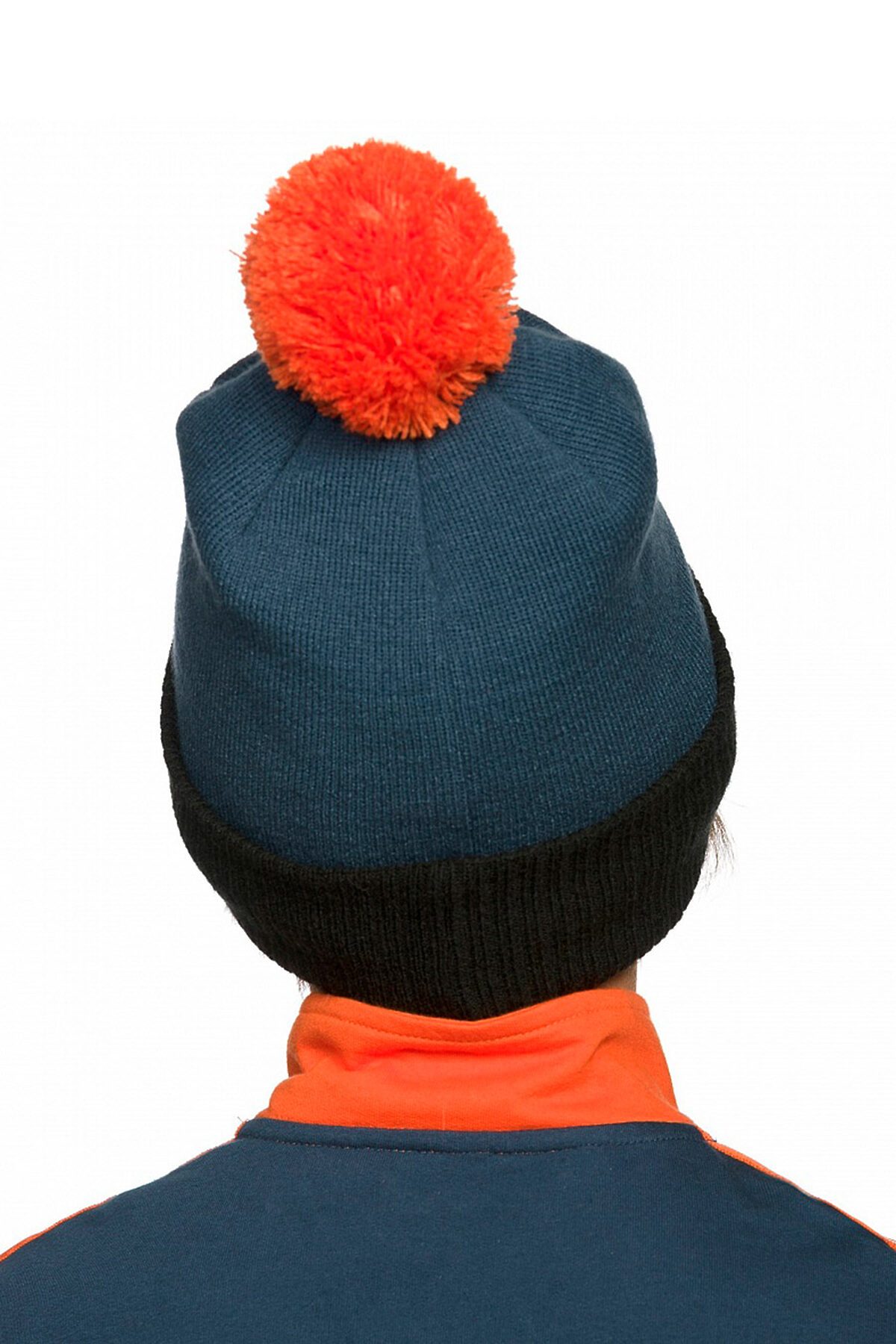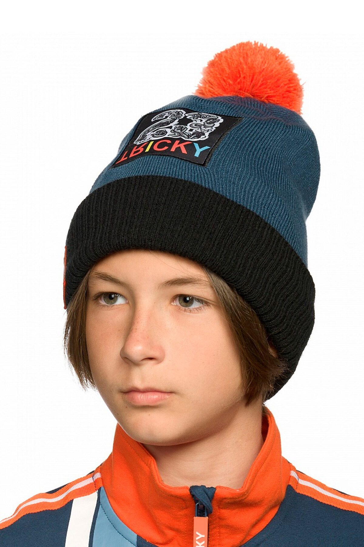 Шапка для мальчиков слегка вытянутой формы, с отворотом и подкладом из флиса. По переду принтованная нашивка 23 хитрый, на отвороте woven label команда. На макушке большой помпон из ниток.