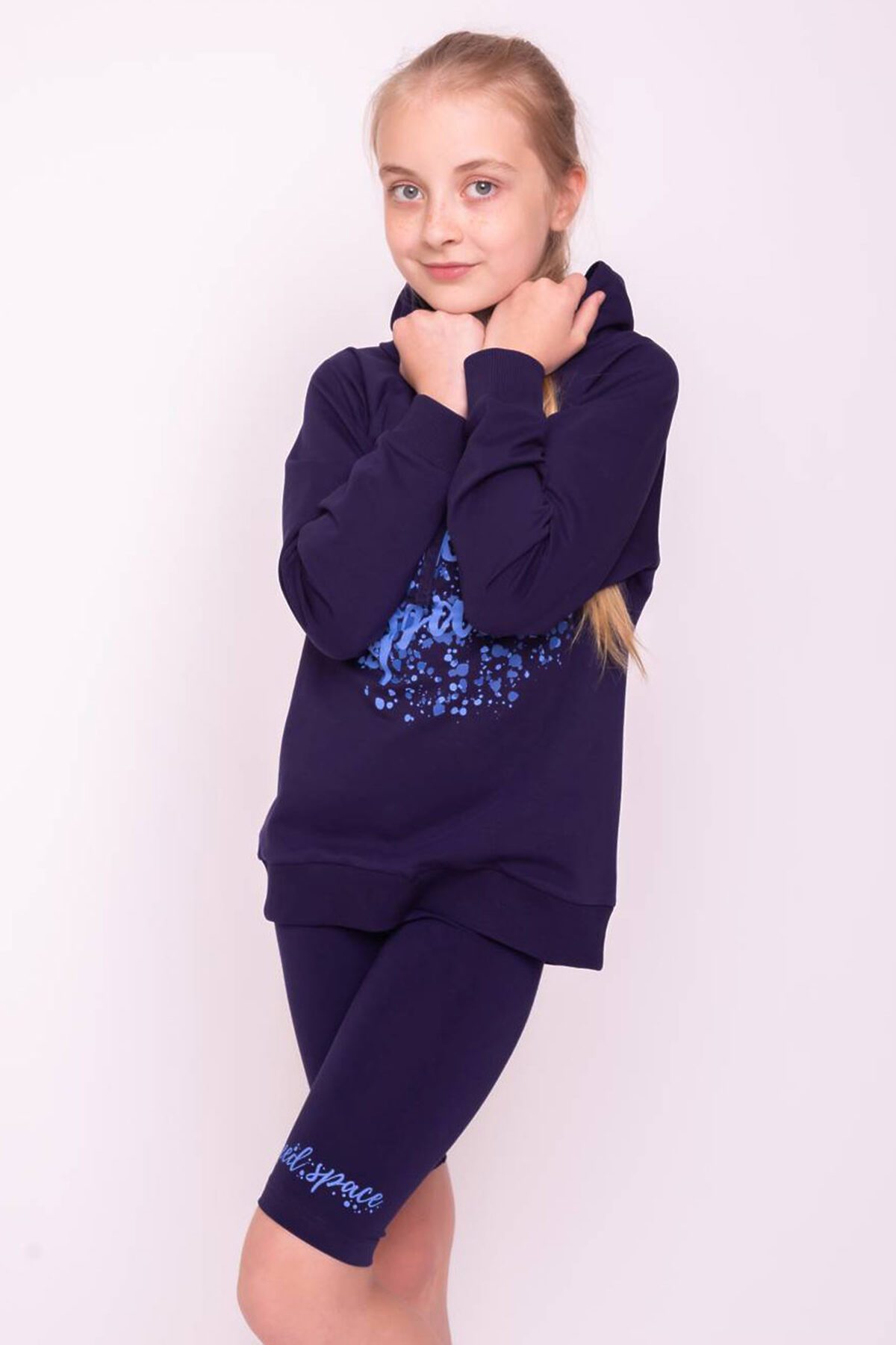 Велосипедки для девочек синего цвета из супрема. Облегающие шорты с поясом на резинке с надписью на одной стороне.