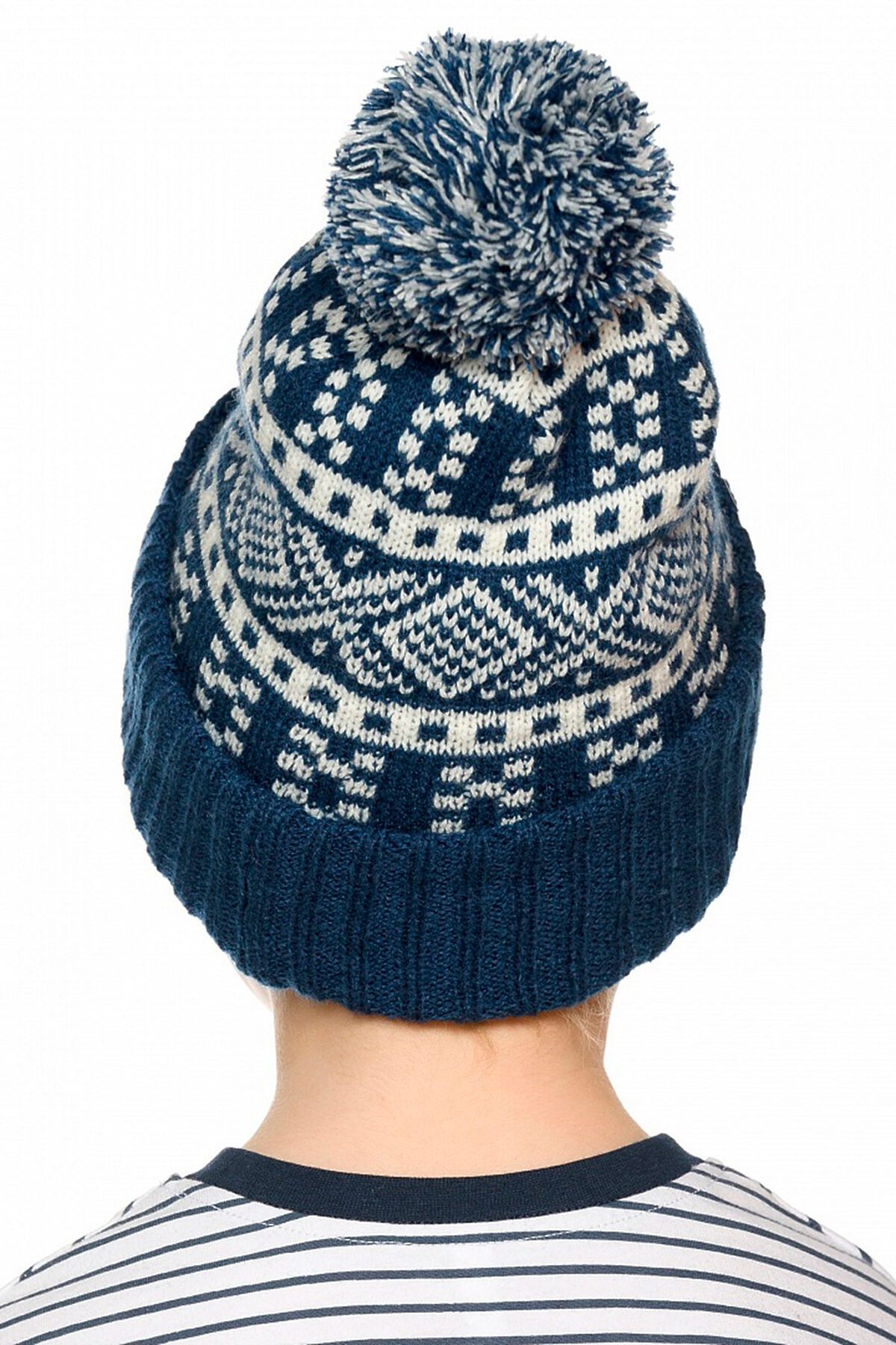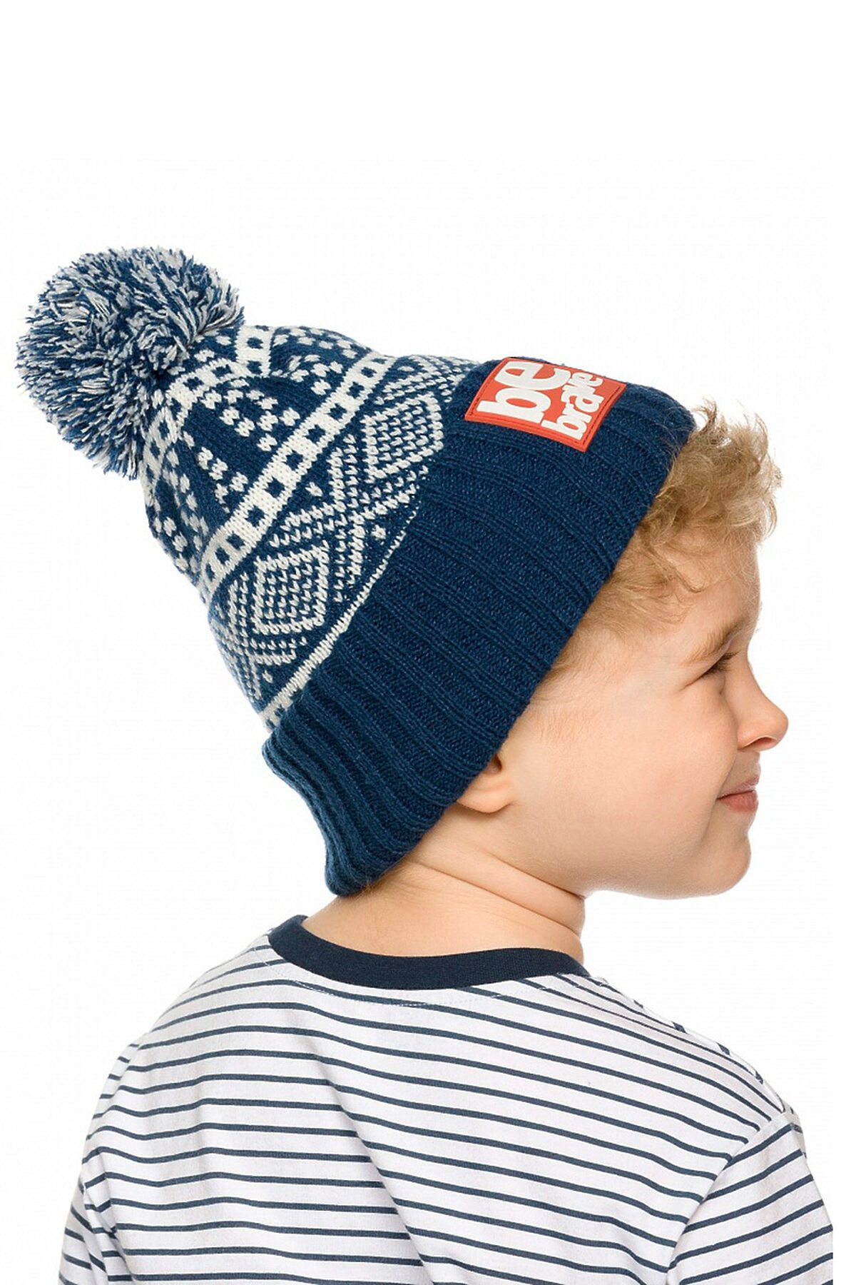 Шапка для мальчиков двойная с отворотом и подкладом из флиса. Вязка жаккардовая. На макушке декоративный помпон из ниток. По центру резиновая нашивка Будь смелым.