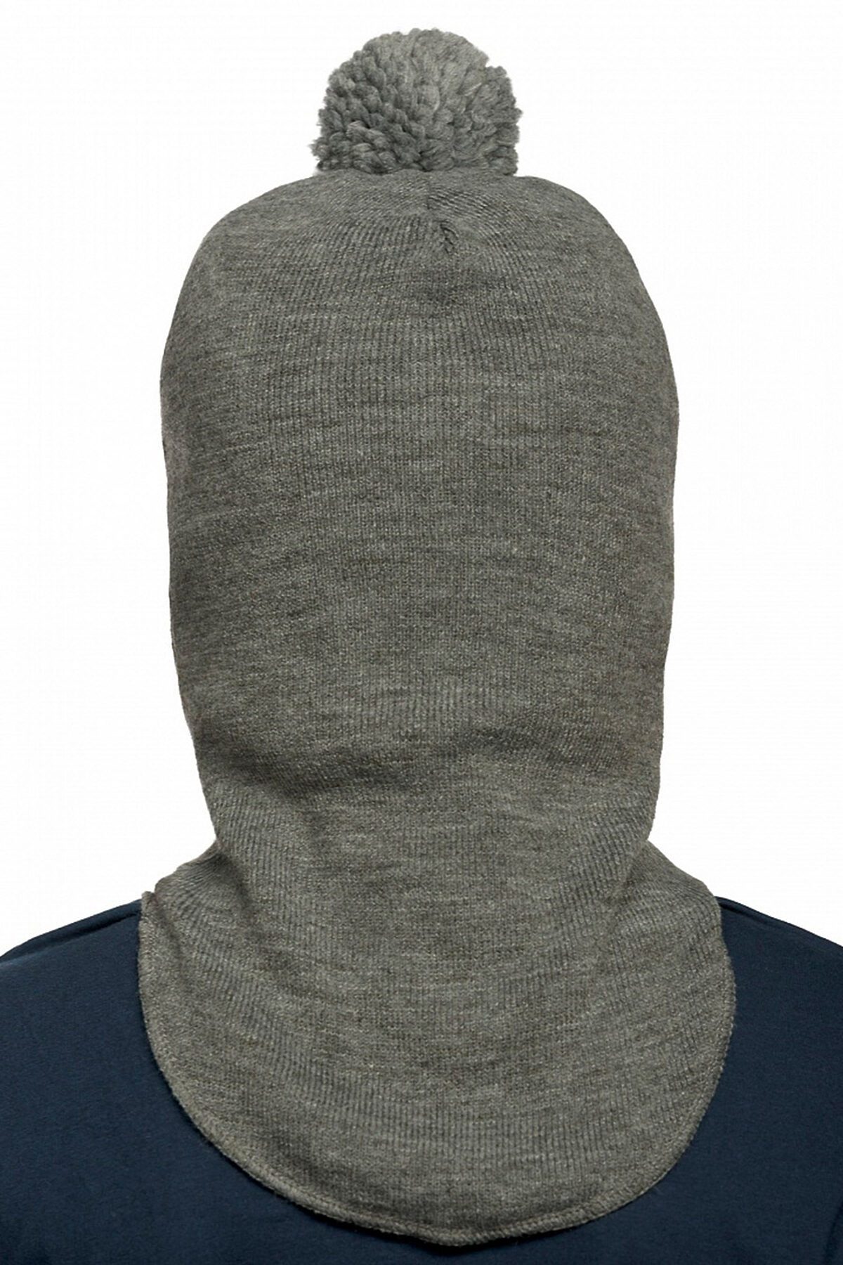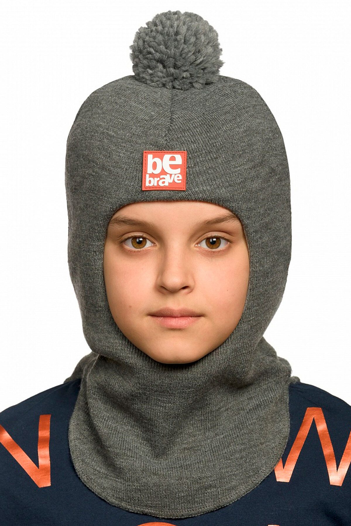 Зимняя шапка шлем для мальчиков, зона ушей и лба утеплена синтепоном, который закреплен на хлопковом подкладе, отсутствует отстрочка вокруг лица, максимальное прилегание по плечам и шее за счет боковых швов и эластичной обработки по низу изделия. Декорирована помпоном из ниток и резиновой нашивкой с надписью Будь смелым.