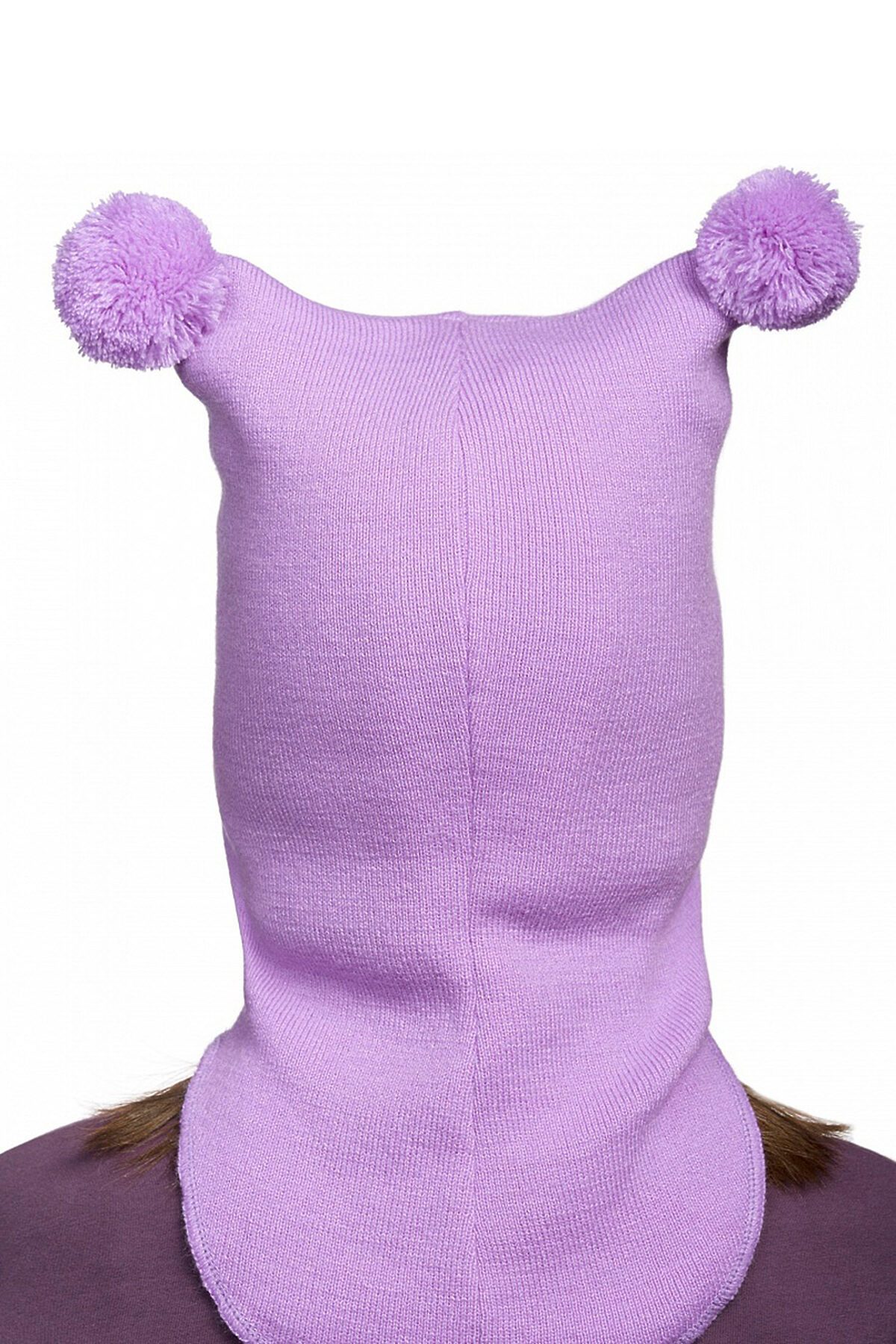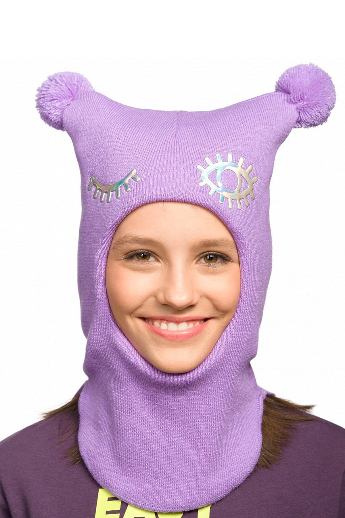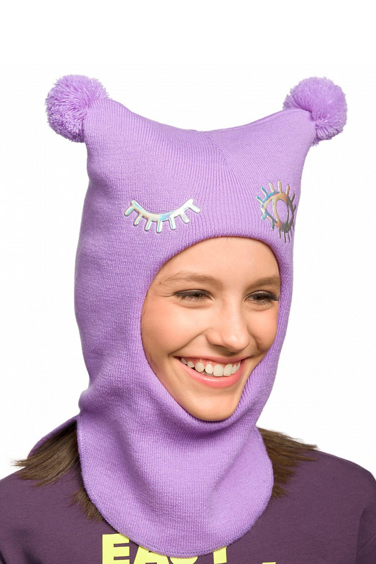 Зимняя шапка шлем для девочек, зона ушей и лба утеплена синтепоном, который закреплен на хлопковом подкладе, отсутствует отстрочка вокруг лица, максимальное прилегание по плечам и шее за счет заднего шва и эластичной обработки по низу изделия. Низ изделия разноуровневый впереди шапка более короткая, чем на спинке, по бокам более вытянутая. Шапка декорирована голографической термонаклейкой.