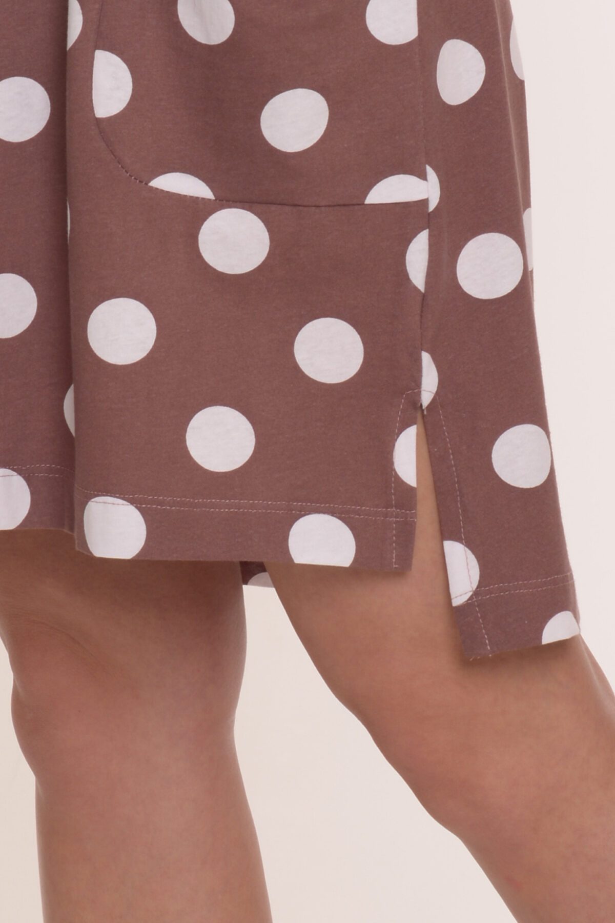 Женская туника свободного кроя - Рукав втачной, спущенное плечо - Вырез "лодочка" - Карман накладной - Отделка контрастной тканью - Боковые разрезы - Подол разной длины - Набивка ткани - крупный горох