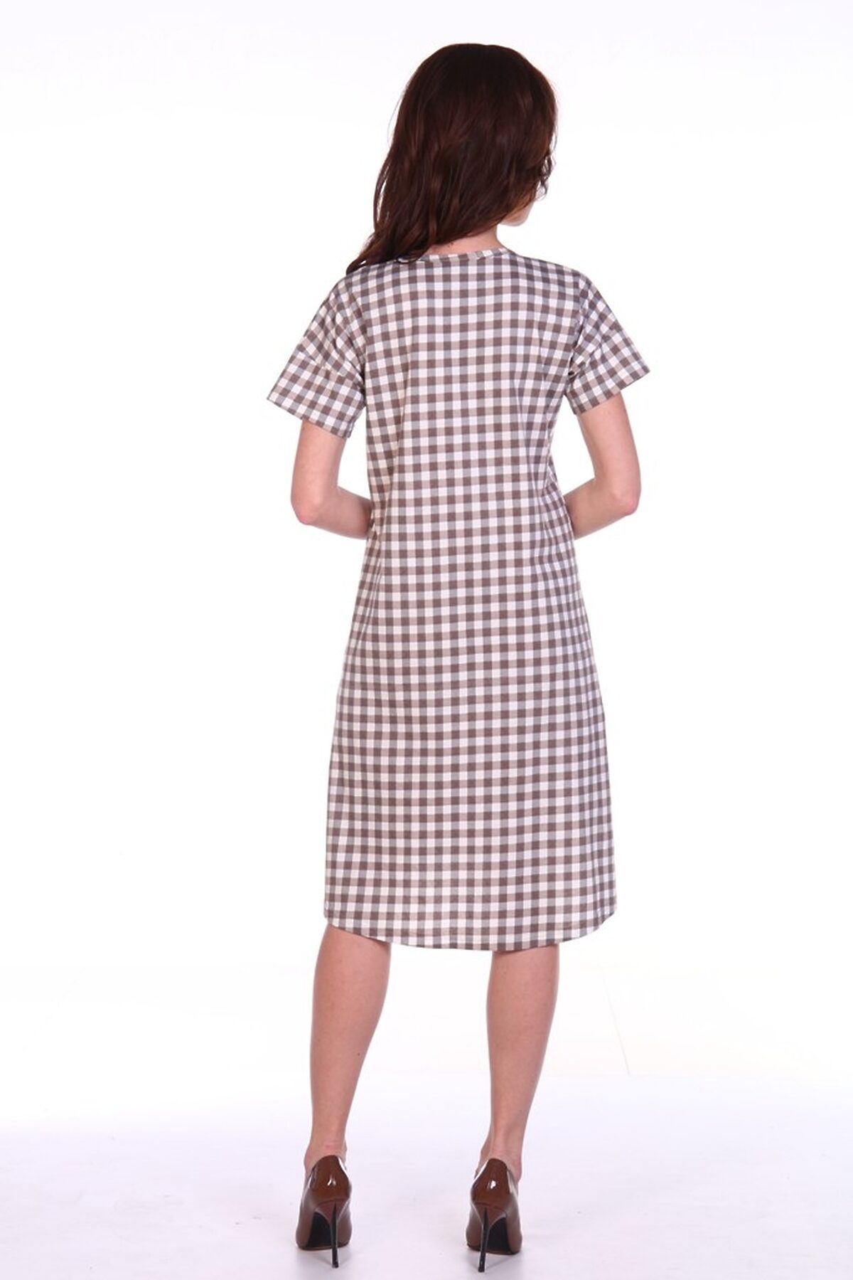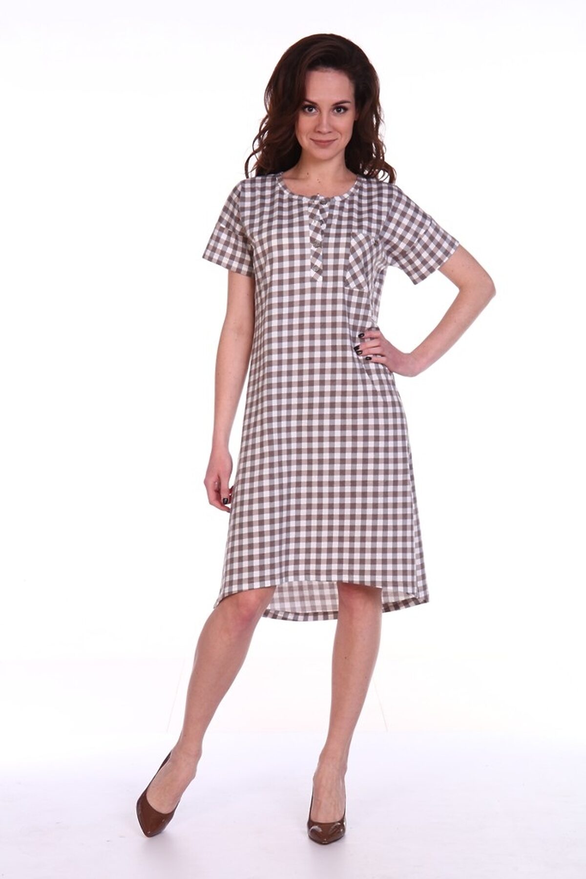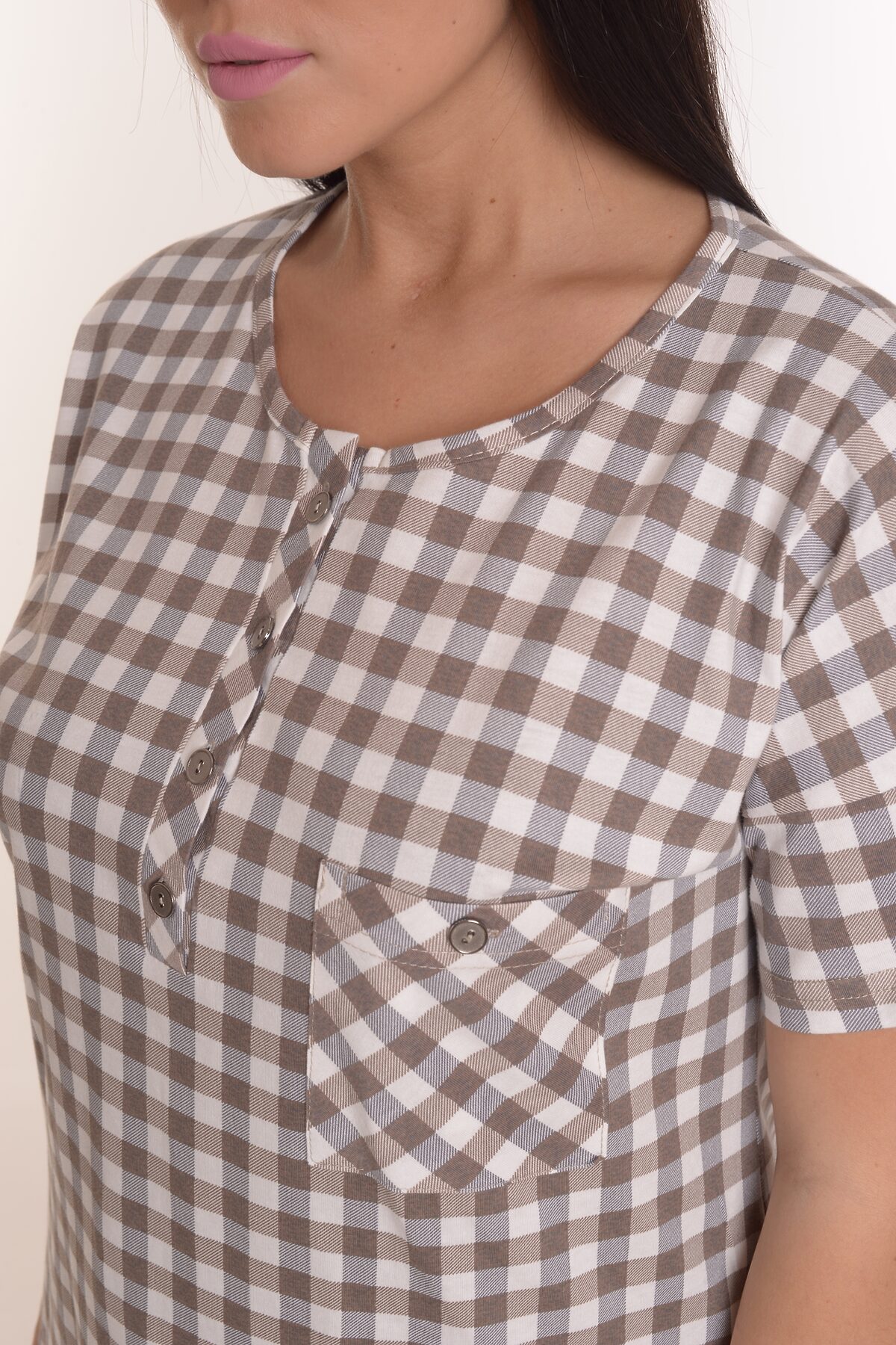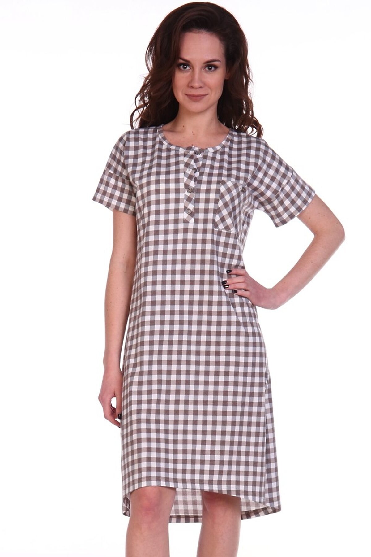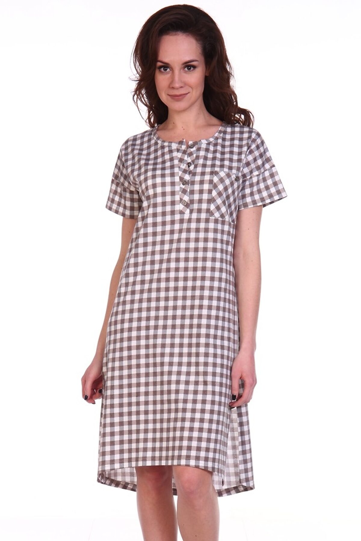 Туника полуприлегающего силуэта - Рукав спущенное плечо, втачной, короткий - Планка с застежкой-поло на пуговицах - Нагрудный карман с пуговицей - По низу боковые разрезы - Набивка - клетка - Обработка горловины, рукавов, планки и кармана основной ...