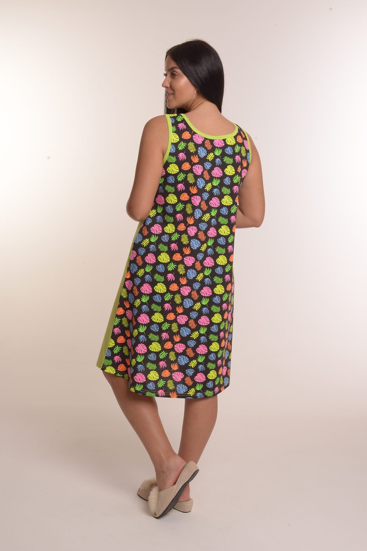 Халат полуприлегающего силуэта, длиной до колена ,без воротника и рукавов, застежка на тесьму-"молнию". На полочках внутренние боковые карманы. На полочке из контрастного цвета нанесен дизайнерский принт. Горловина, проймы и вход в карманы окантованы материалом отделочного цвета.