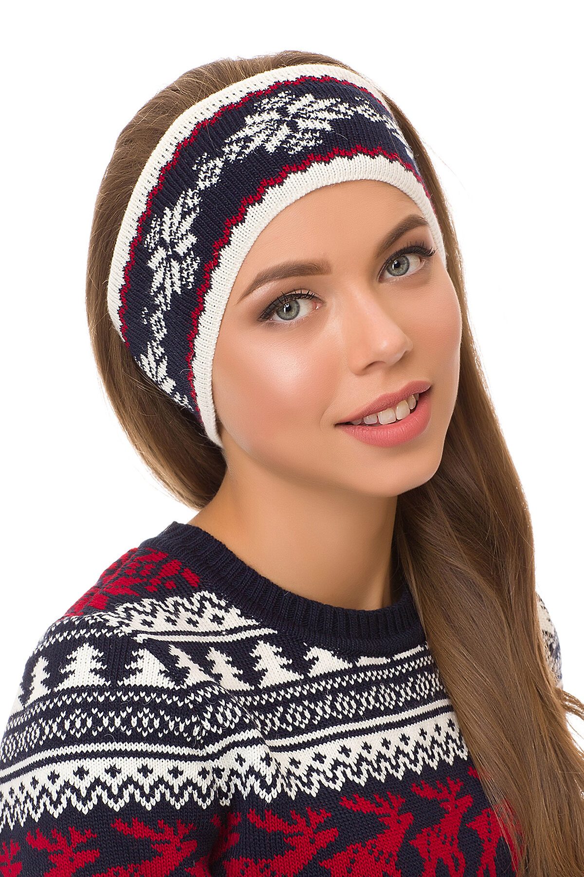 Вязанная повязка, выполненная из шерсти и пана. Модель с ярким орнаментом. Универсальная и стильная вещь под любой вид верхней одежды.
