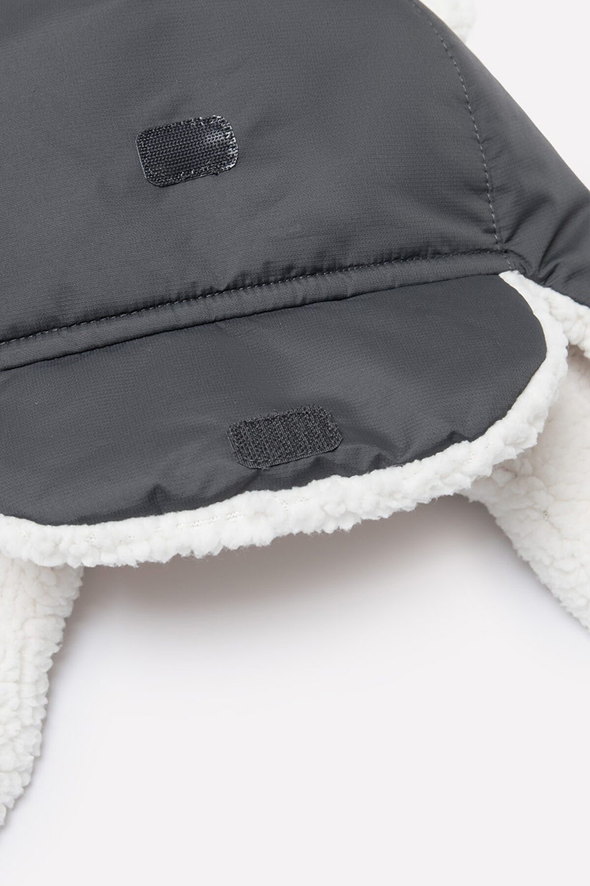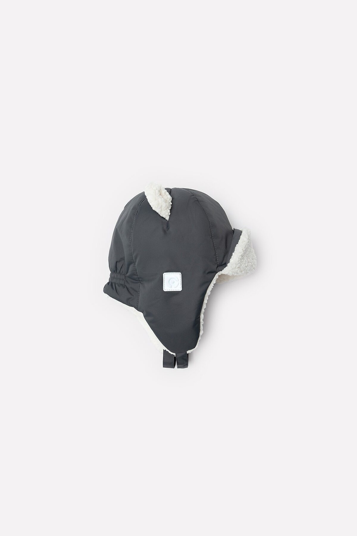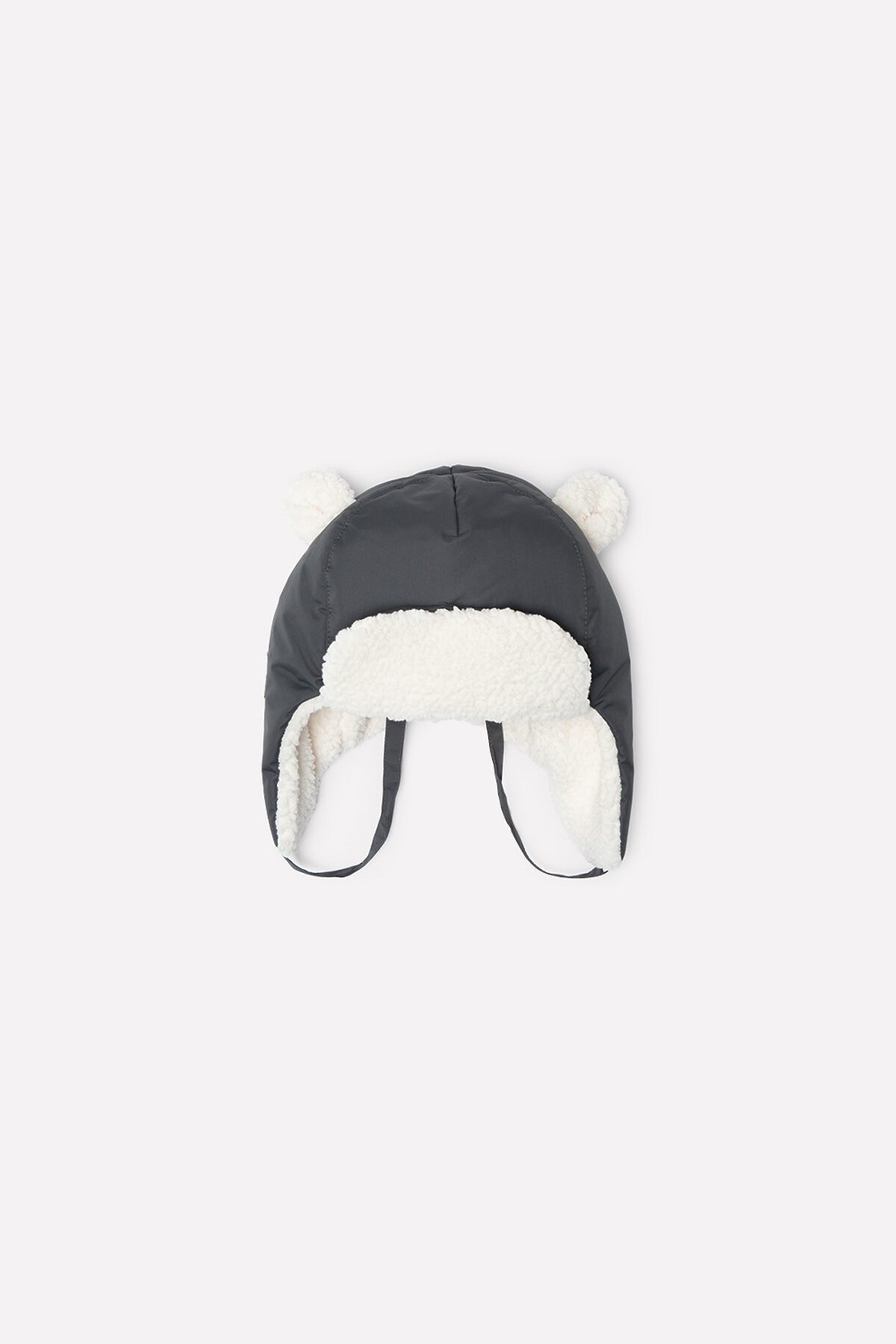 Утепленная детская шапка из однотонной мембранной ткани. Подкладка из длинноворсового флиса, спереди отворот. Уши с завязками, сверху декоративные ушки. Внутри синтетический наполнитель.