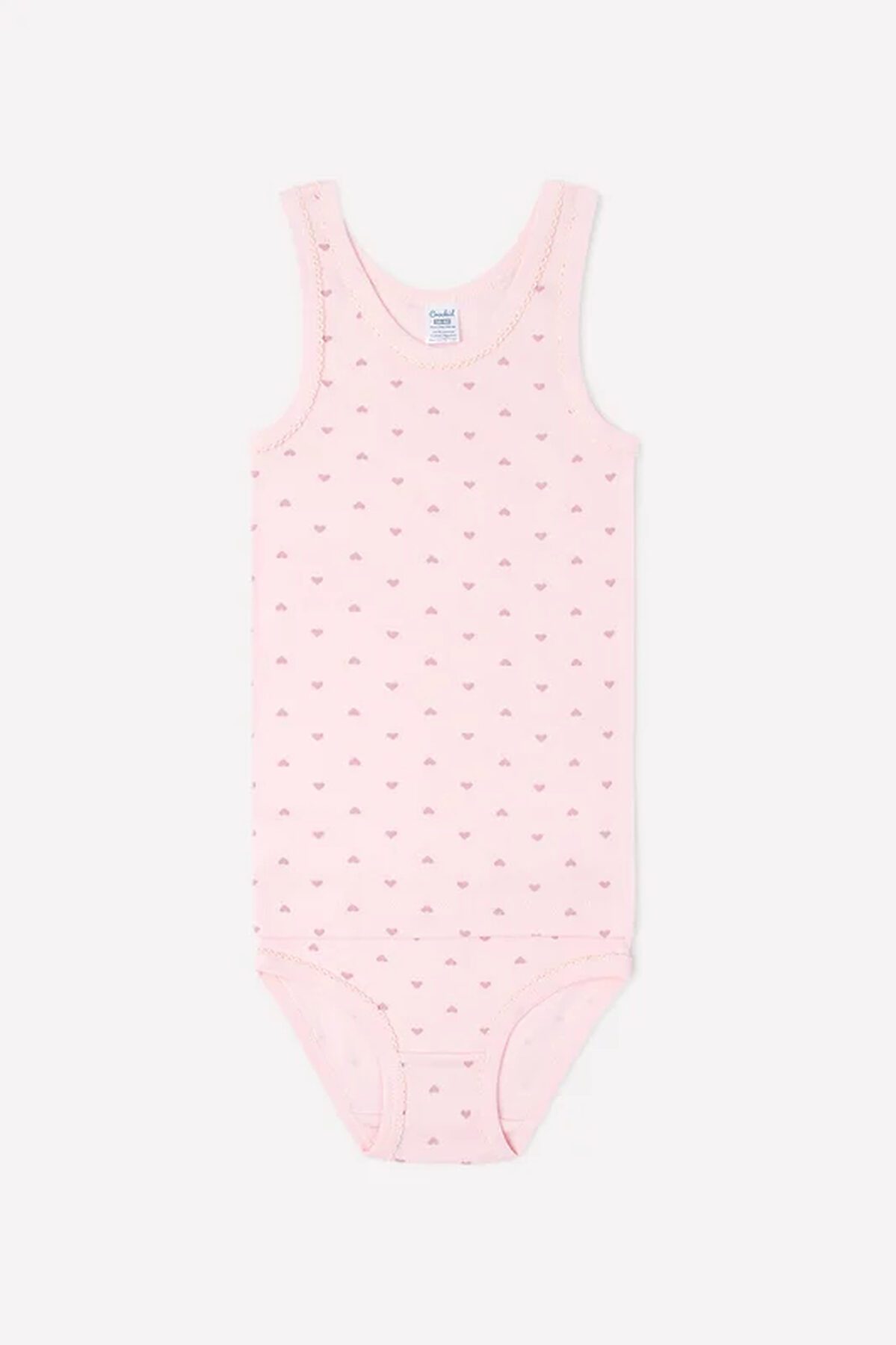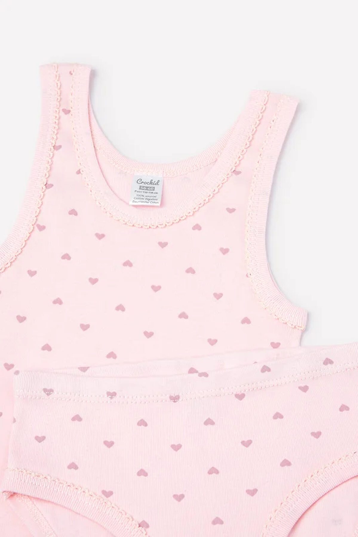 Комплект для девочки - майка на лямках и трусы из натурального хлопка. Сшит из эластичного материала рибана пенье. Горловина, пояс и проймы обработаны бейкой. Украшен набивными сердечками. Впереди на трусиках - бантик.