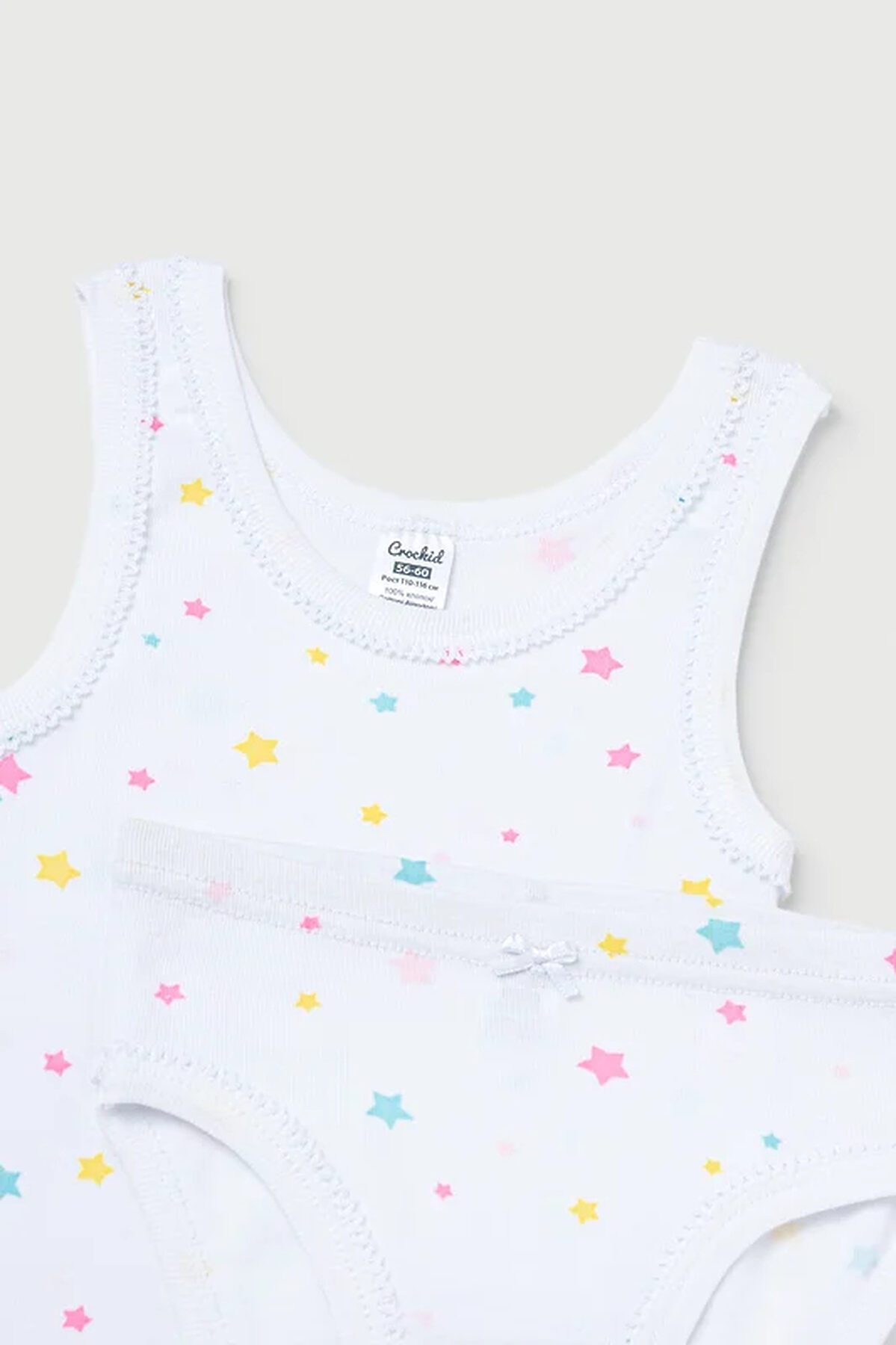 Комплект для девочки - майка на лямках и трусы из натурального хлопка. Сшит из эластичного материала рибана пенье. Украшен набивным рисунком. Горловина и проймы обработаны бейкой. Бантик на трусиках.
