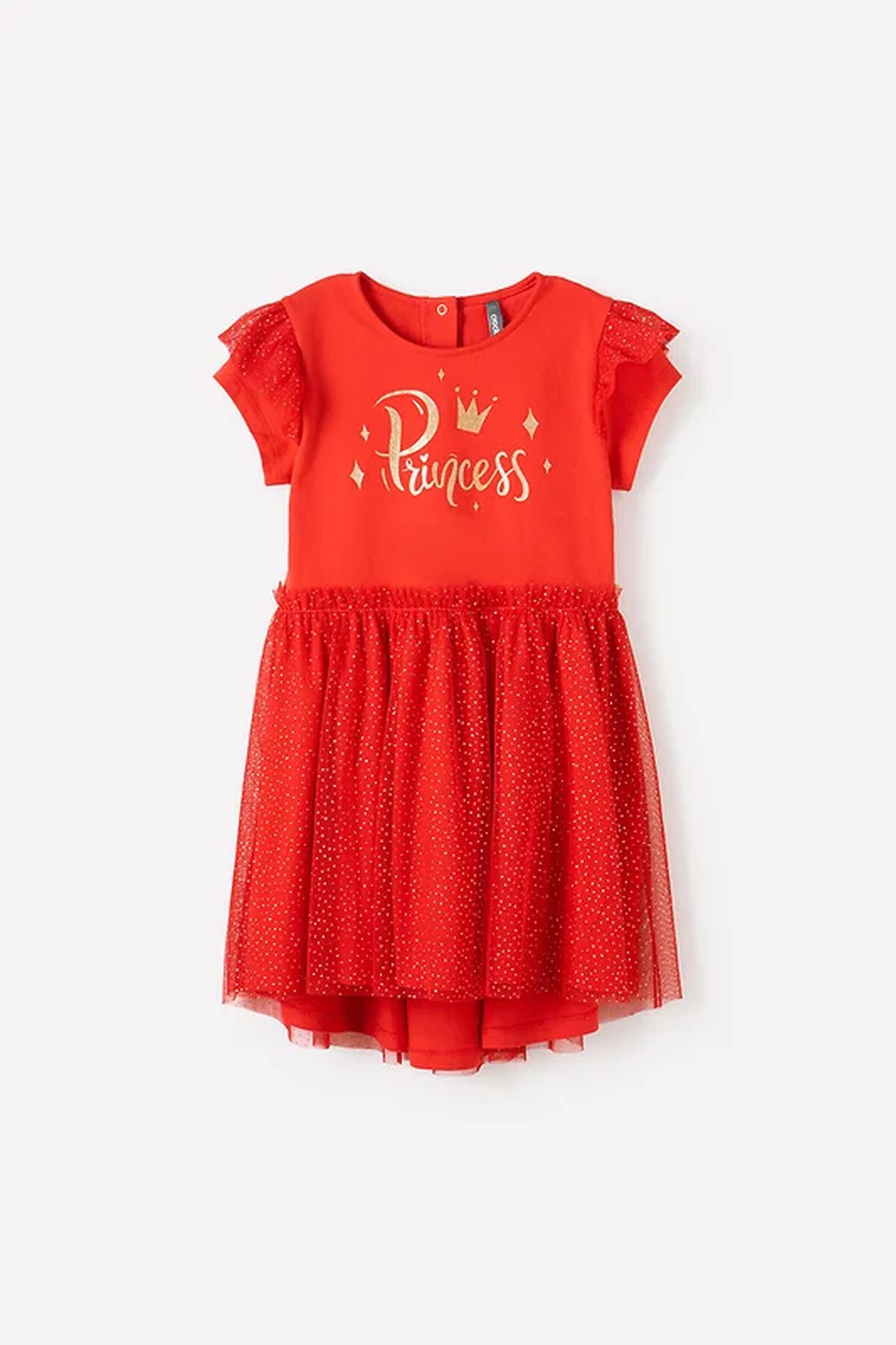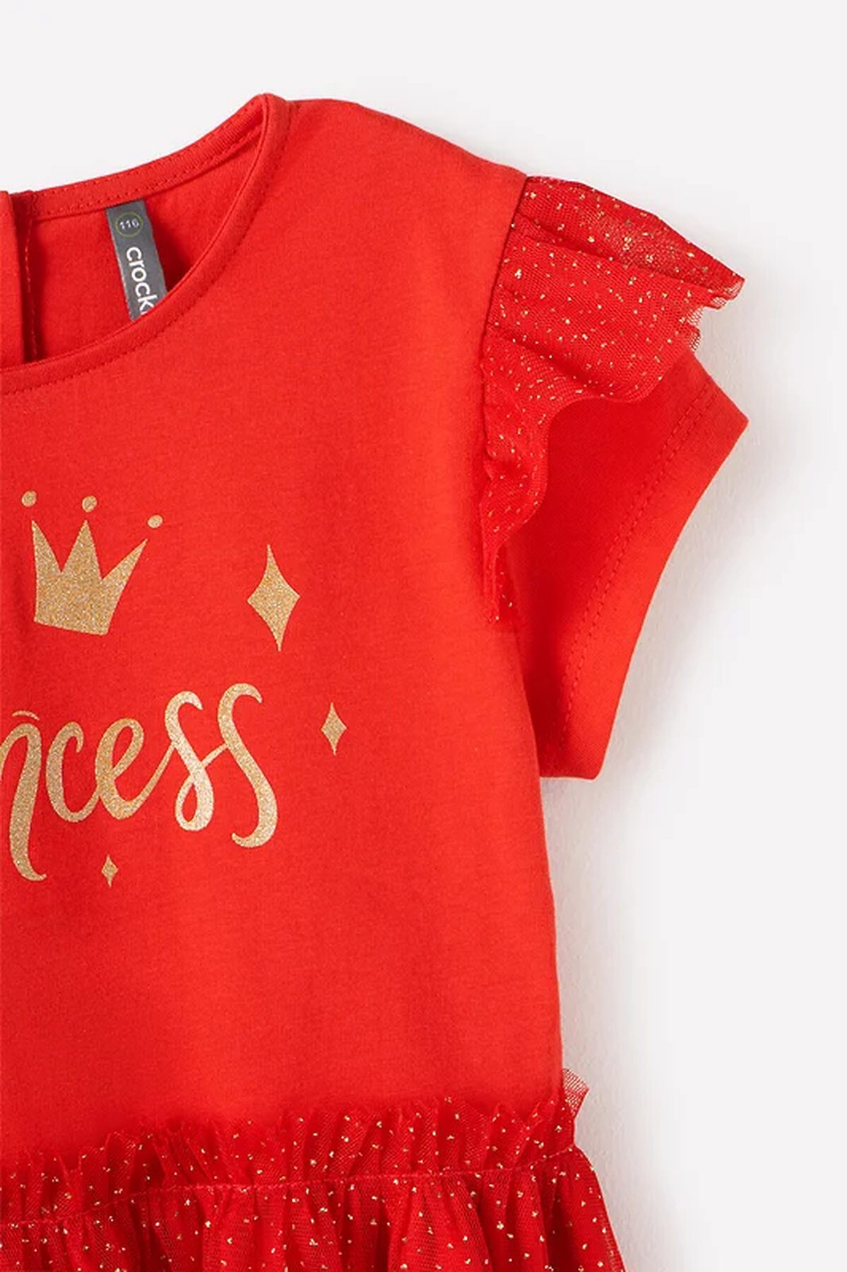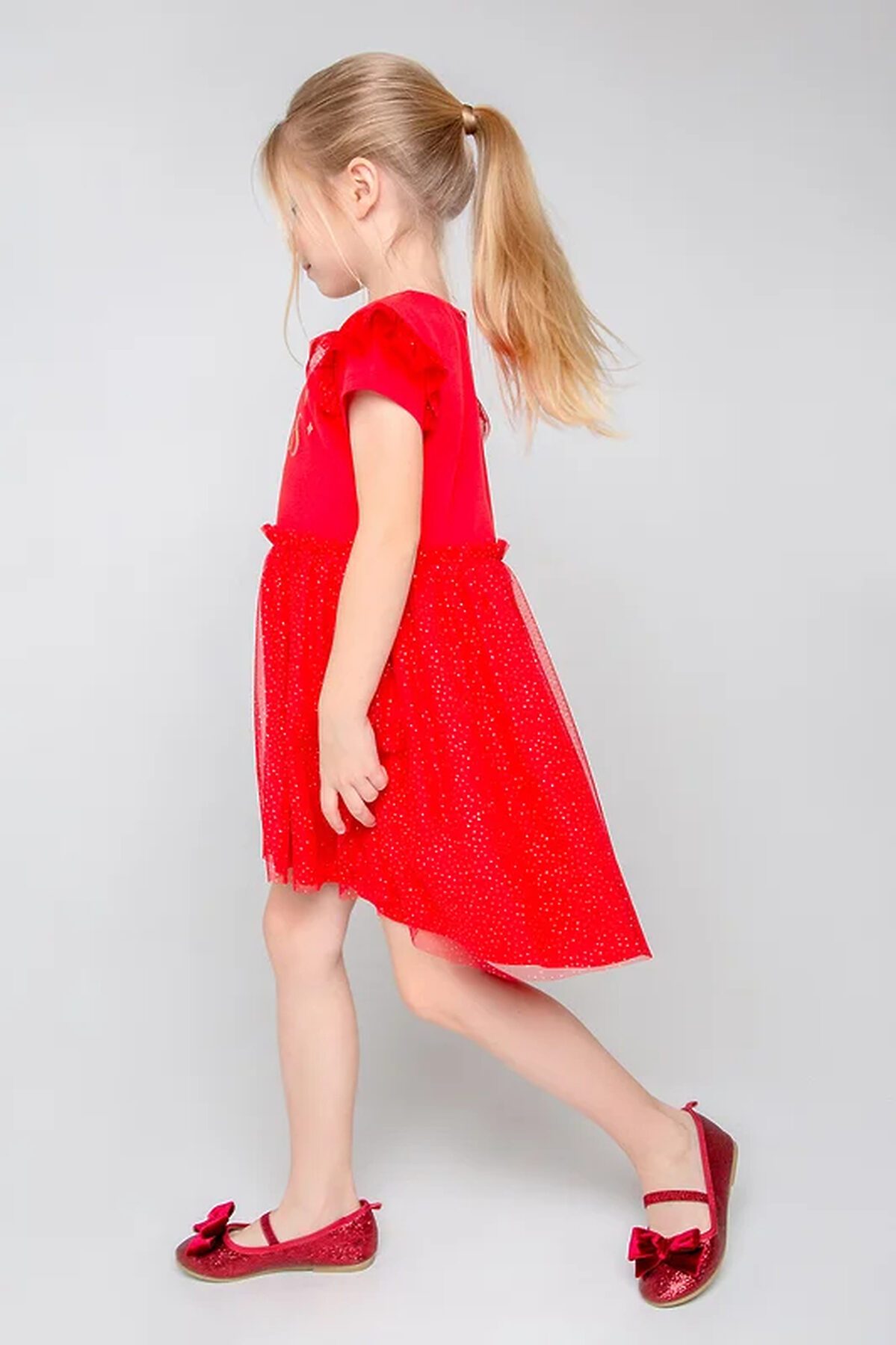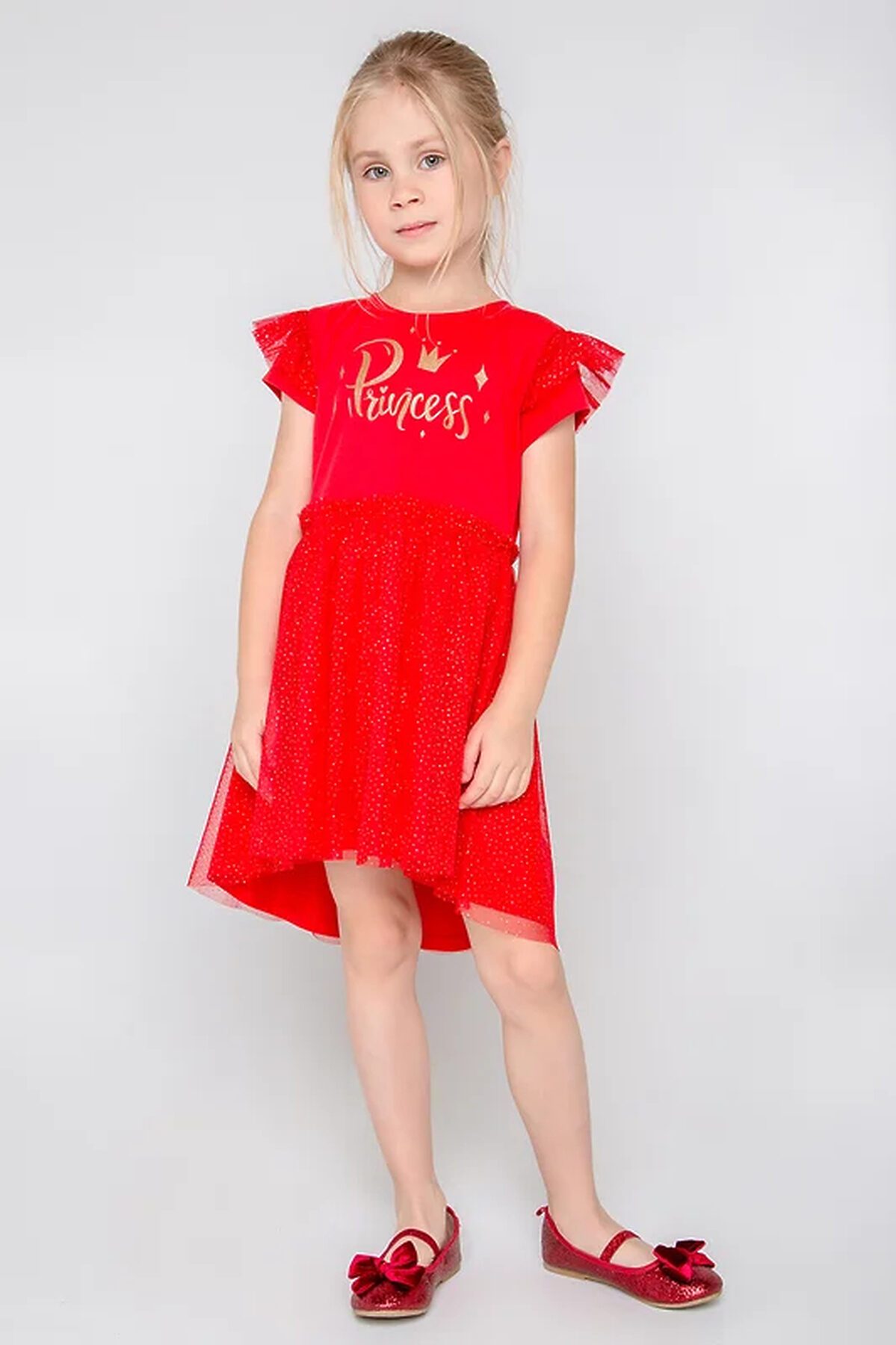Нарядное красное платье. Лиф из супрема украшен принтом. Верхний слой юбки сделан из сетки с золотыми блёстками, на талии красивая сборка. На рукавах оборка из сетки. До 98 размера для удобства при одевании застёгивается на спинке с помощью кнопок.