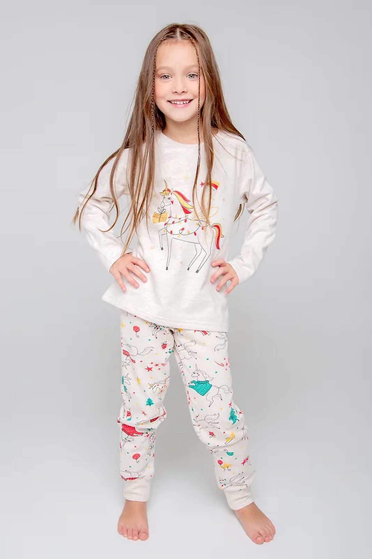 Пижама для девочки из футера с начесом. Джемпер с новогодним принтом и брюки с набивным рисунком. Рукава-реглан и низ джемпера обработаны плоскими швами. В брюках эластичный пояс на резинке и мягкие манжеты.