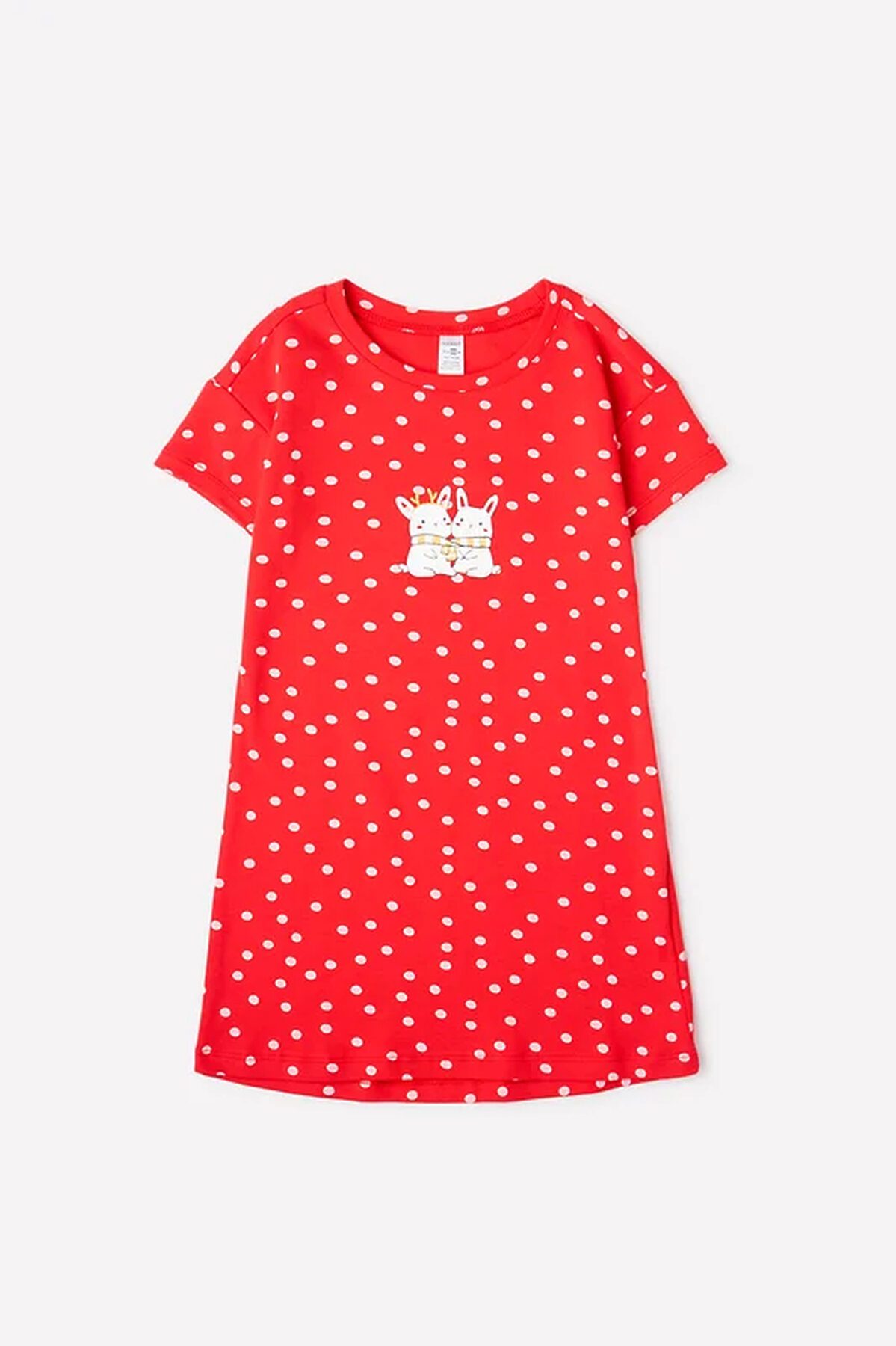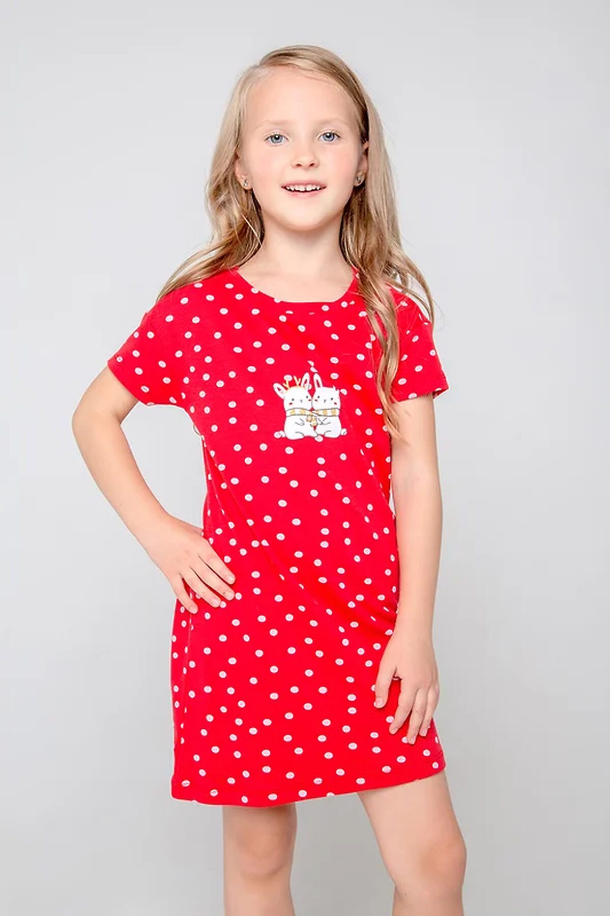 Детская сорочка из трикотажа интерлок с короткими рукавами. Украшена набивным рисунком в горох и принтом с новогодними зайками. Закруглённая спинка длиннее полочки.