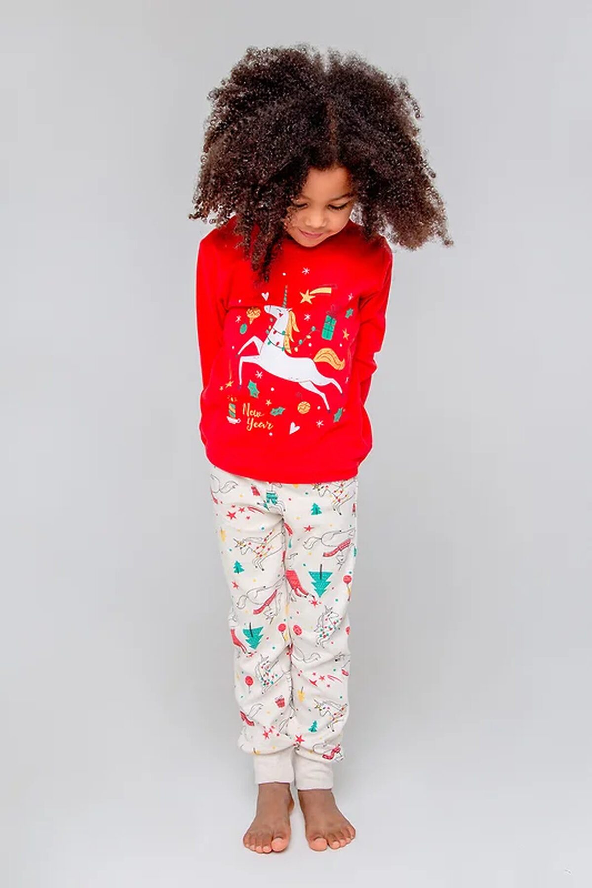Пижама для девочки из трикотажа интерлок пенье. Джемпер с новогодним принтом и брюки с набивным рисунком. На рукавах джемпера - широкие манжеты, низ обработан плоскими швами. В брюках эластичный пояс на резинке и мягкие манжеты.
