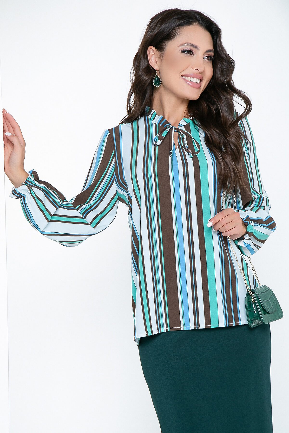 Блуза прямого кроя, вырез горловины красиво оформлен оборкой и небольшим бантиком;