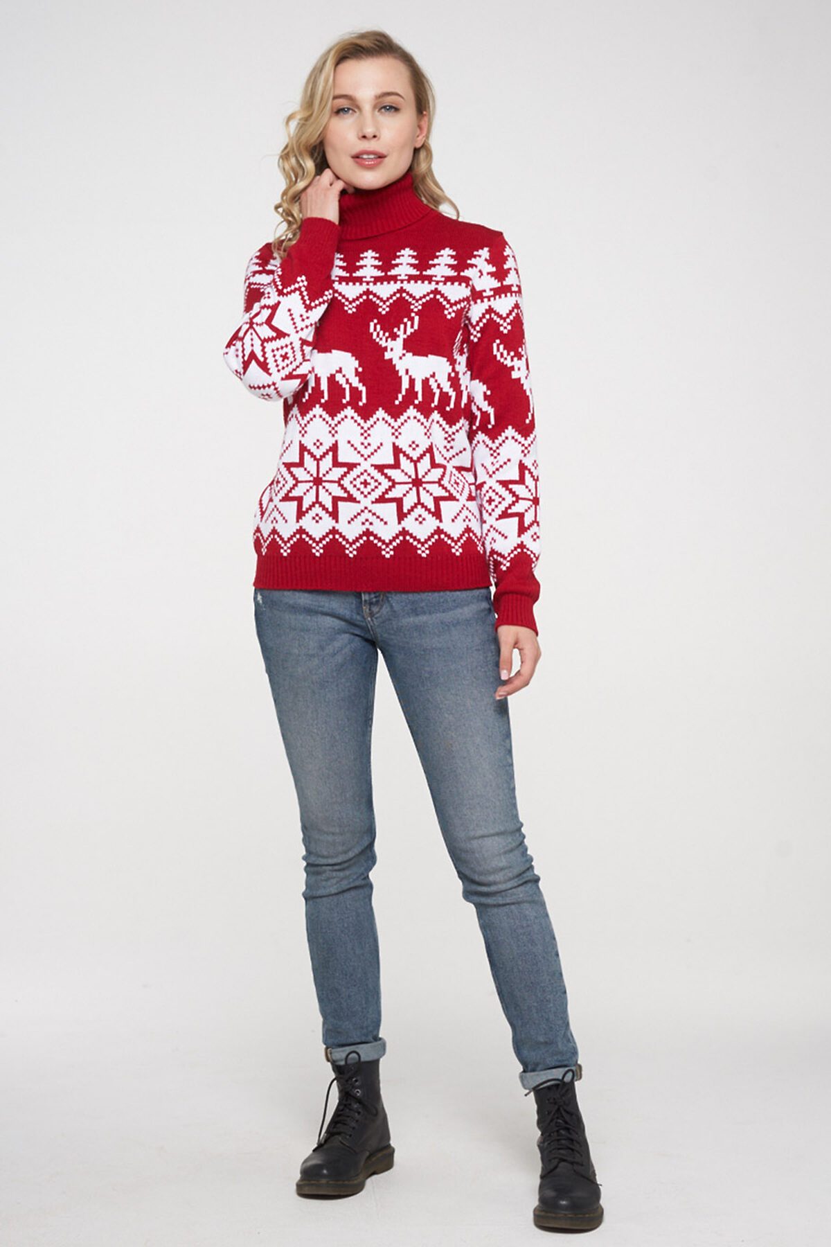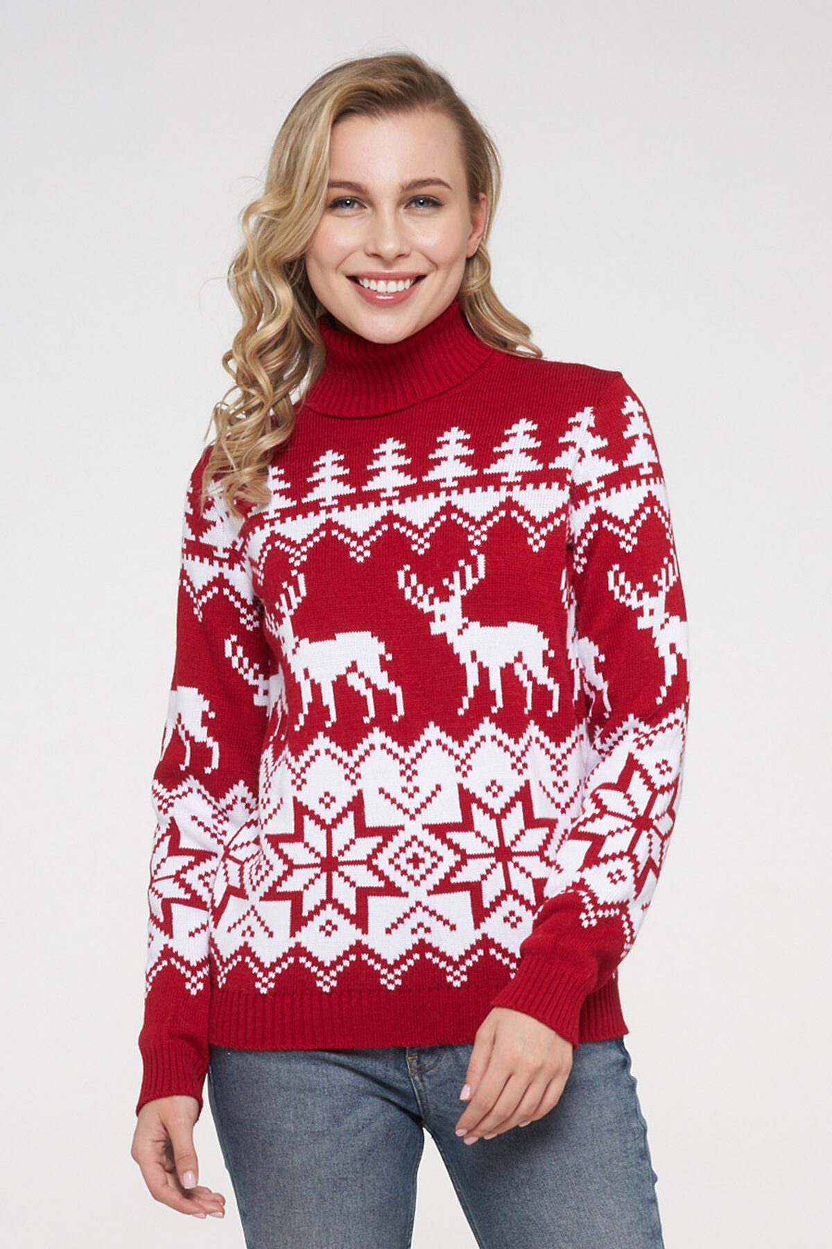 Женский свитер с жаккардовым узором и высоким отложным воротом.