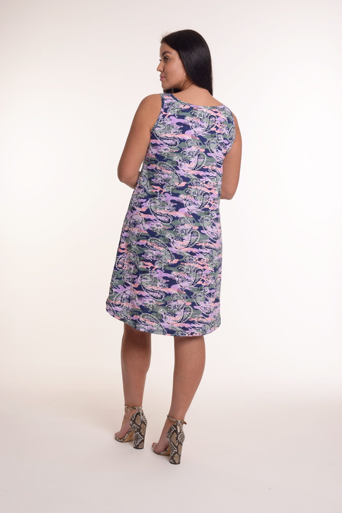 Молодежный приталенный сарафан, расширенный к низу - Широкие бретели - Длина до колена - Горловина и проймы окантованы отделочной тканью - Камуфляжная набивка ткани в сочетании с узором пейсли
