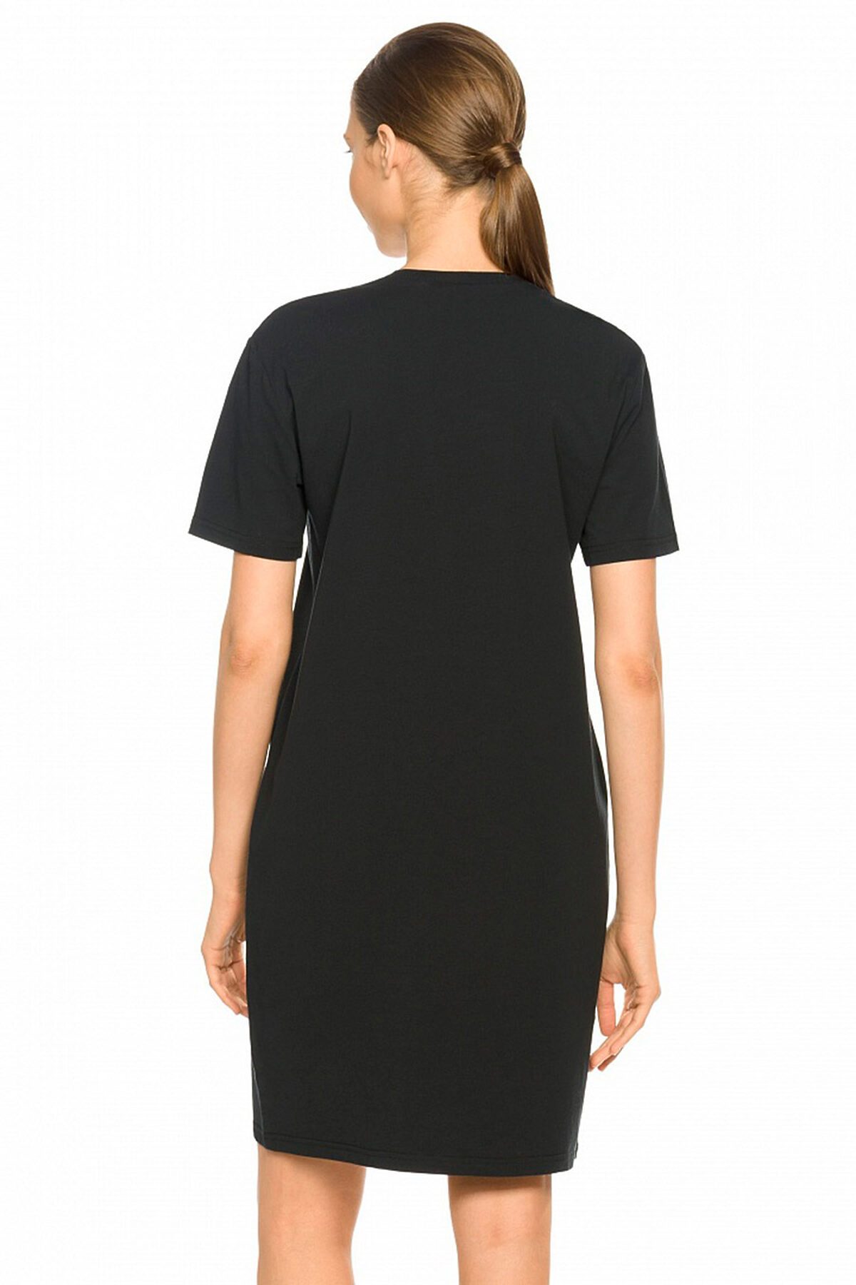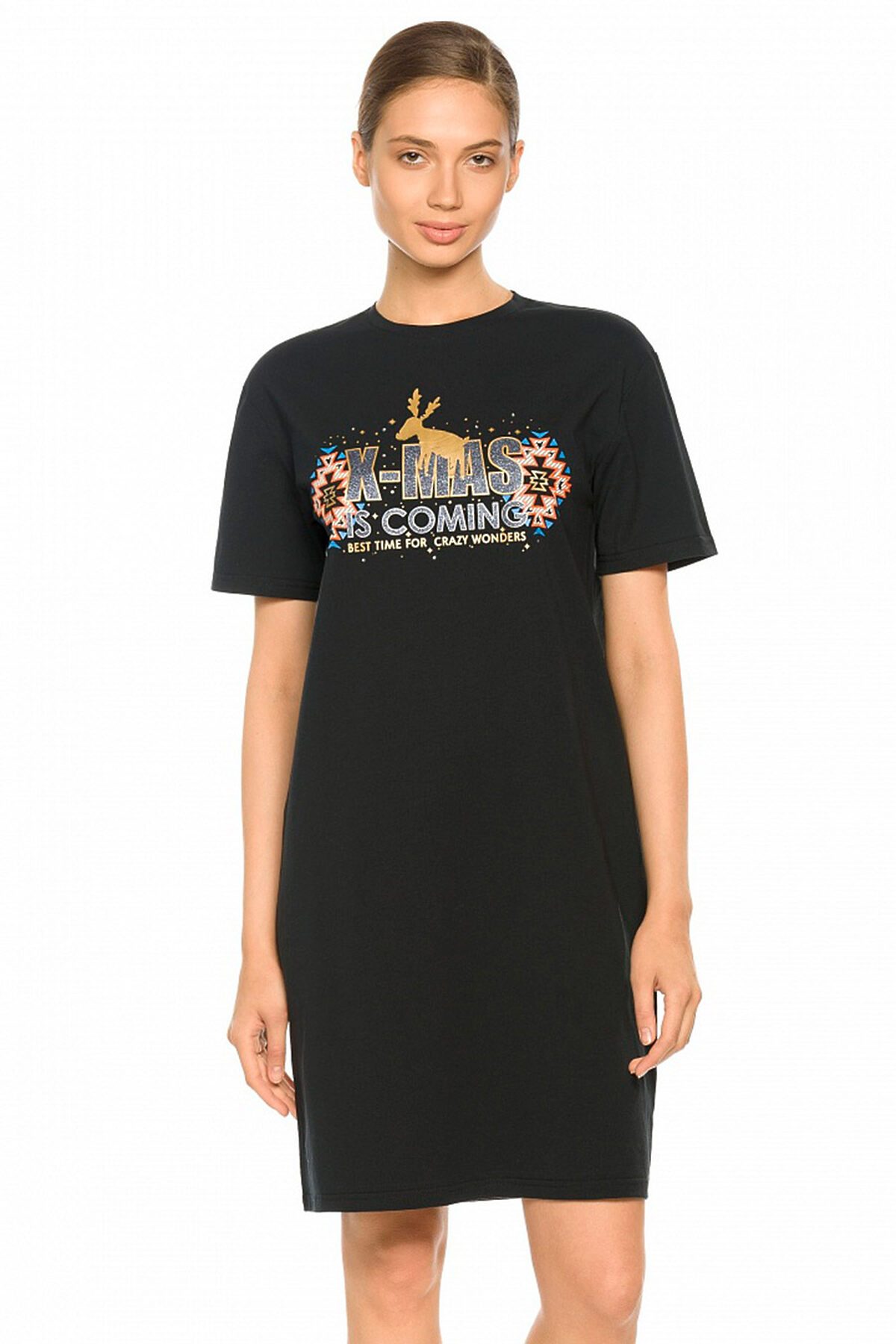 Платье расслабленного силуэта свободного объёма со спущенной линией плеча. Горловина современная, небольшая, круглая. Стойкий эластичный rubber принт с золотым металликом, глиттером и стразами. Перевод Рождество приходит. Лучшее время для безумных чудес.