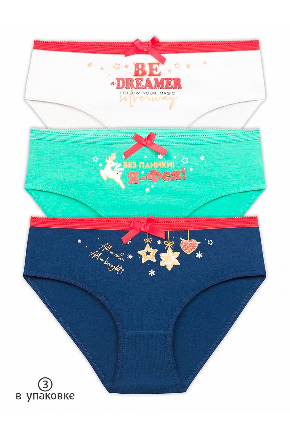 Трусики слипы со средней посадкой для девочек. В комплекте 3 изделия. По талии эластик с фестонным краем, декор в виде атласного бантика. Прочный принт с золотом и разноцветным глиттером. Обработка эластиком по ноге.
