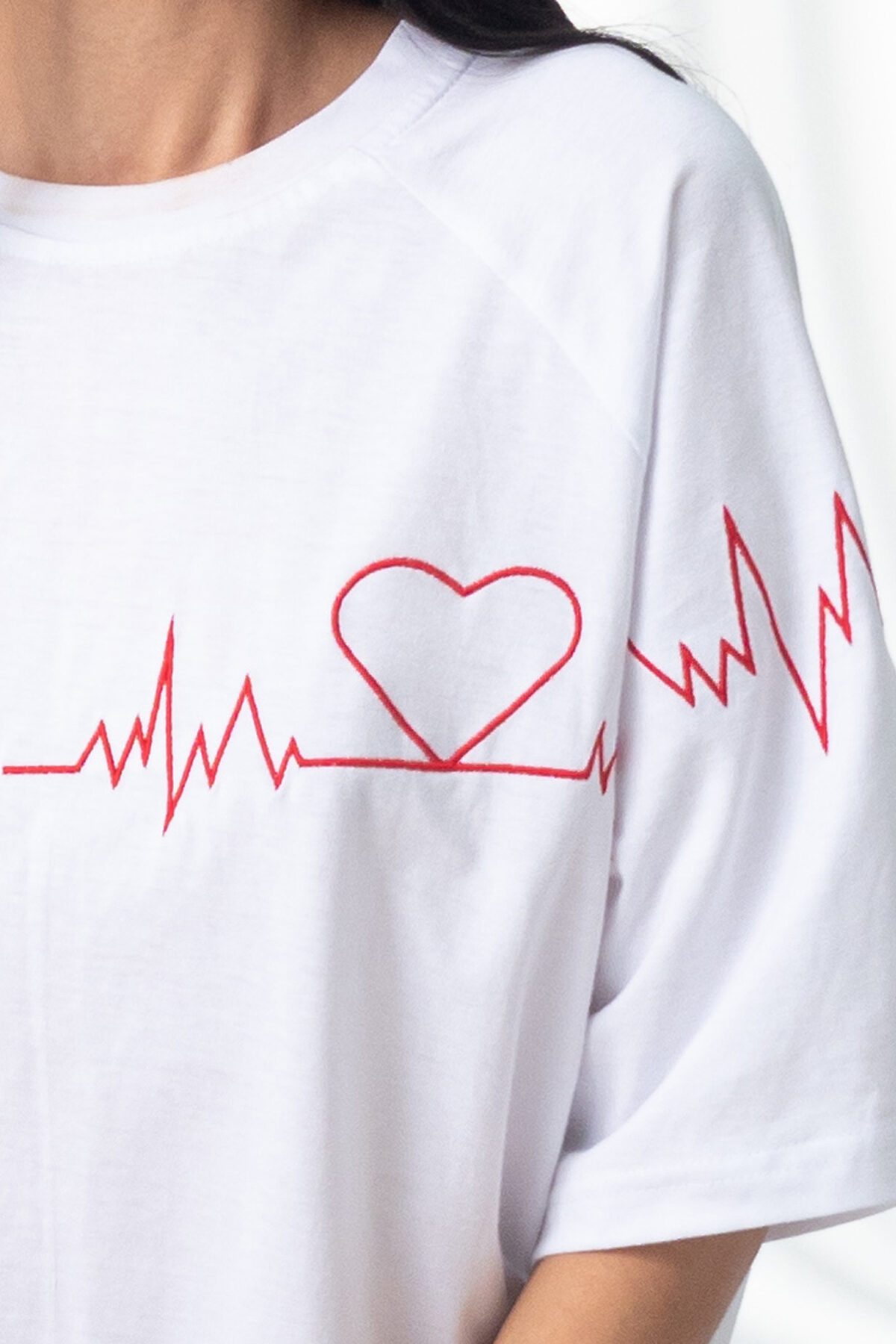 Футболка женская оверсайз – главный тренд этого сезона! Женская футболка отлично подойдет для повседневной носки, активного отдыха, в качестве домашней одежды. Вышивка в виде кардиограммы станет незабываемым акцентом в вашем образе. Футболка изготовлена из 100% хлопкового трикотажа оптимальной плотности. Рукав реглан добавит дополнительный комфорт в носке изделия. Футболка поставляется в фирменной упаковке, поэтому подойдет в качестве подарка любимым.