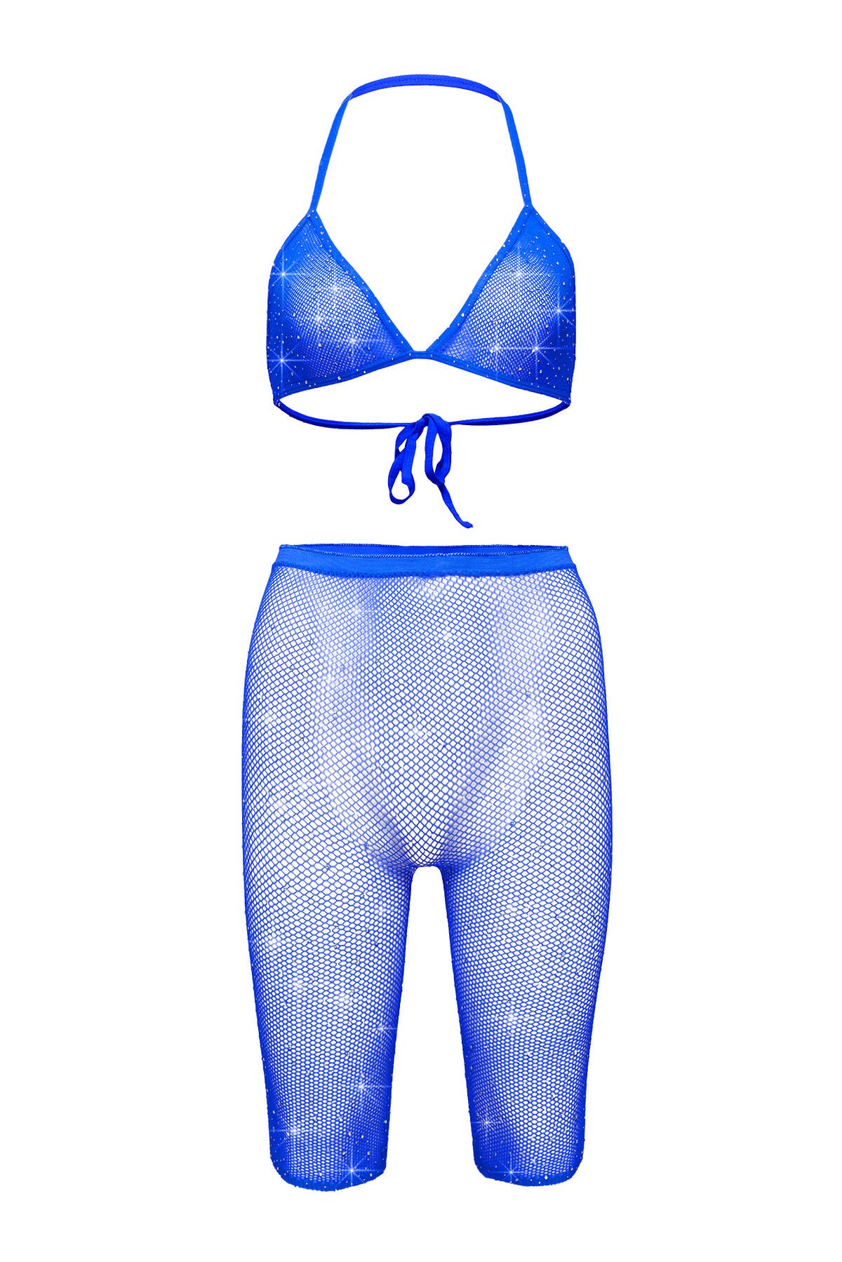 Комплект женский сетчатый со стразами бюстгальтер и короткие леггинсы эротическая одежда "Соблазн" LE CABARET, синий, серебристый