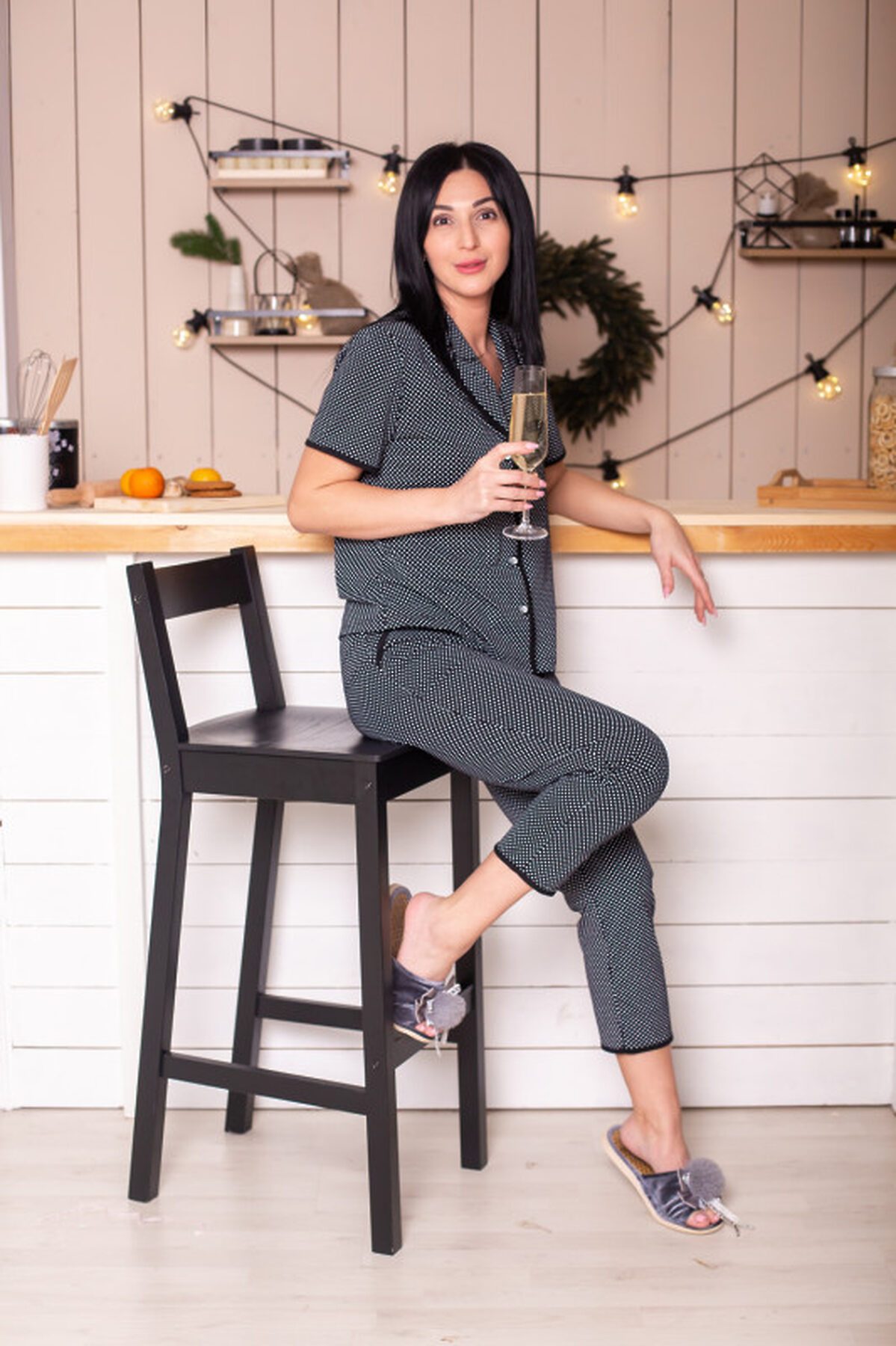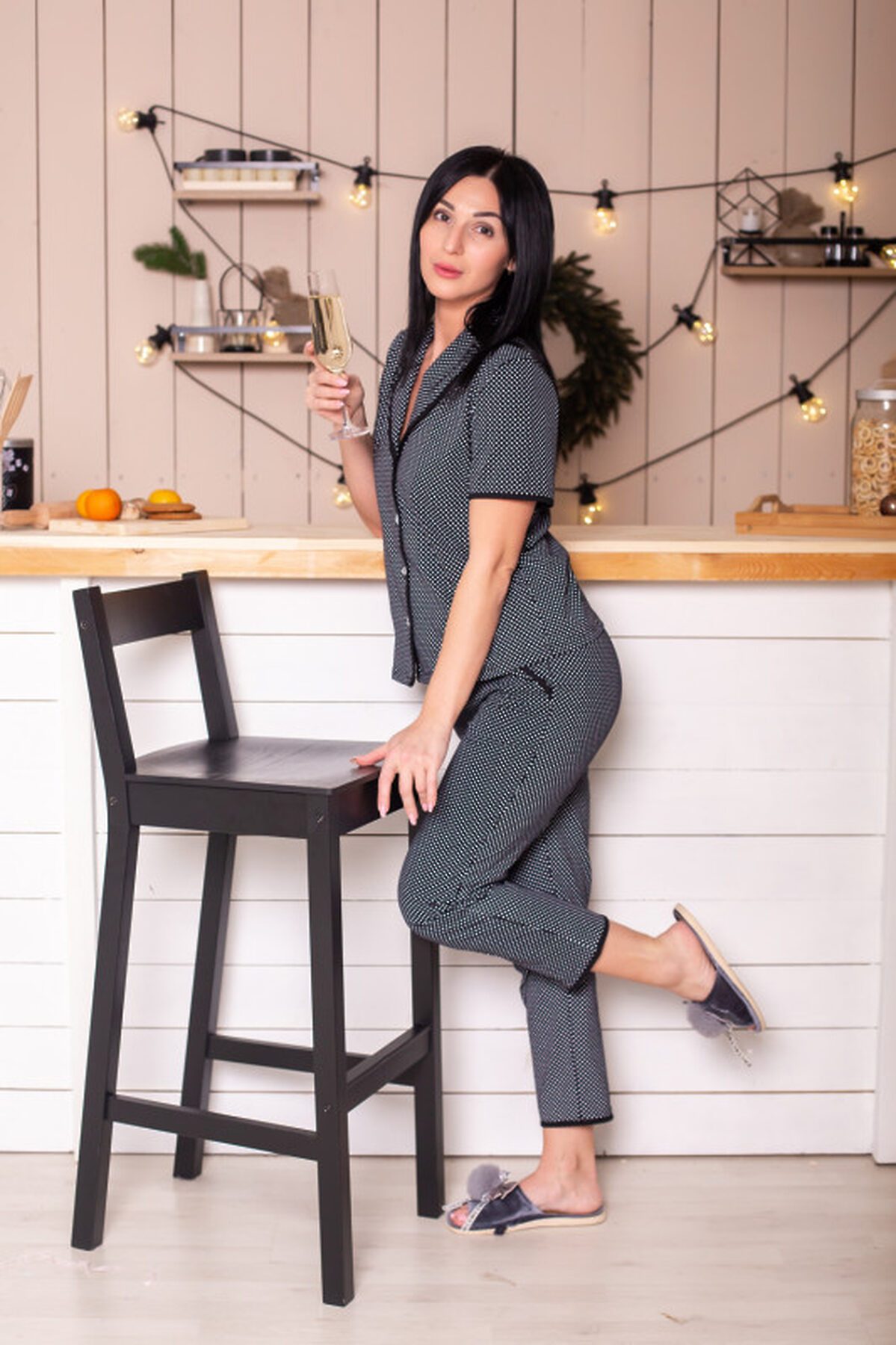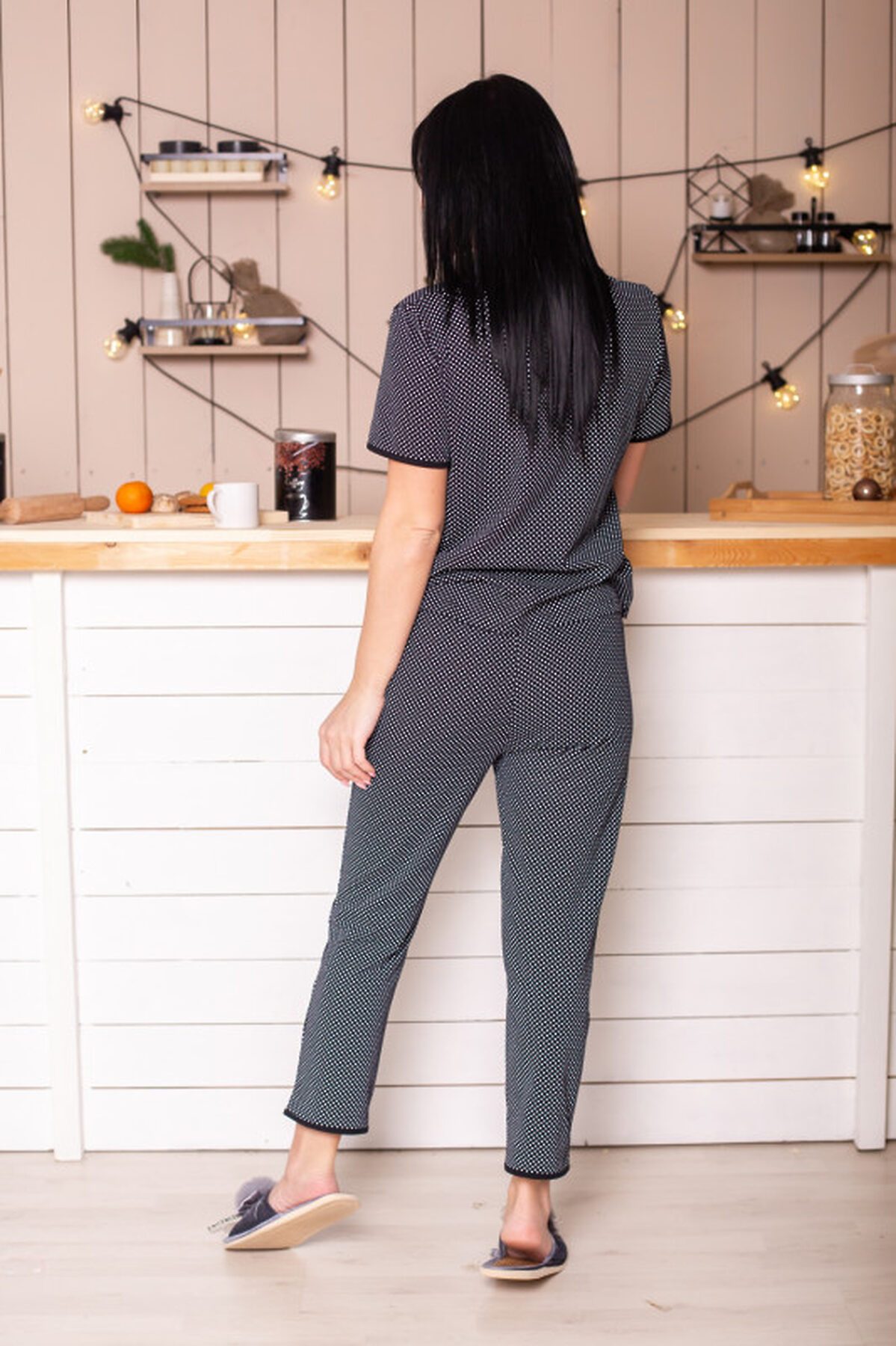 Женский костюм состоит из кофты и брюк. Кофта выполнена в стиле рубашка с коротким рукавом, застегиваеться на пуговицы. Брюки прилегающего силуэта, два боковых кармана.