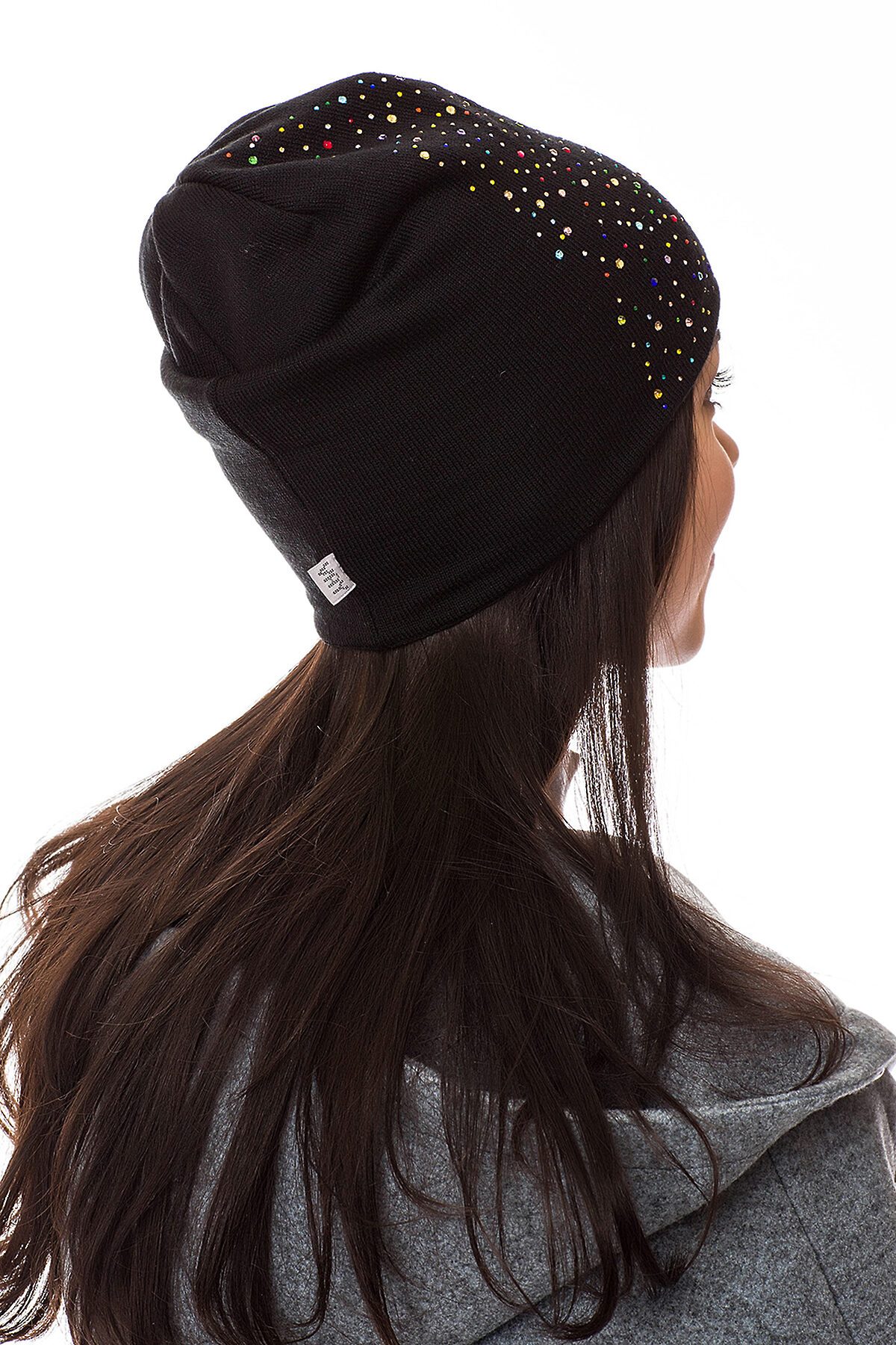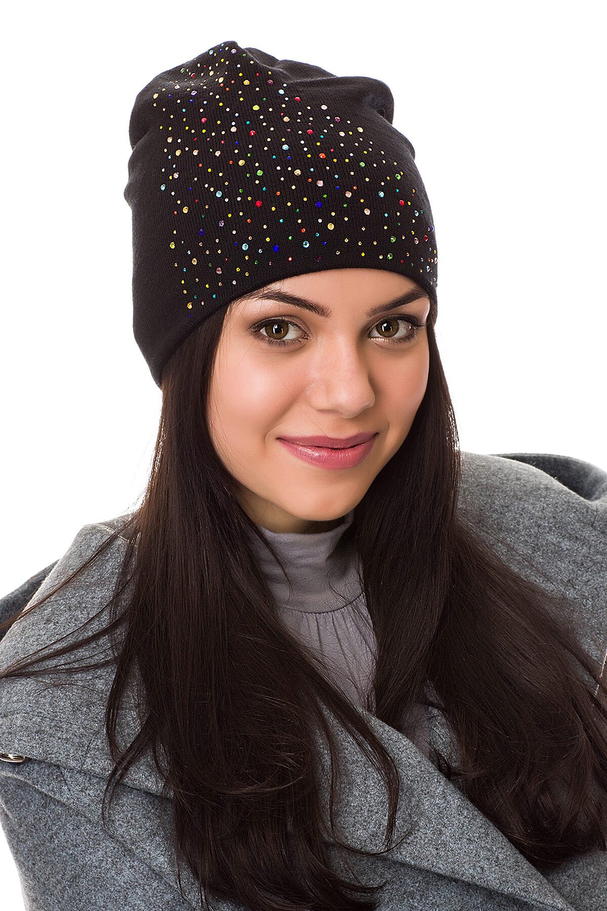 Демисезонная шапка, выполненная из мягкого эластичного трикотажного материала, декорированного мерцающими стразами. Шапка без отворотов, немного удлиненного силуэта.