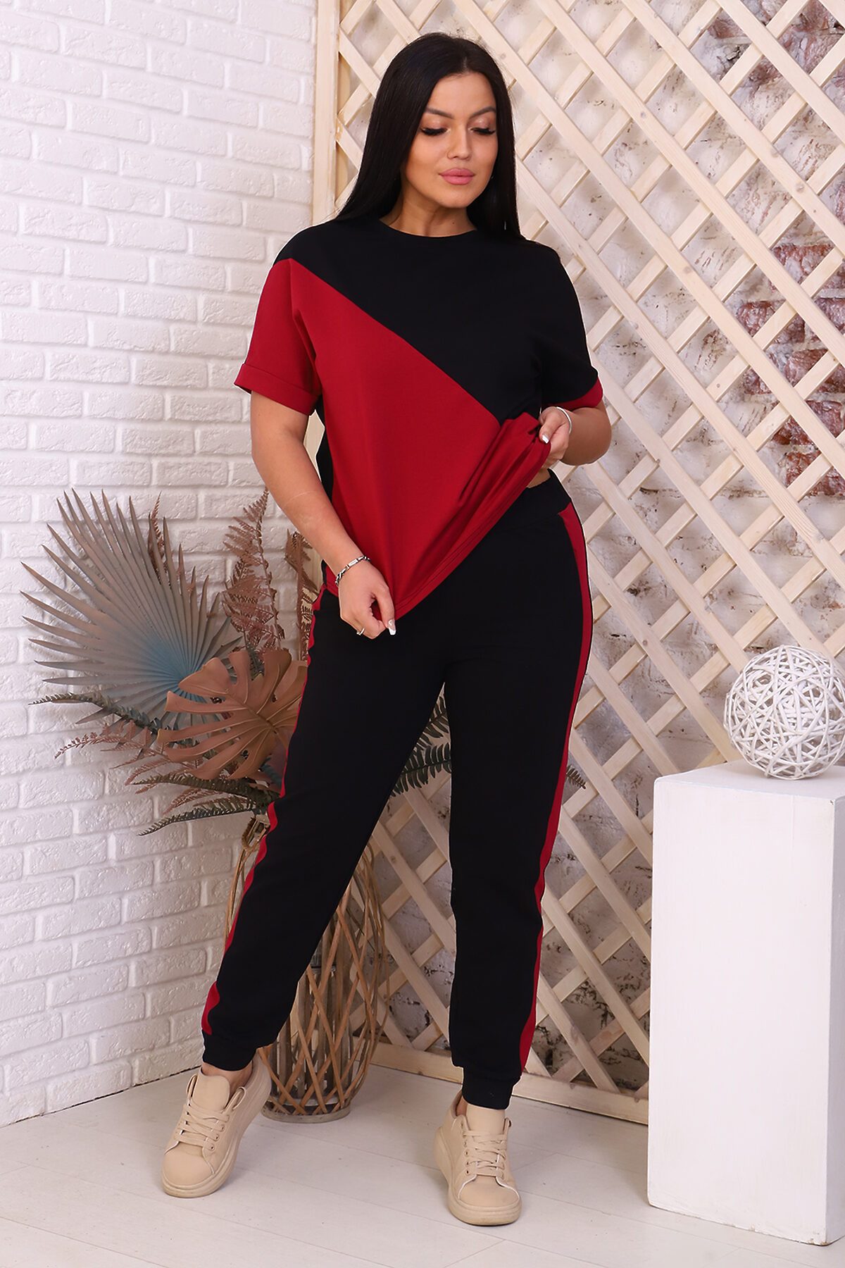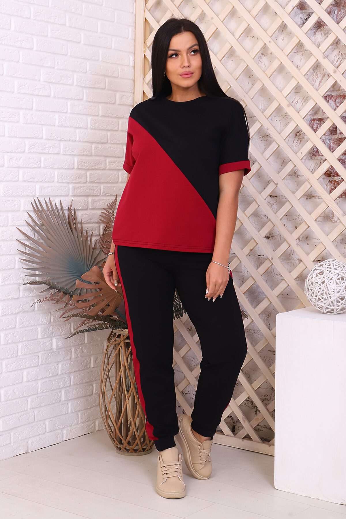 Костюм женский - туника со спущенным рукавом и контрастными вставками, свободный крой, брюки без карманов, по бокам лампасы