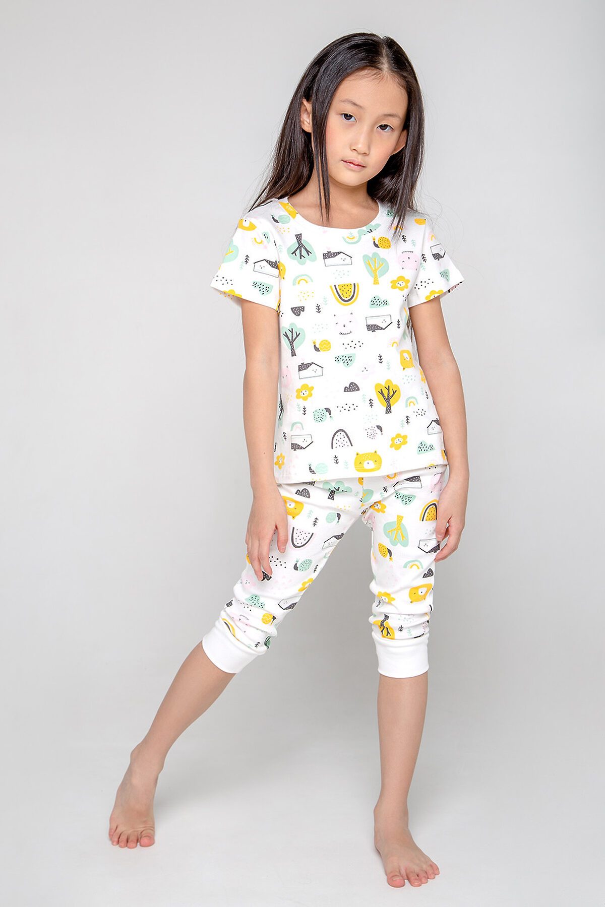 Пижама для девочки - футболка и бриджи с набивным рисунком. Сшита из мягкого трикотажа интерлок. Короткие рукава и низ футболки обработаны плоскими швами, спинка удлинена и закруглена. Бриджи с поясом на резинке, внизу - эластичные манжеты.
