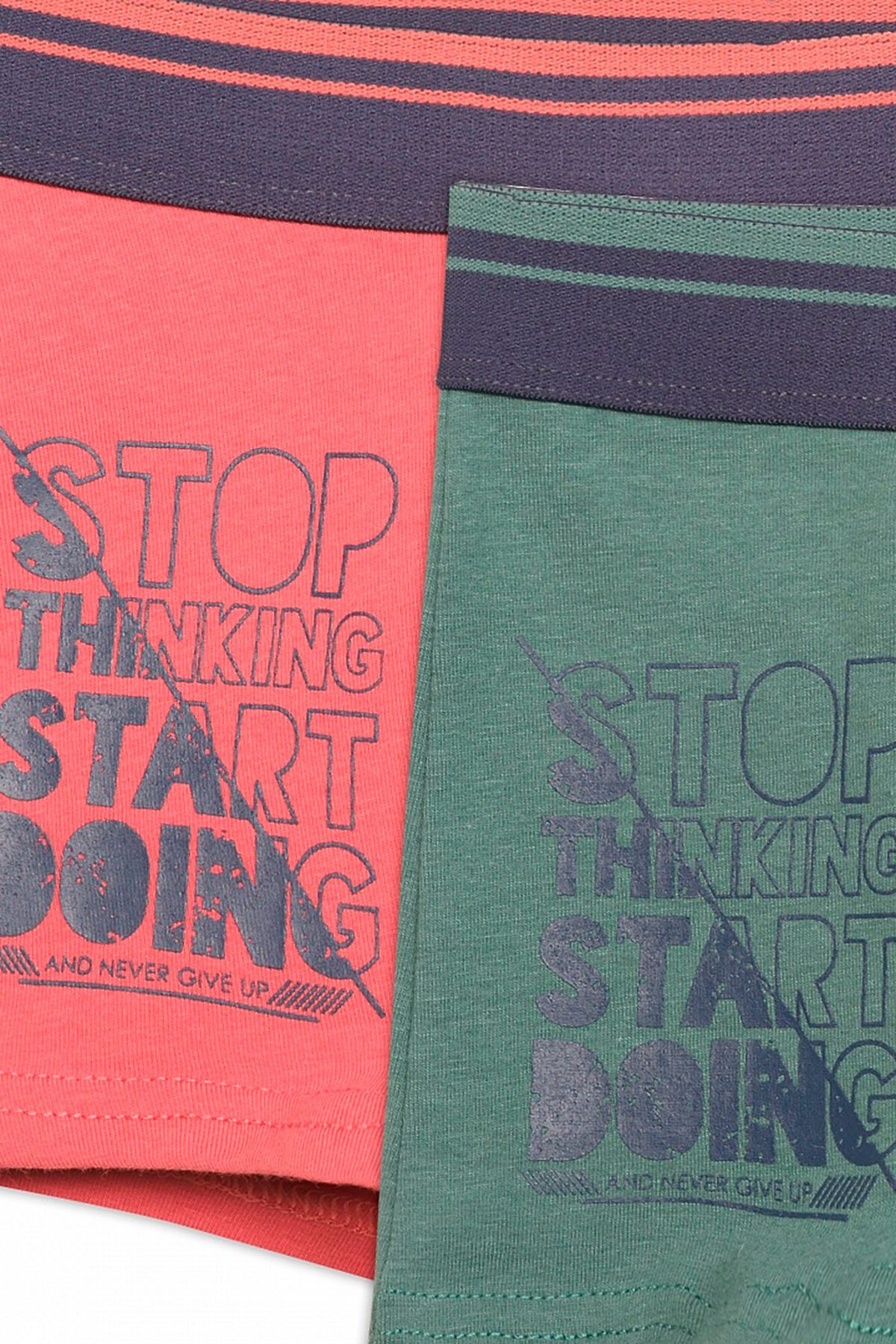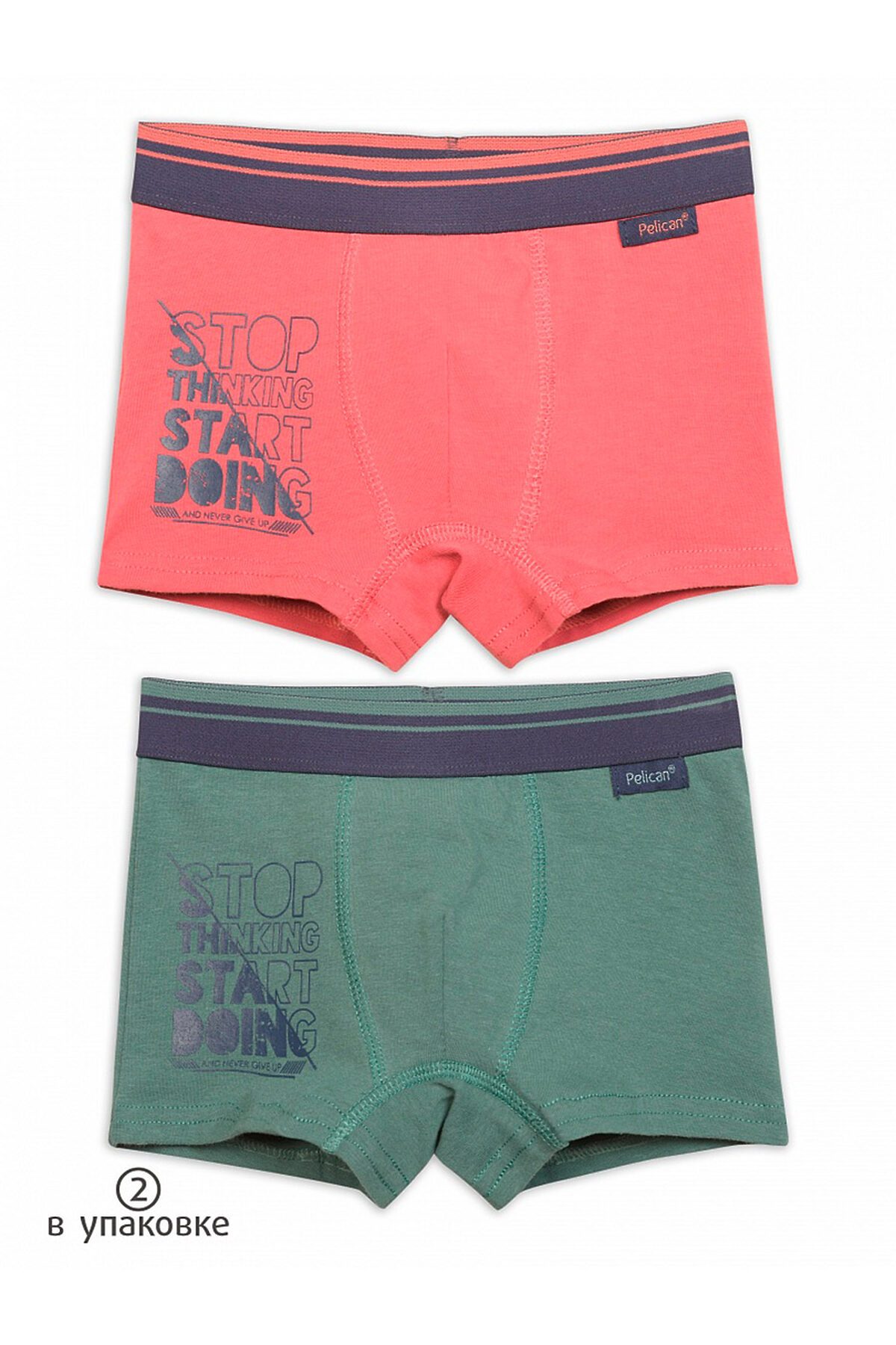Трусы шорты для мальчиков. В комплекте 2 изделия. По талии широкий тканый эластик с полосками. Декоративная обработка в области гульфика. Прочный принт. Перевод Хватит думать, начинай делать.