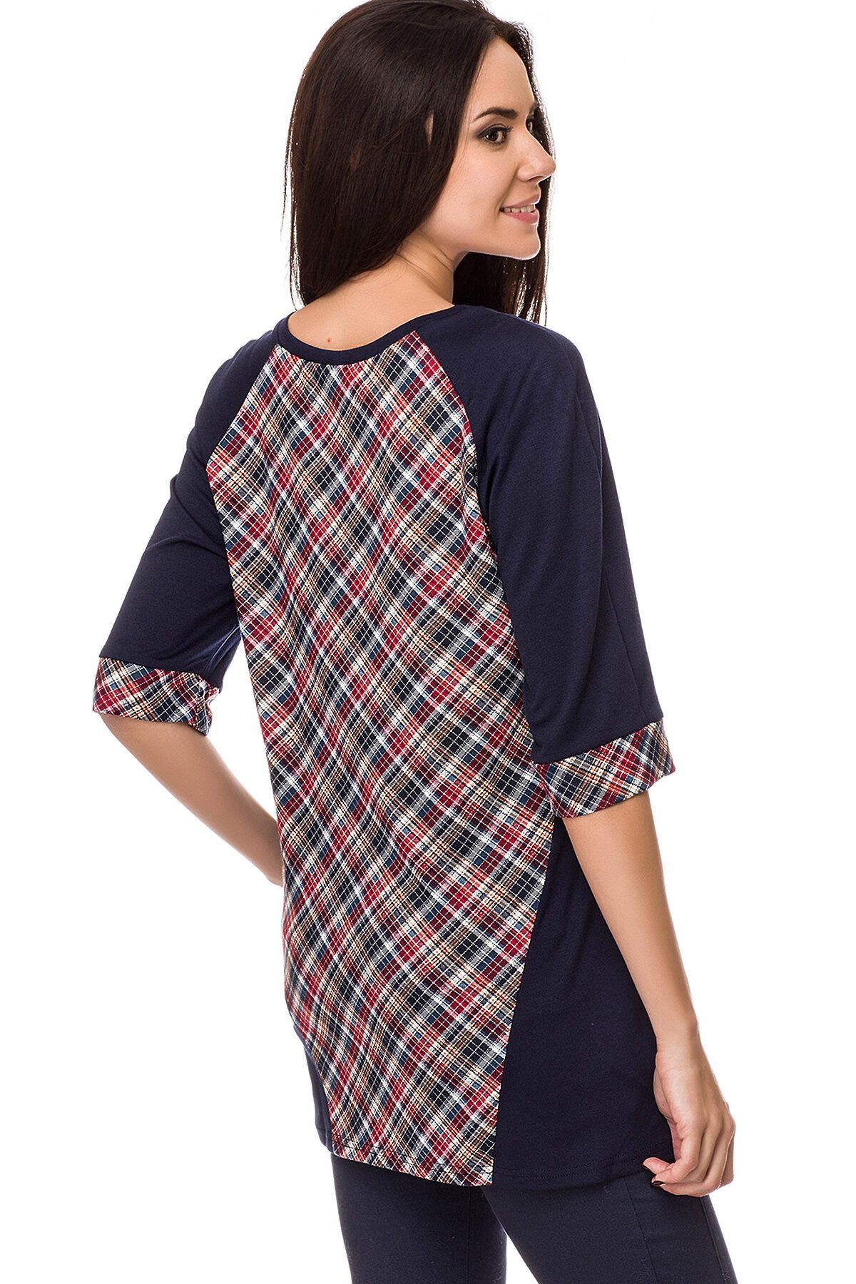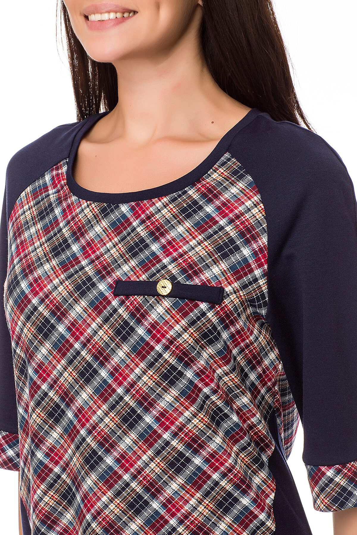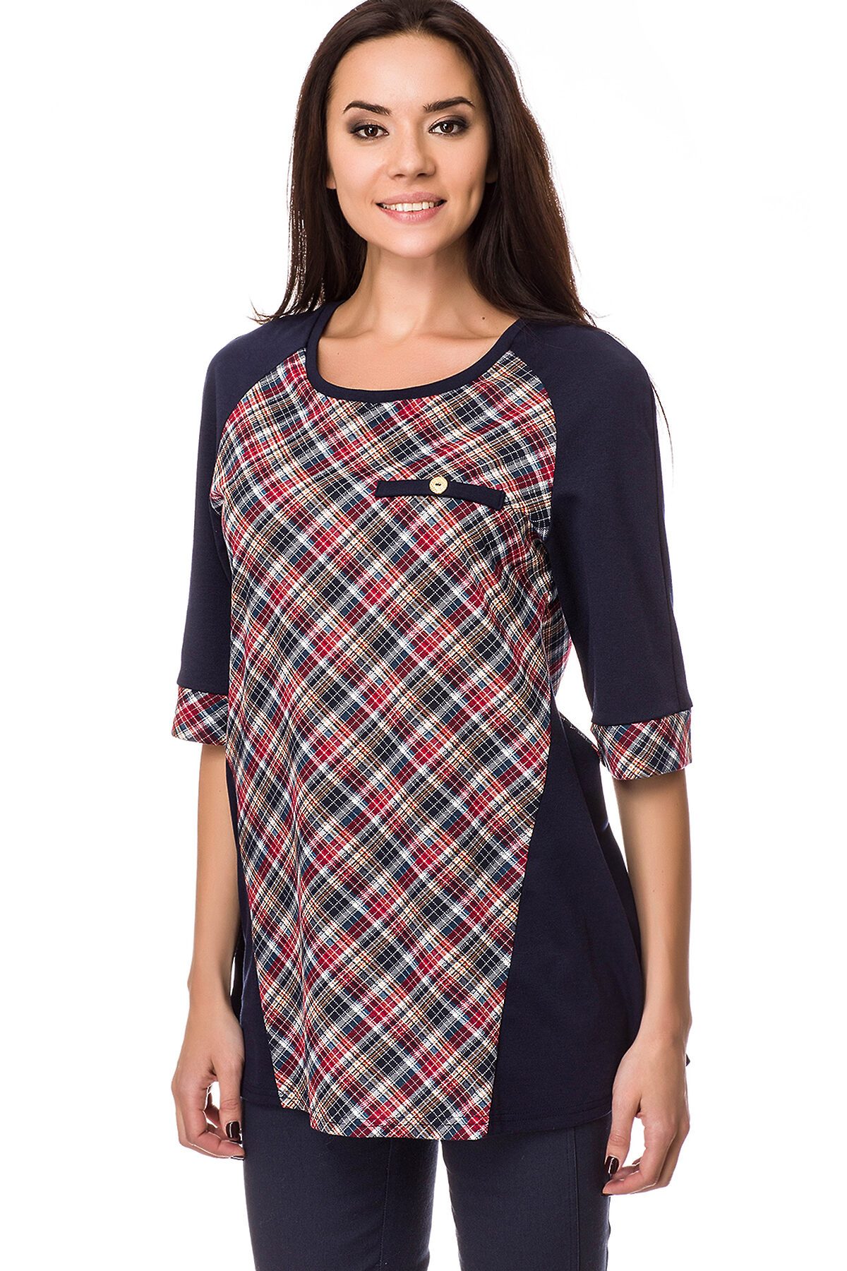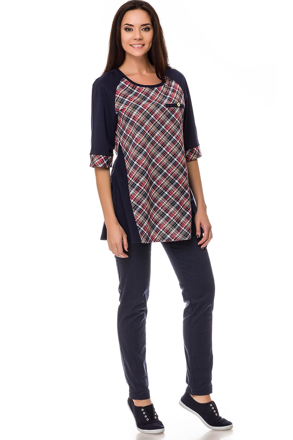 Трикотажная туника свободного кроя от бренда Амарти, выполненная из плотного трикотажного материала в сочетании однотонно синего и принта в клетку. Туника с рукавом до локтя и круглым вырезом горловины.