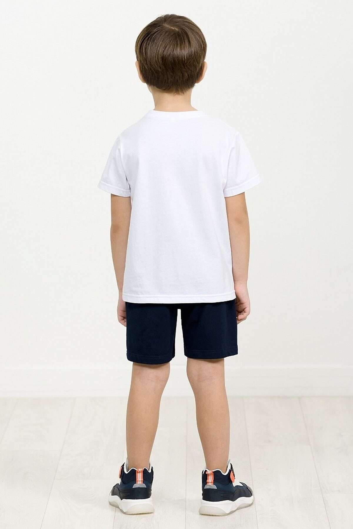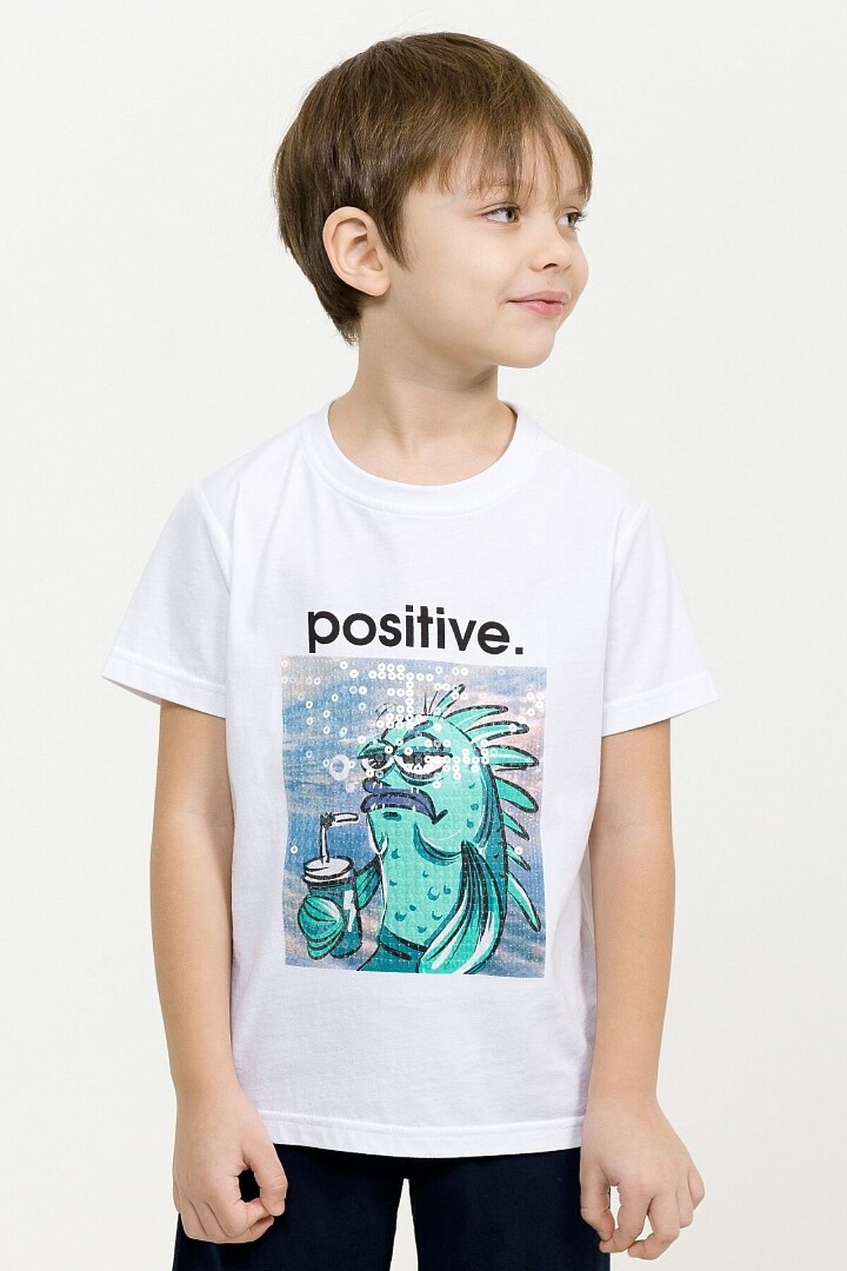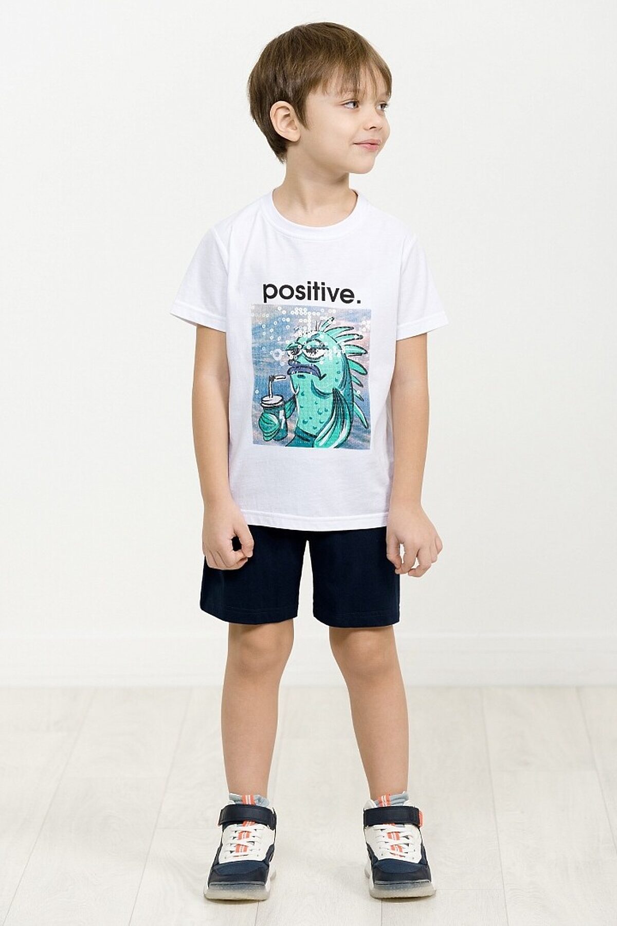 Комплект для мальчиков футболка и шорты. Футболка свободного силуэта с горловиной из рибаны. Normal принт с прозрачными пайетками. Перевод Позитив. Шорты умеренно свободной посадки с внутренней регулировкой по поясу.
