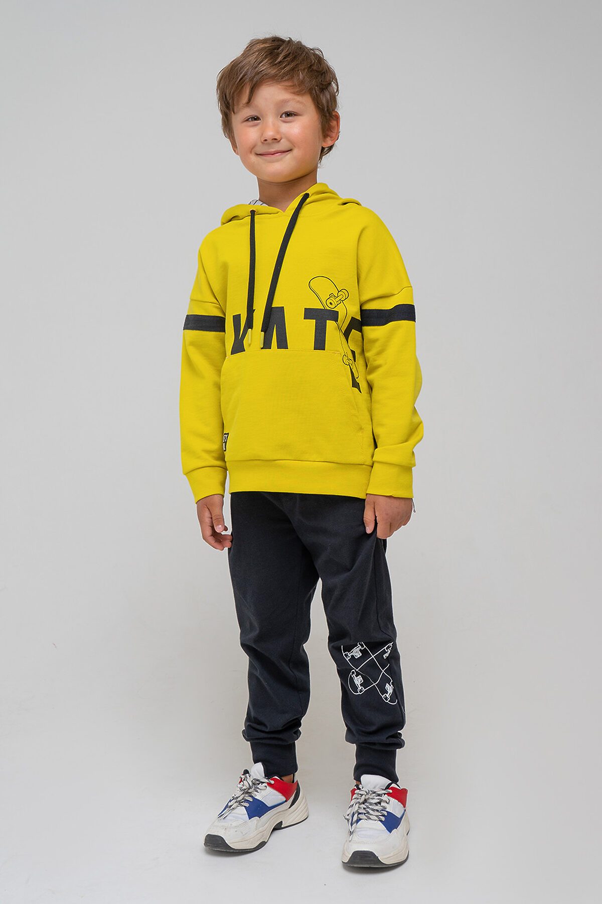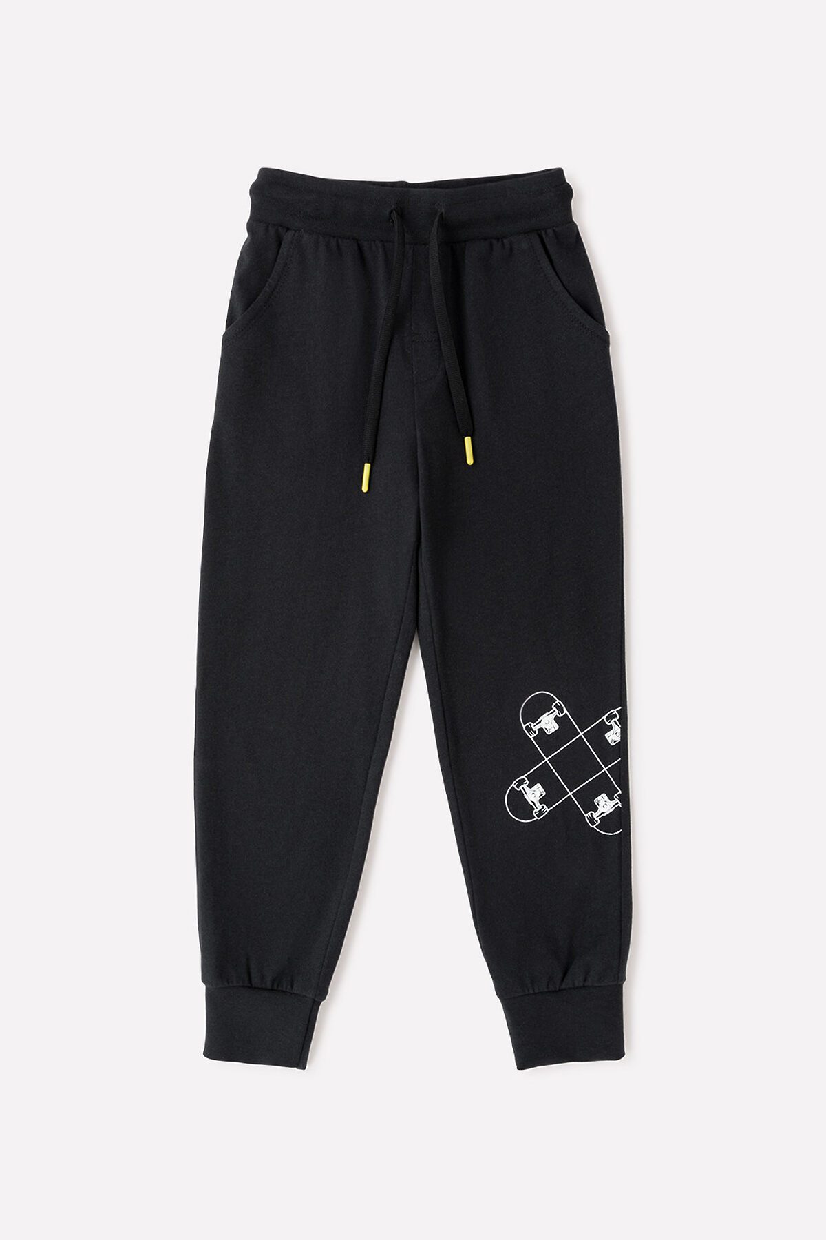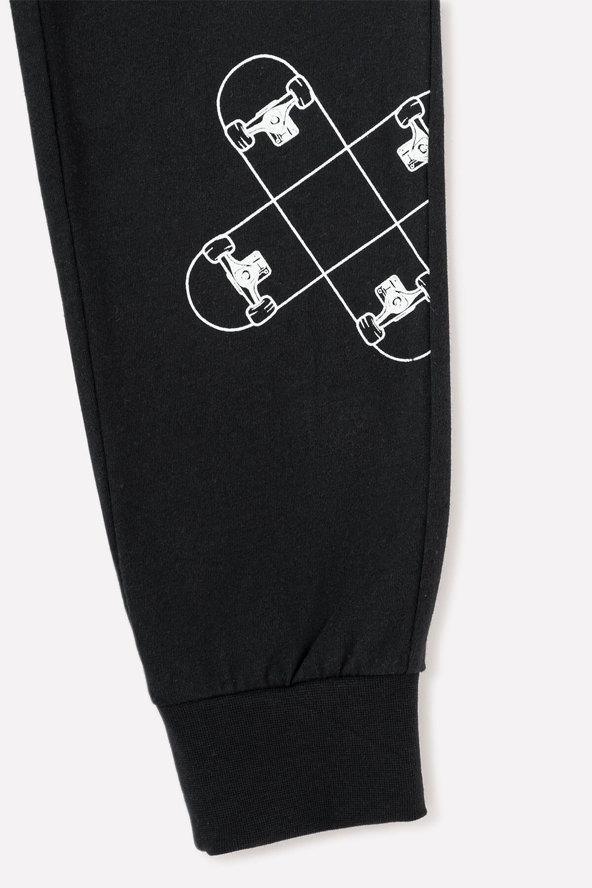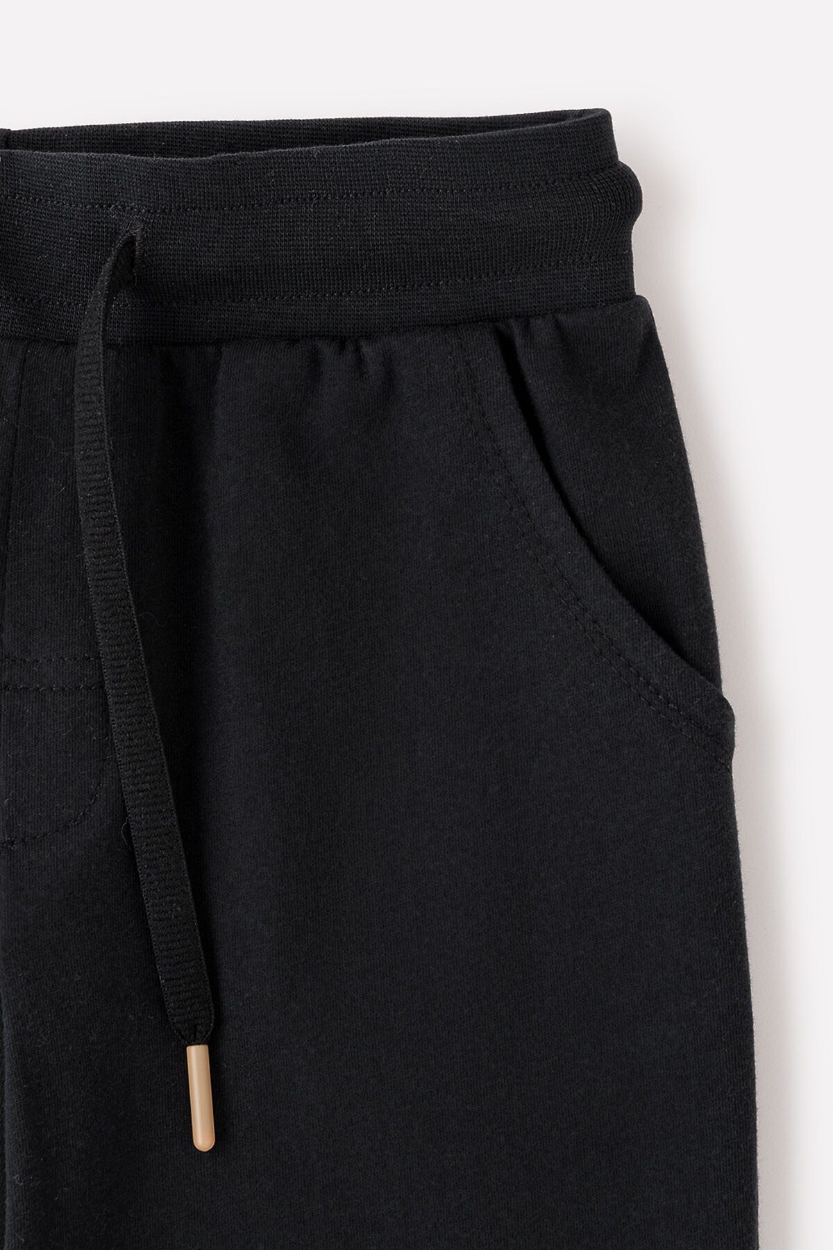 Брюки из однотонного трикотажа супрем чёрного цвета. Пояс регулируется по ширине с помощью шнурка. Украшены принтом спереди. По бокам удобные карманы. Внизу эластичные манжеты.