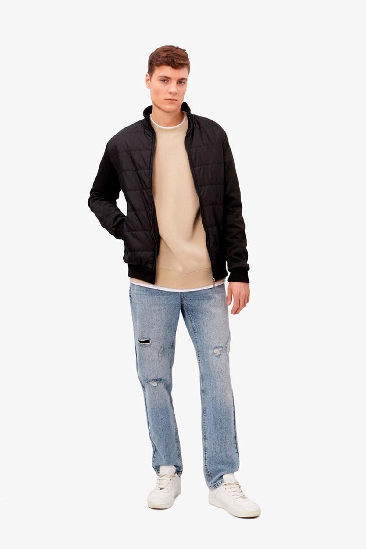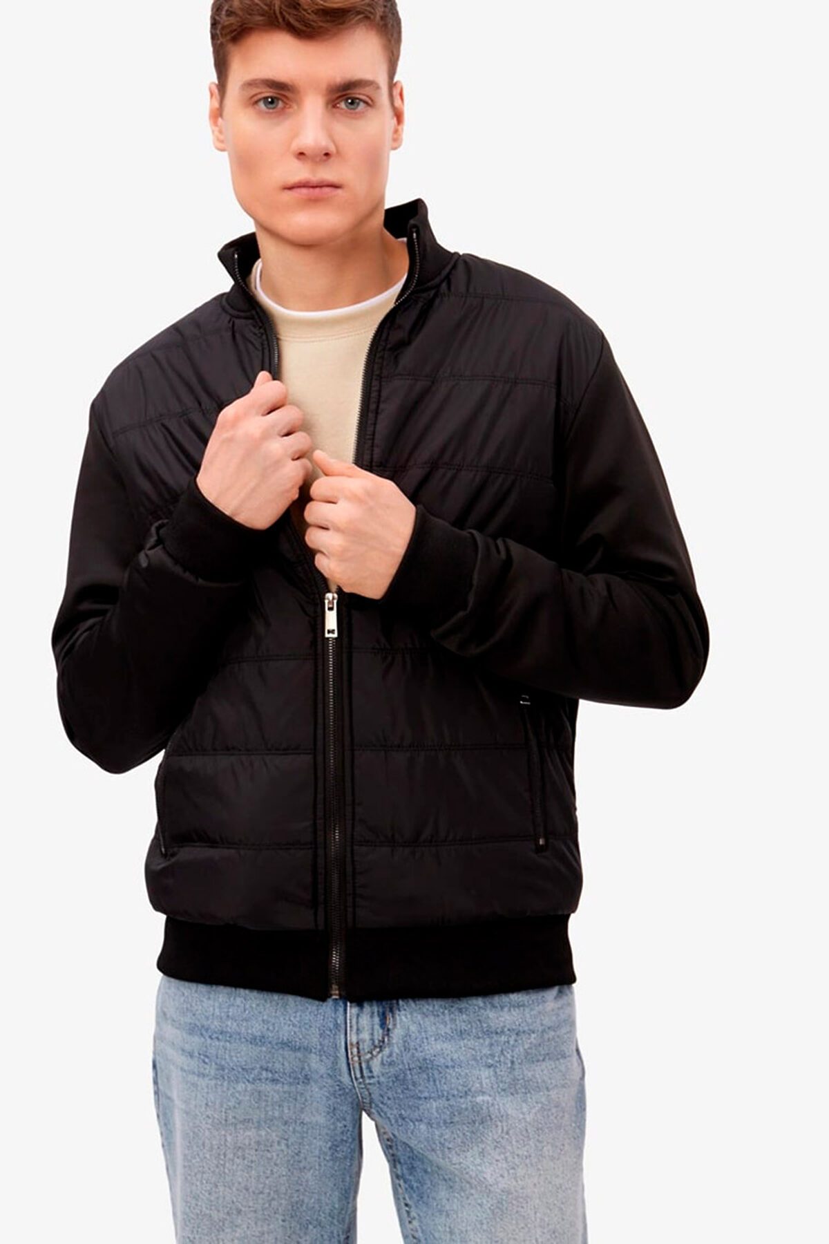 Демисезонная стеганая мужская крутка MODIS на среднем синтепоне. Модель свободного кроя, застежка на молнию по всей длине изделия, воротник-стойка, прорезные боковые карманы. Куртка сочетается с джинсами и брюками, подходит для повседневного стиля.
