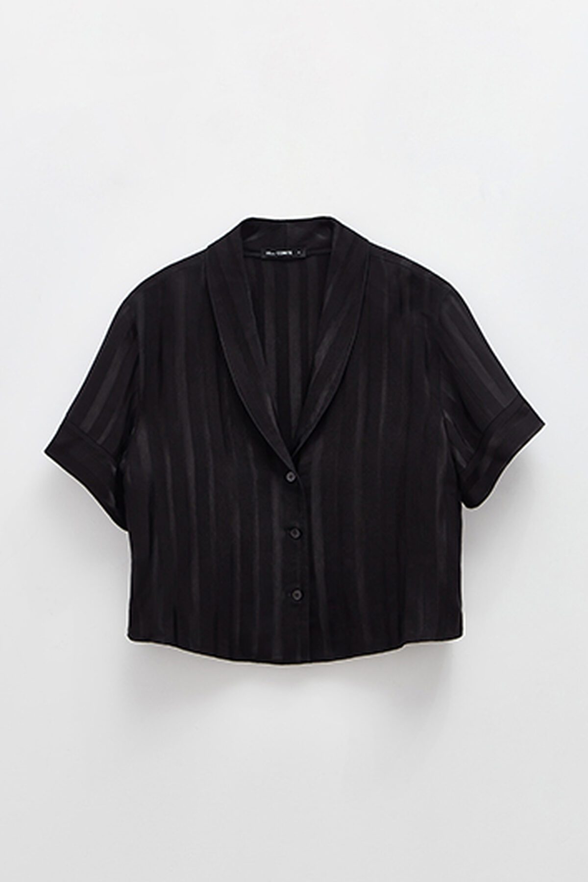 Укороченная домашняя блуза с атласными полосами LHW 1707 – эффектный и при этом комфортный вариант для стильного домашнего гардероба. SILK TOUCH VISCOSE: премиальная вискоза с эффектом «ощущение шелка» подарит мягкость и комфорт на протяжении всего дня. · V-образный вырез горловины · отложной воротник · короткие втачные рукава с манжетой по низу · центральная застежка на петли и пуговицы · умеренно свободный крой · укороченная модель · вискоза премиального качества · полотно с атласными вертикальными полосами · сохранение формы и цвета при соблюдении рекомендаций по уходу · эффектный и комфортный вариант для стильного домашнего гардероба.