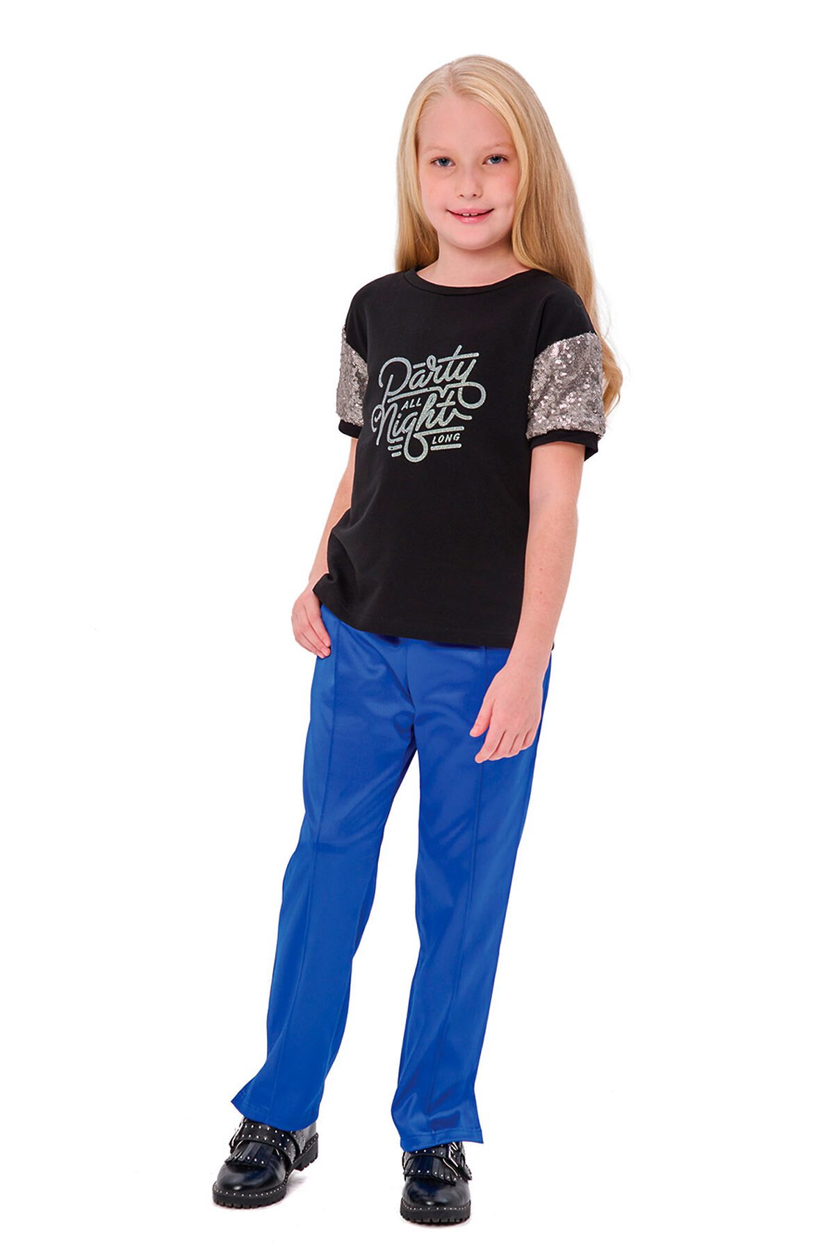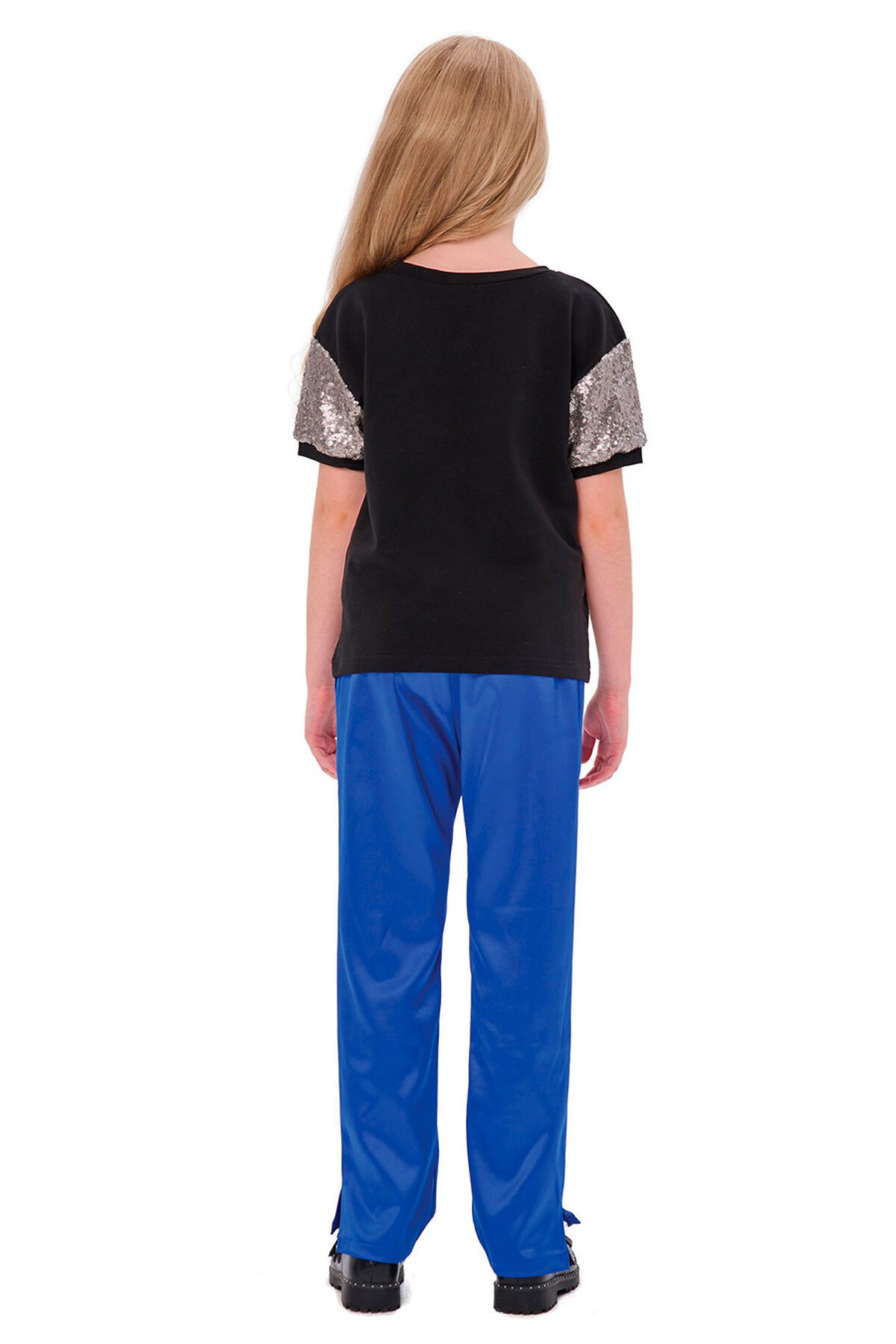 Джемпер из плотного трикотажа с короткими рукавами из двухсторонних пайеток с притачными манжетами, к горловине притачивается бейка, на полочке принт.