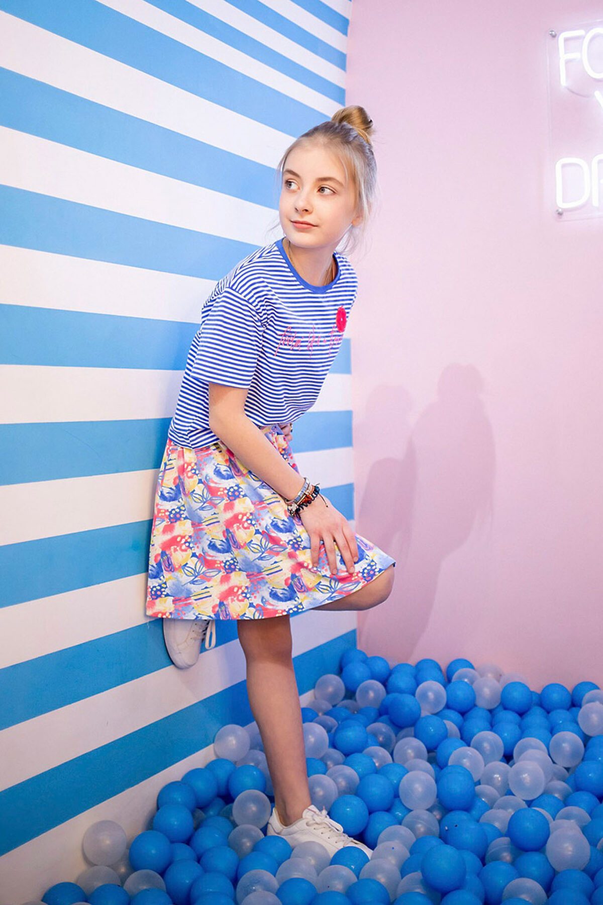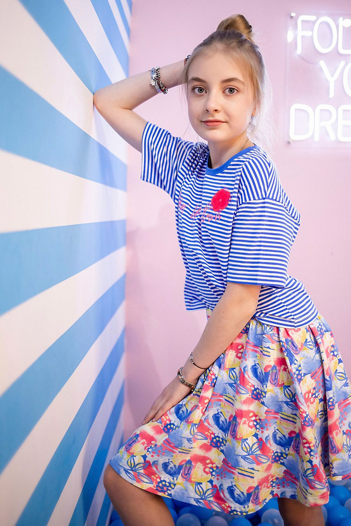 Комплект для девочки, состоящий из футболки и юбки, выполнен из ткани супрем пенье.