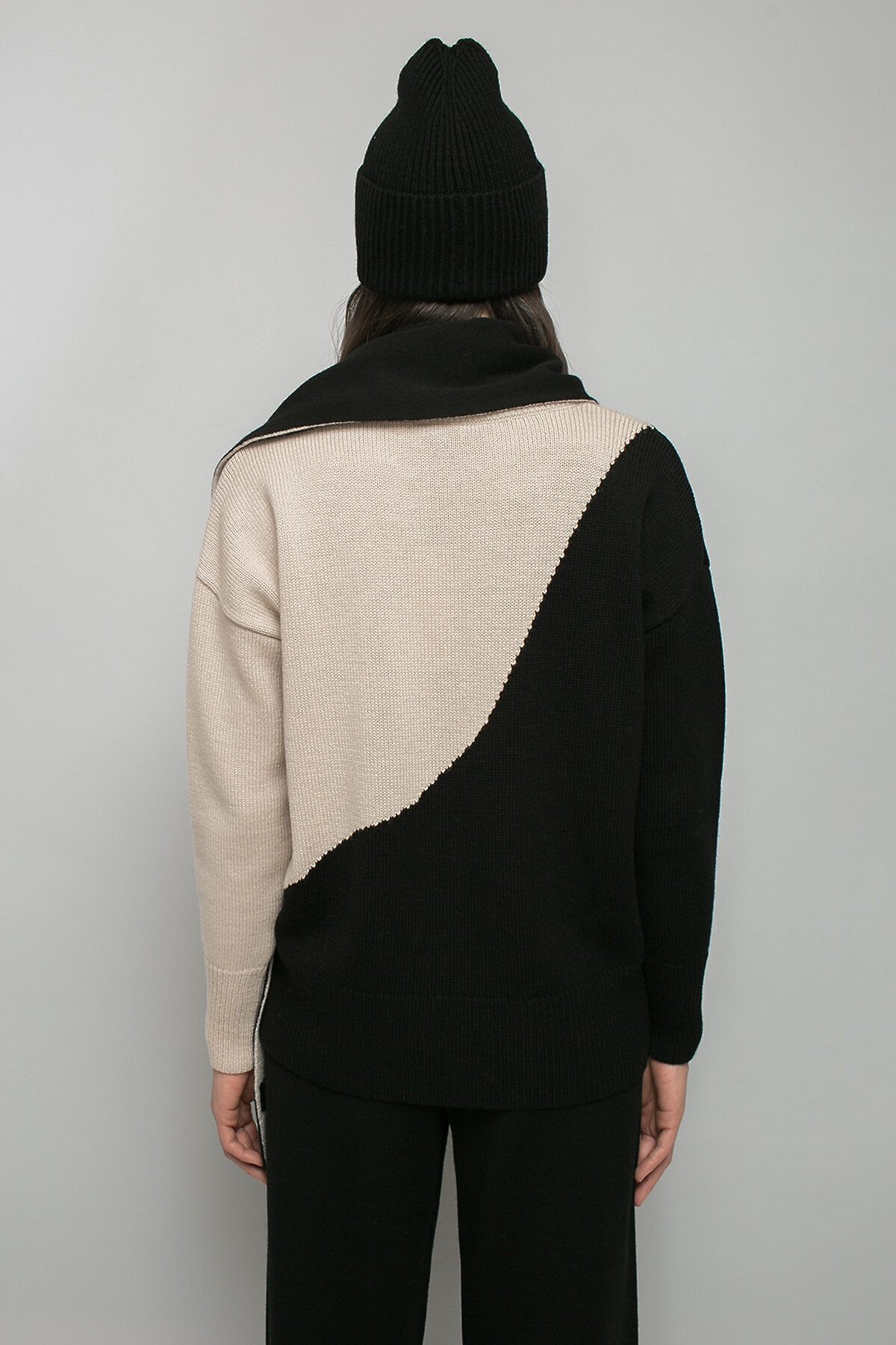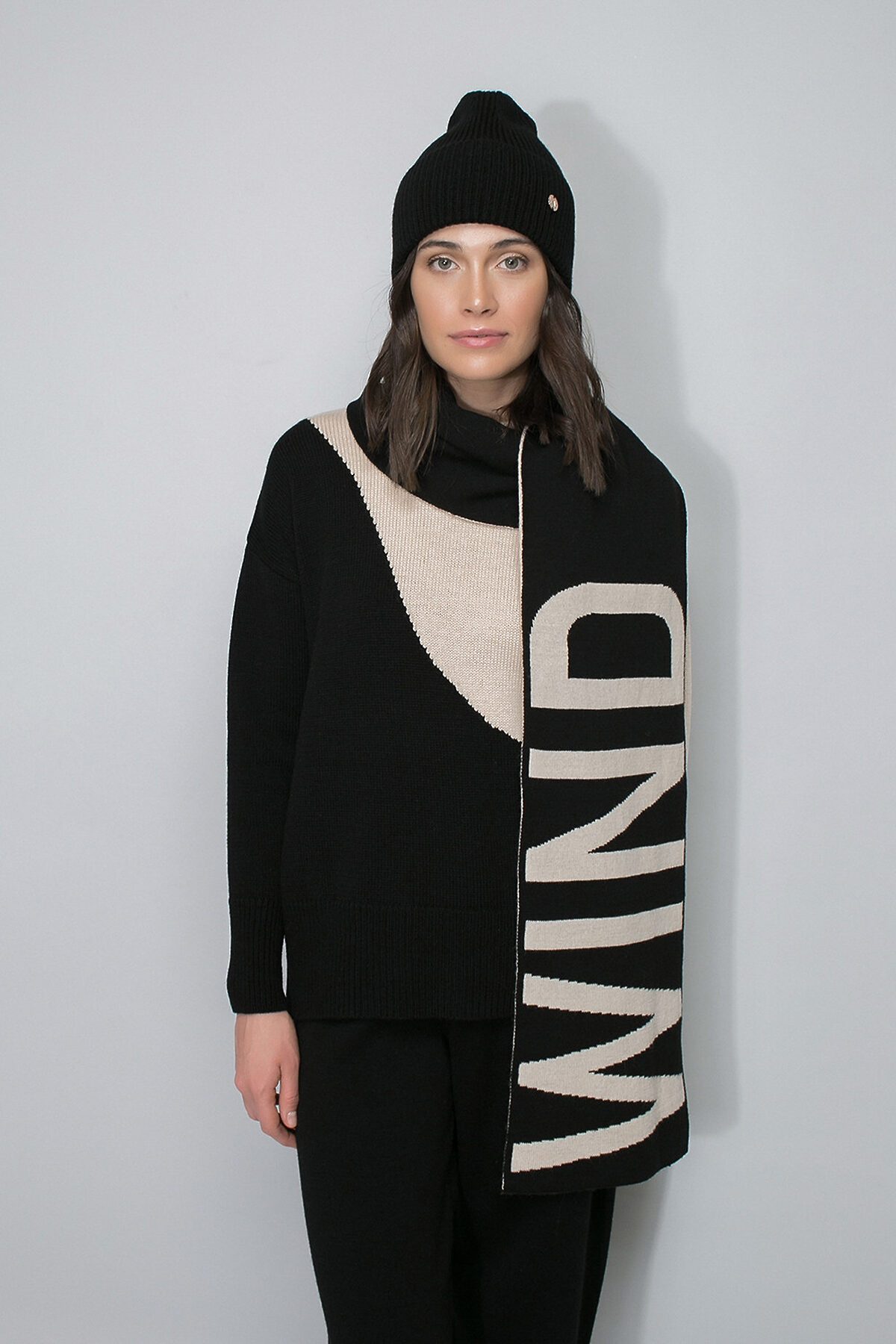 Двусторонний шарф из полушерсти с вывязанным рисунком в виде надписи WIND. Длина - 200 см, ширина - 40 см. Связан гладью. Украшен фирменной этикеткой на внутренней стороне.