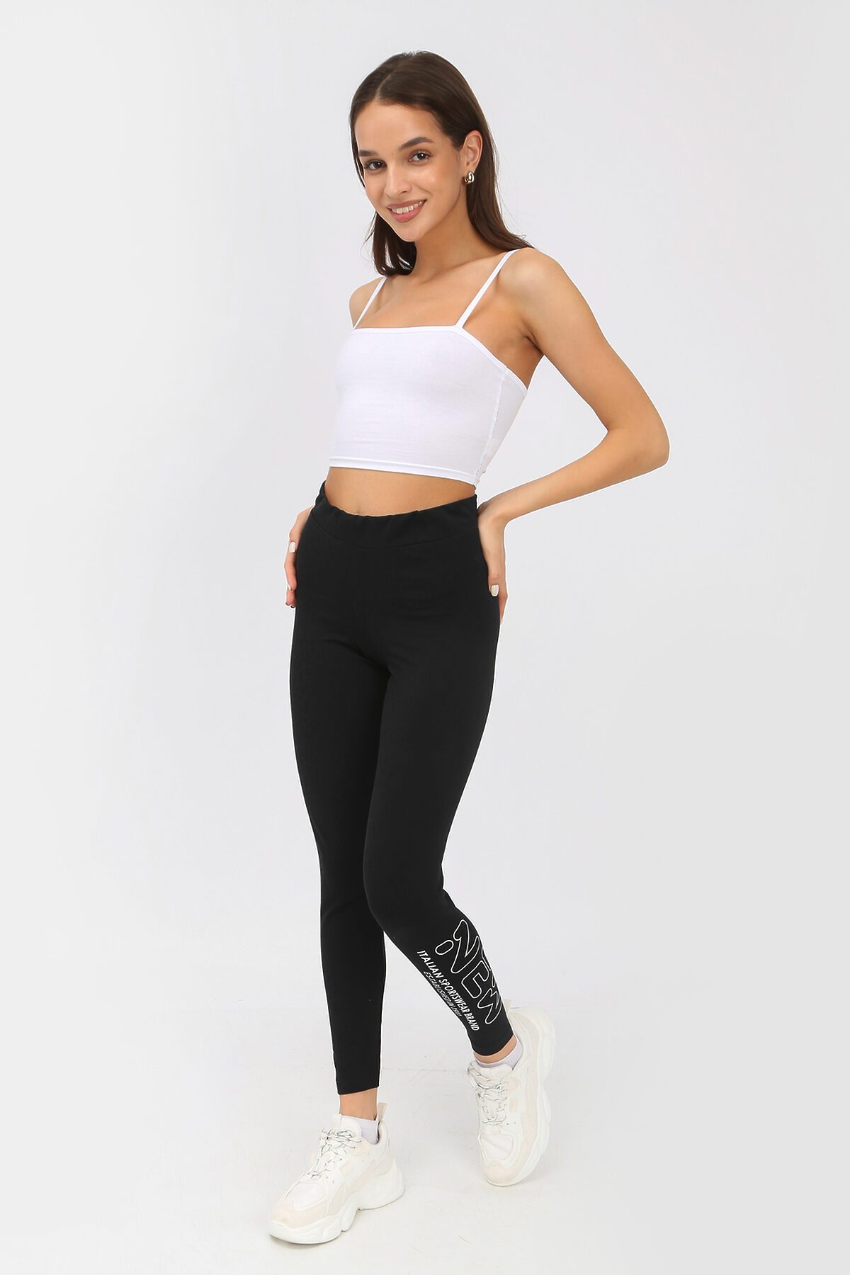 Модные женские лосины из кулирки с лайкрой. Украшены по одному боку наклейкой, нанесенной при высокой температуре. Подойдут для прогулок и для занятий спортом.