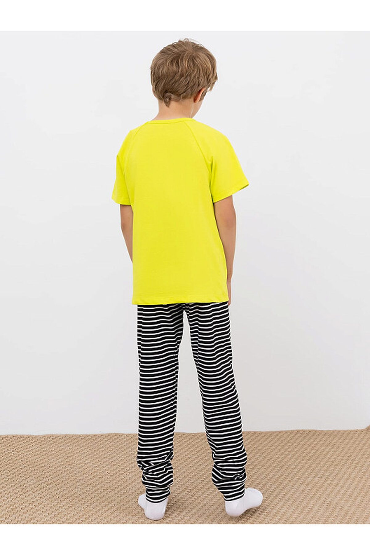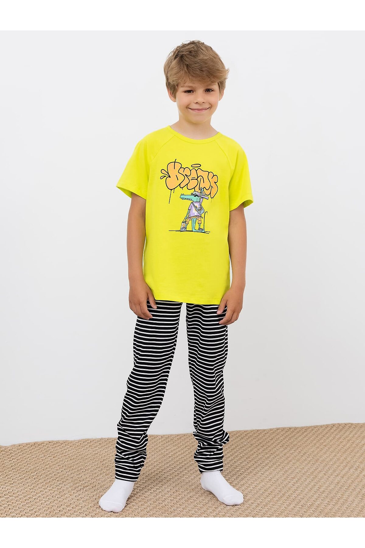 Комфортная пижама для мальчиков. Выполнена из хлопковой трикотажной кулирки. Комплект состоит из футболки с короткими рукавами и длинных брюк. Пояс с резинкой внутри. По низу брюк – манжеты из основного полотна. Удобный комплект для приятных снов!