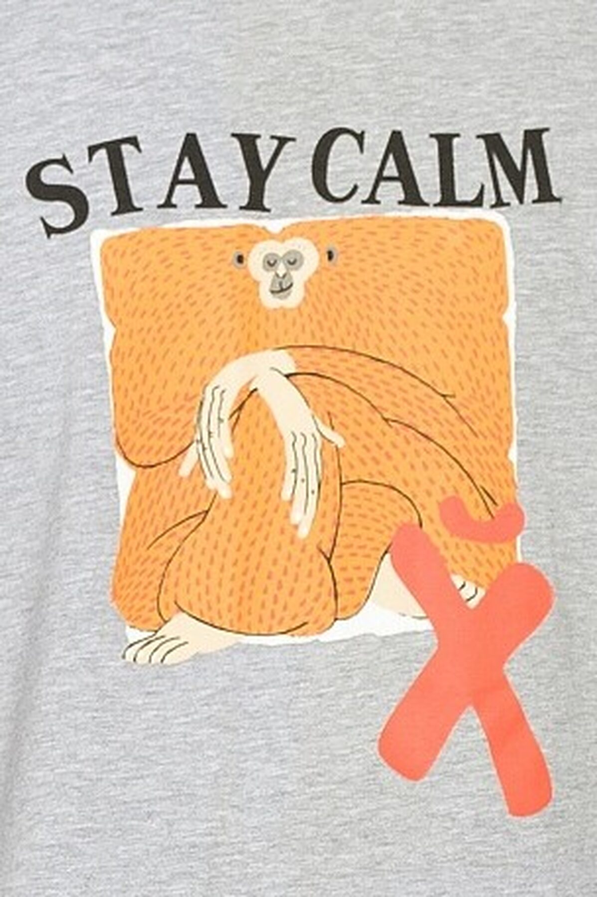 Комплект мужской: футболка и брюки. Рост 176 см. Футболка свободного объема из классического серого меланжа. Стойкий эластичный принт. Перевод: Будь спокойным. В меру свободные брюки из футера с манжетами снизу и карманами в боковых швах. Пояс на комфортной резинке с регулировкой шнурком. Стойкий эластичный шифтовой all-over принт.