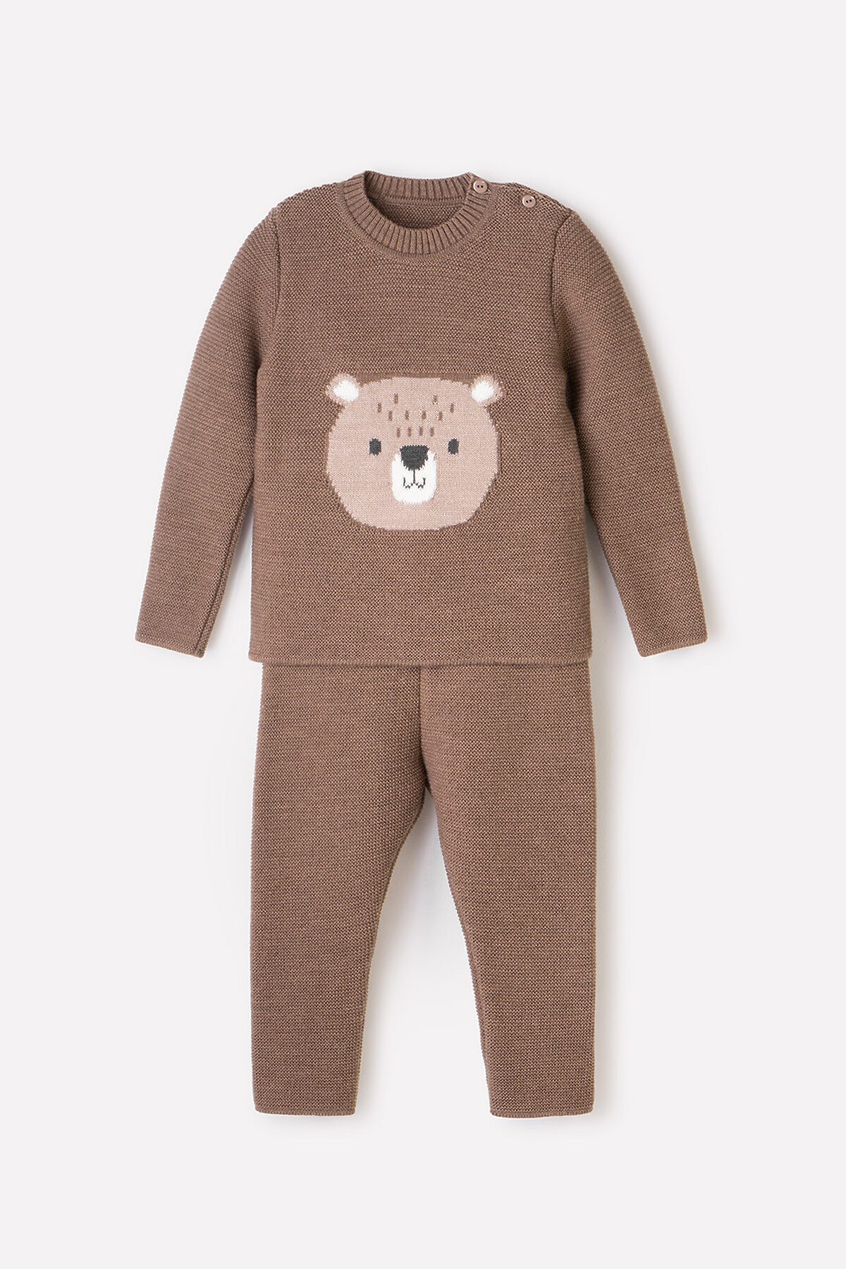 Тёплый вязаный комплект из полушерсти для мальчика - джемпер и брюки. Связан двухизнаночной гладью. Украшен на полочке вывязанным рисунком с изображением мордочки медвежонка. Для удобства одевания застёгивается на плече на пуговицы. Брюки с поясом на резинке.